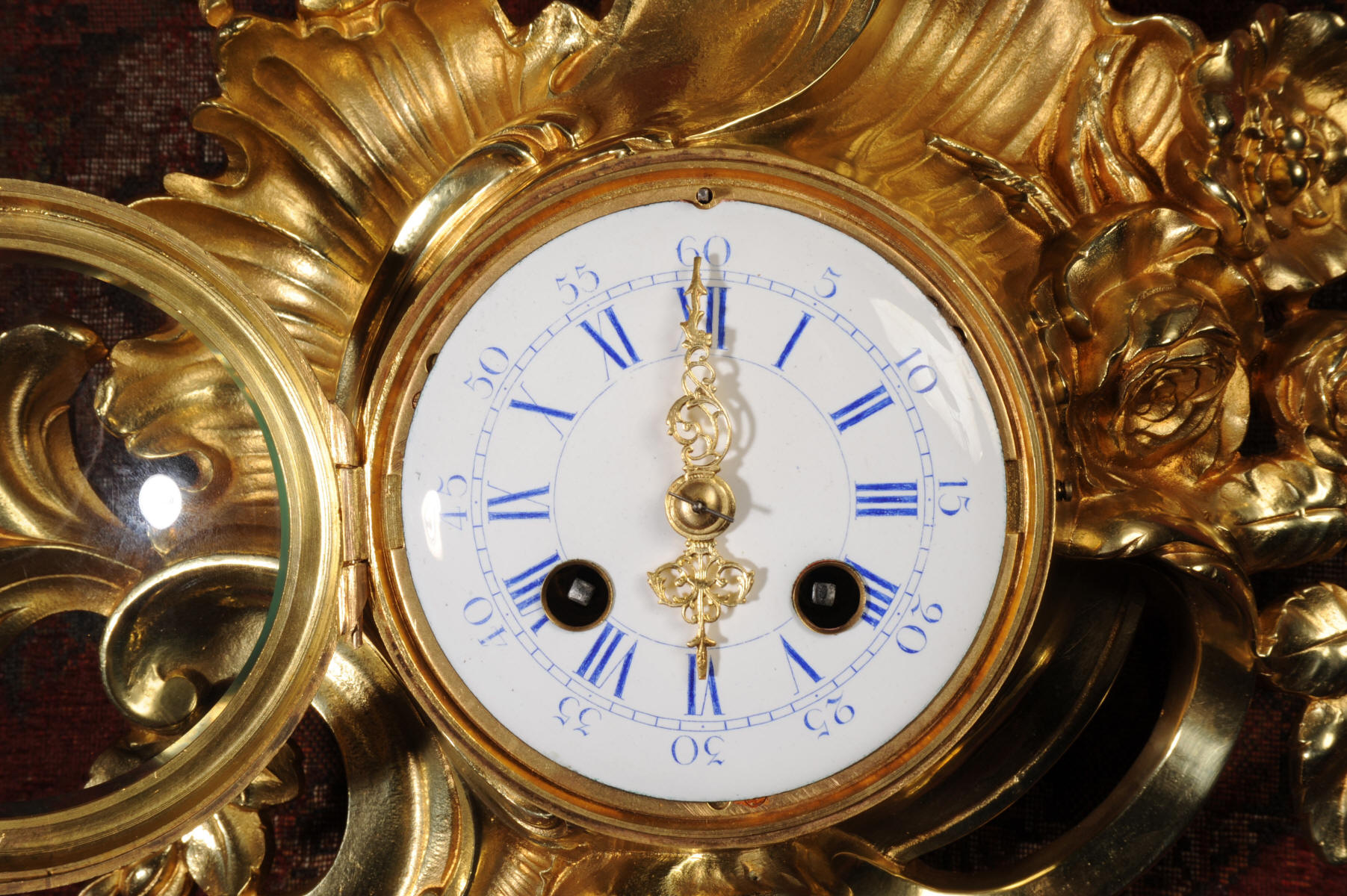 The dial is enamel on copper with blue hour lettering and a separate minute ring. It is complete with original finely fretted, gilt brass hands and convex glass.