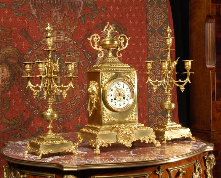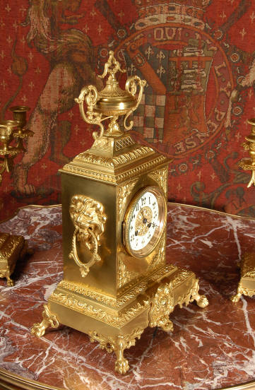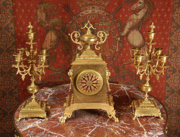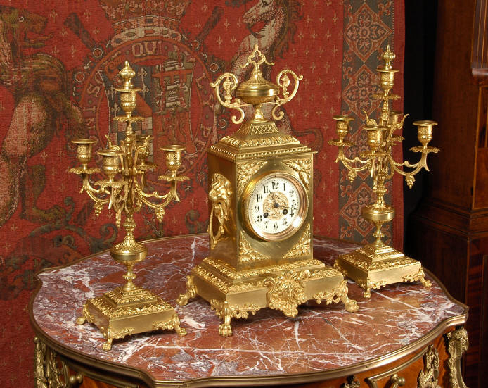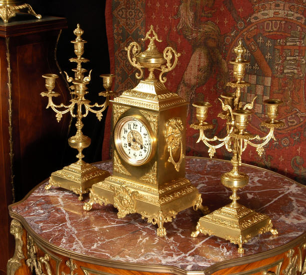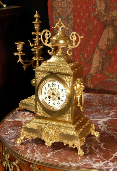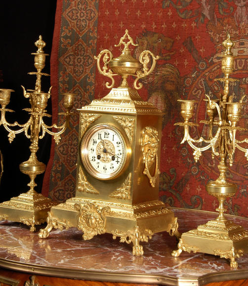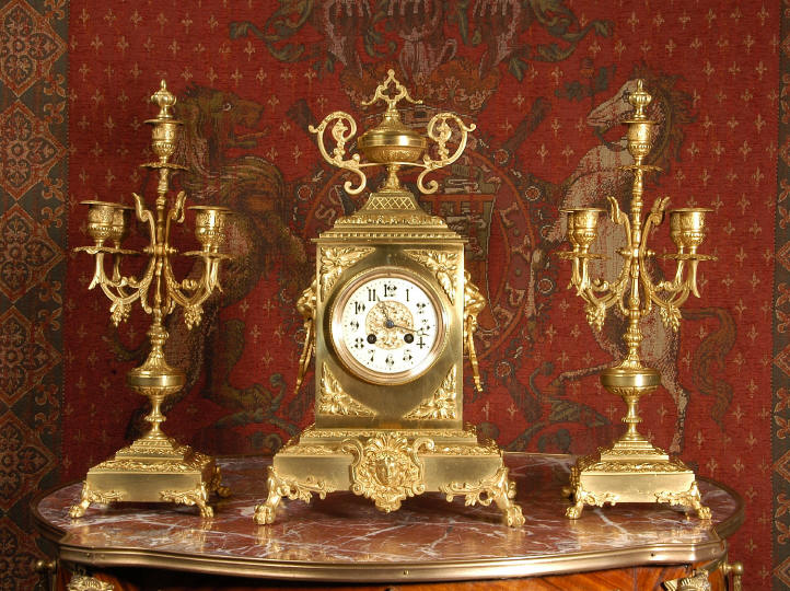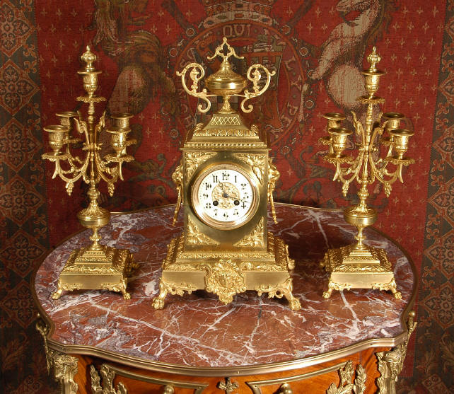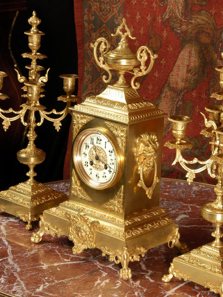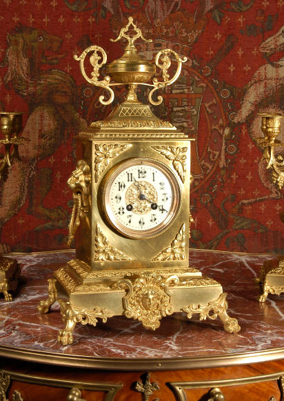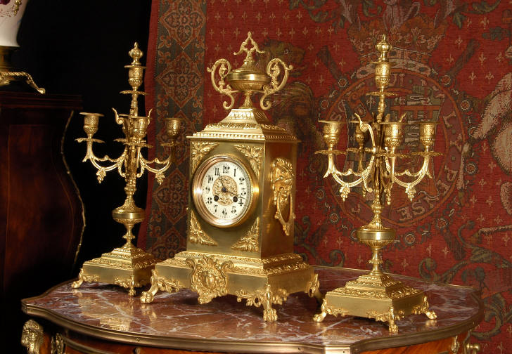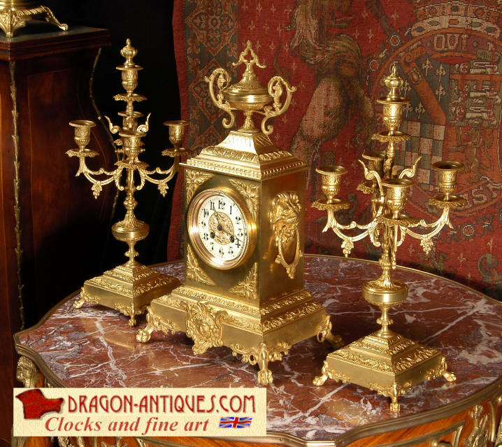 ~ French - Circa 1890 ~ ~~ Excellent condition ~~ An excellent antique French Gothic clock set by the famous maker Samuel Marti. It is made of brass with lions masks handles, goddess mask to the front and hairy paw feet. Candelabra are similarly styled, with 5 light candelabra are have the original snuffers. The dial is enamel on copper with a finely fretted brass centre and is complete with original blued steel hands. The Samuel Marti French movement is of the highest quality and is in excellent clean and running condition having been fully serviced by our clockmaker. Pendulum is original. It runs for 8 days and strikes the hours and halves on a bell. Click the movie below to hear the bell and watch the clock running! Condition of the case is