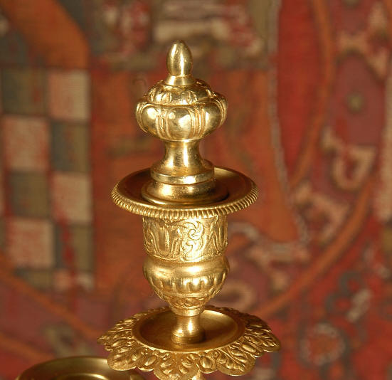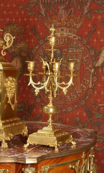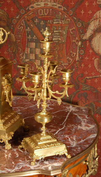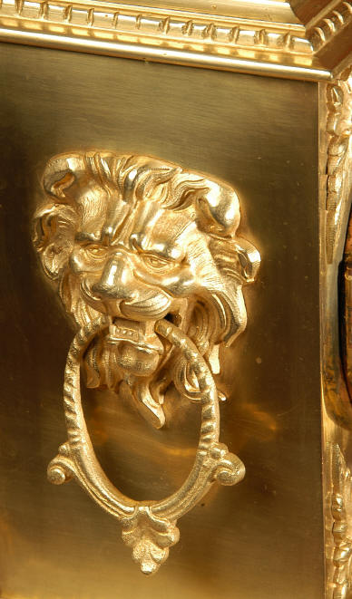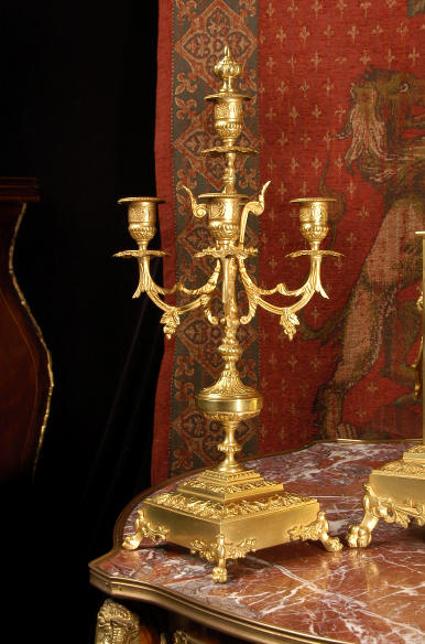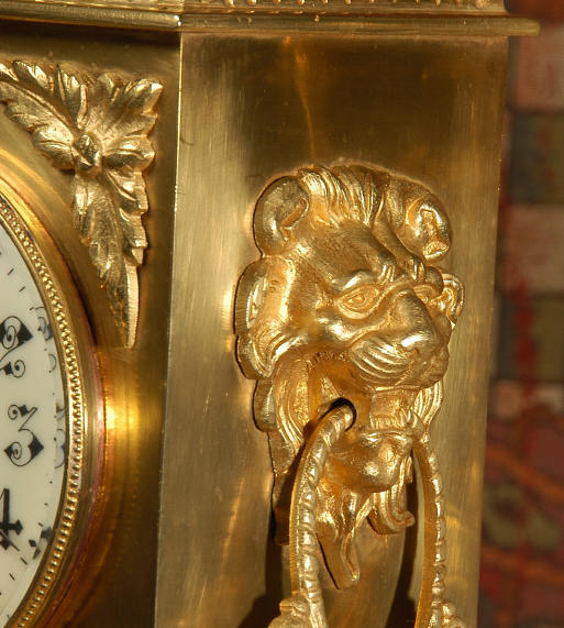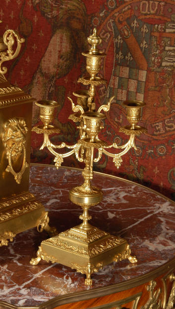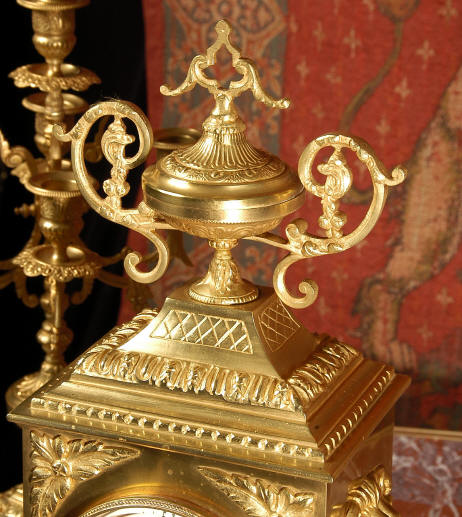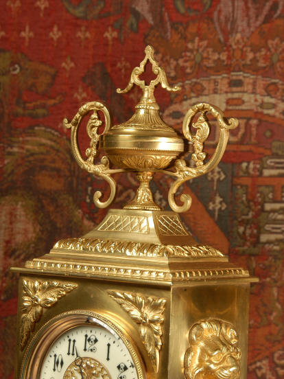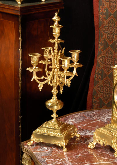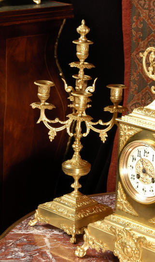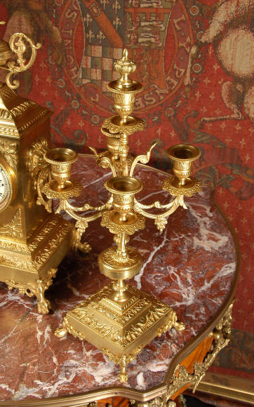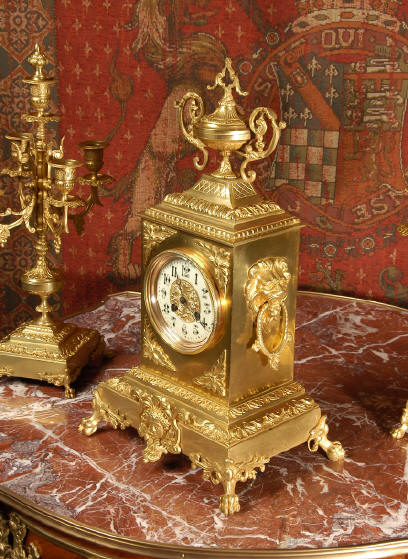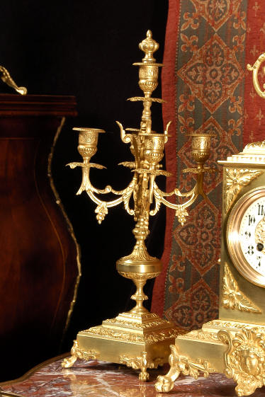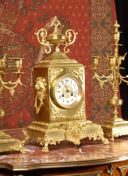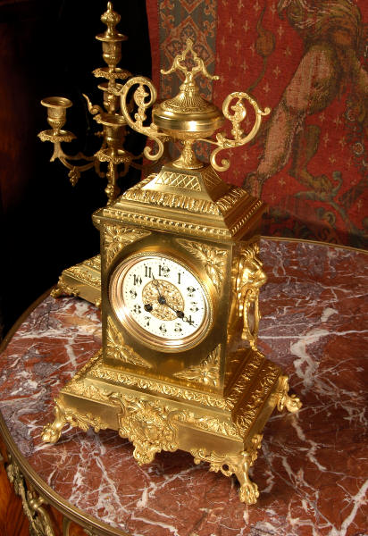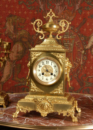 ~ French - Circa 1890 ~ ~~ Excellent condition ~~ An excellent antique French Gothic clock set by the famous maker Samuel Marti. It is made of brass with lions masks handles, goddess mask to the front and hairy paw feet. Candelabra are similarly styled, with 5 light candelabra are have the original snuffers. The dial is enamel on copper with a finely fretted brass centre and is complete with original blued steel hands. The Samuel Marti French movement is of the highest quality and is in excellent clean and running condition having been fully serviced by our clockmaker. Pendulum is original. It runs for 8 days and strikes the hours and halves on a bell. Click the movie below to hear the bell and watch the clock running! Condition of the case is