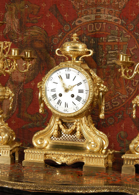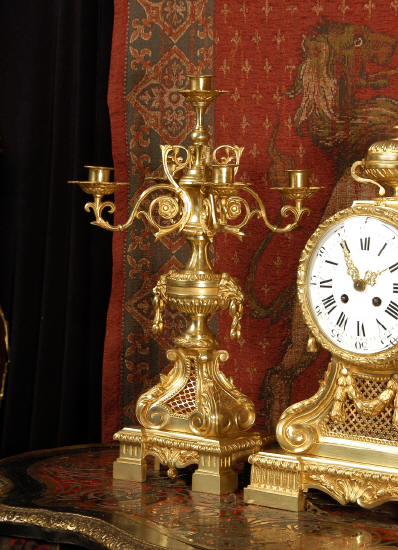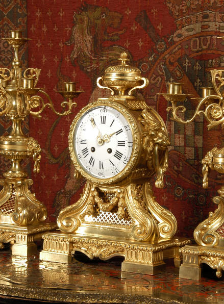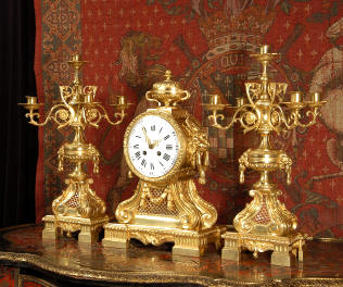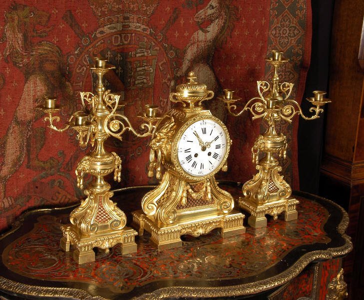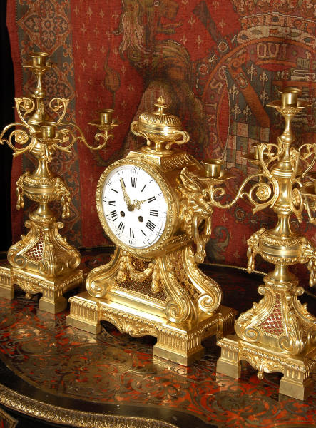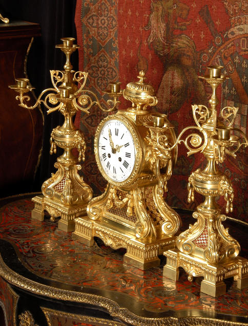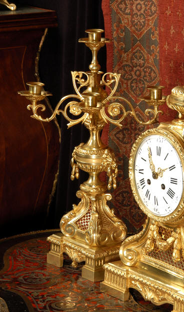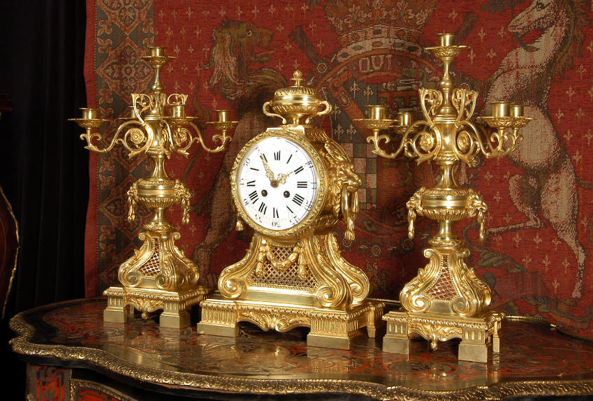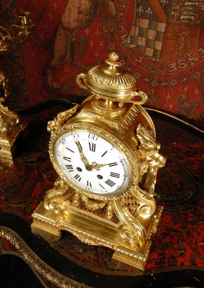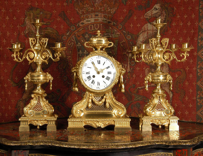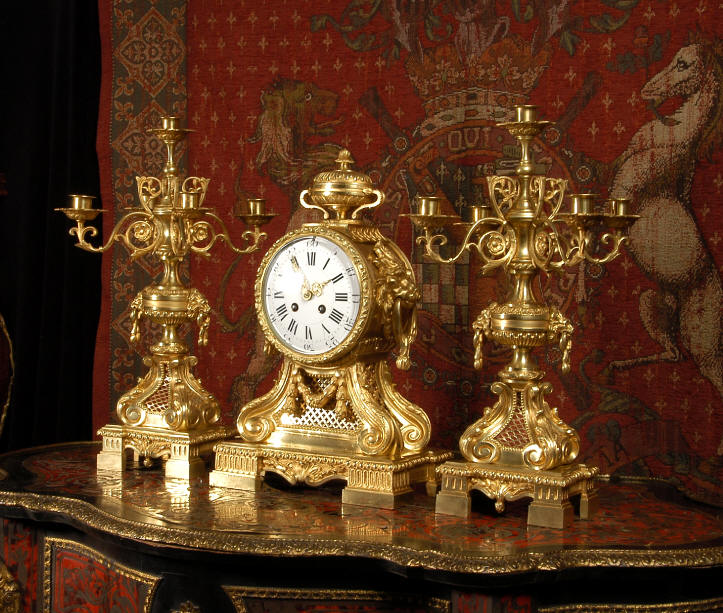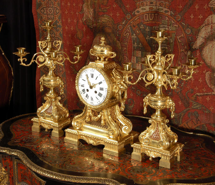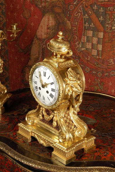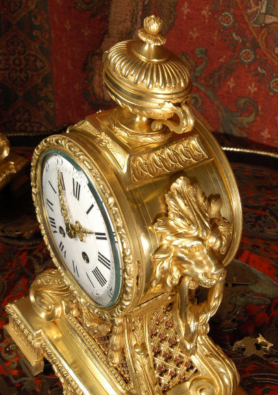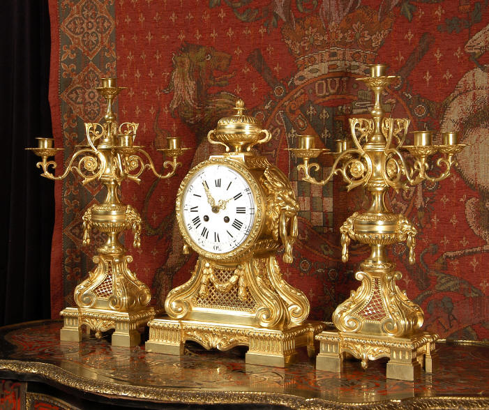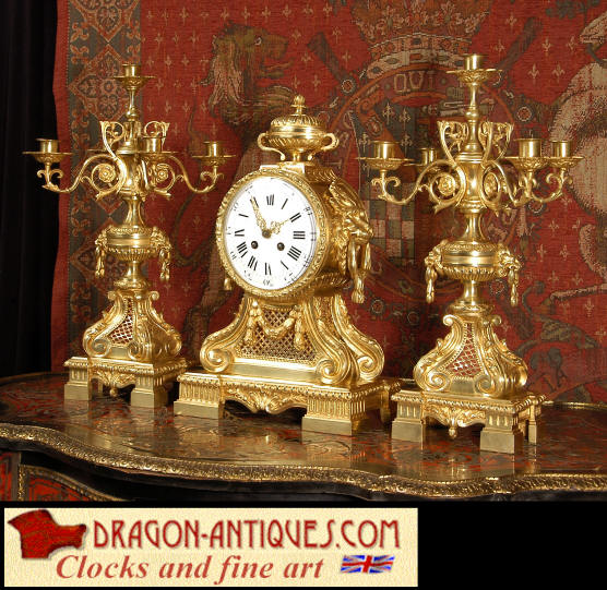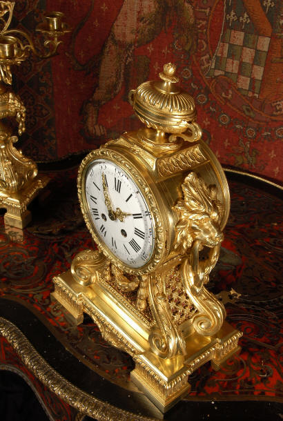 ~ French - Circa 1890 ~ ~~ Excellent condition ~~ A stunning classical clock set of large and impressive proportions. The clock itself is of 'drum head' shape with a particularly large enamel dial mounted on a waisted support of bold acanthus scrolls. These are mounted on a heavy, square base. A classical handled urn is mounted on the top of the case and to the sides are lions masks with laurel swag ring handles. Fretted panels are backed with red velvet. Candelabra are similarly designed and mounted with 5 light candelabra. The dial is enamel on copper and has a Roman hour ring with an Arabic minute ring. It is fitted with the original fretted gilt brass hands and covered by a convex, bevelled glass mounted in a heavy hobnail bezel. The set is of very good quality with crisp, sharp and finely detailed modelling and the brass has a lovely clean and bright finish. This is a heavy and well made clock set. The movement is of excellent quality and is by the famous Paris maker A D Mougin. It runs for 8 days and strikes half-hourly on a bell. It is in excellent clean and running condition having been fully overhauled by our clockmaker and is complete with a replacement pendulum and bell. See the video clip below to see this actual clock working! Condition of the case is