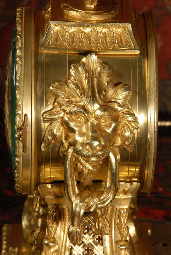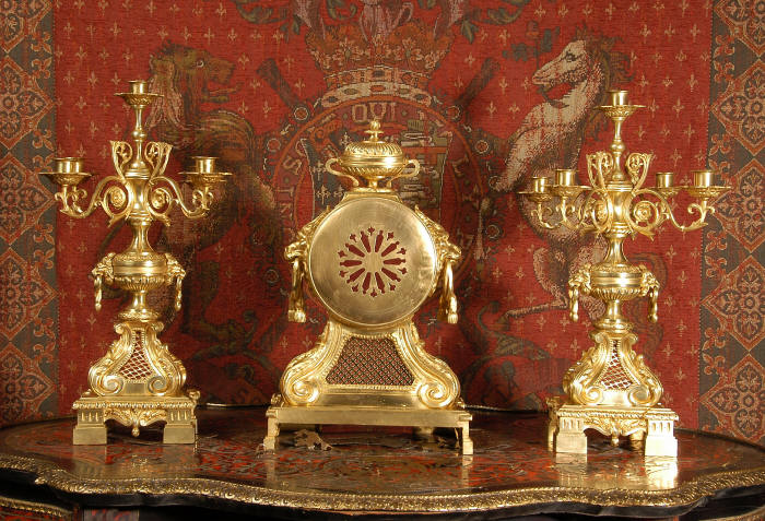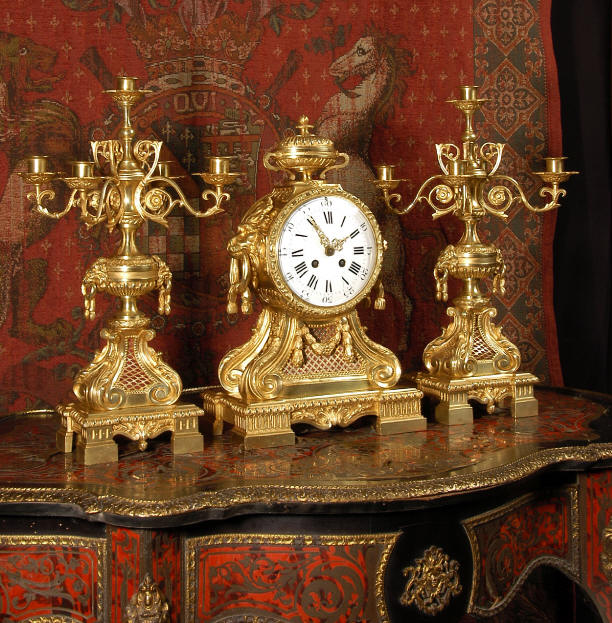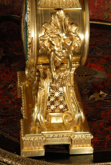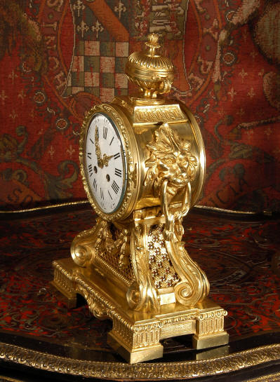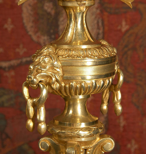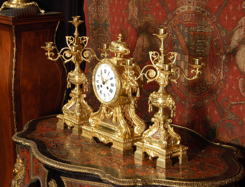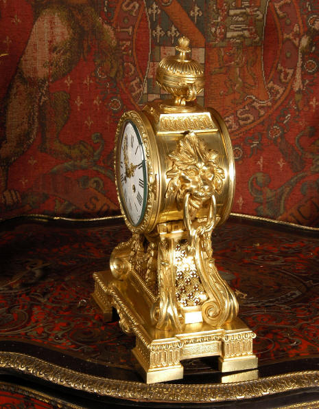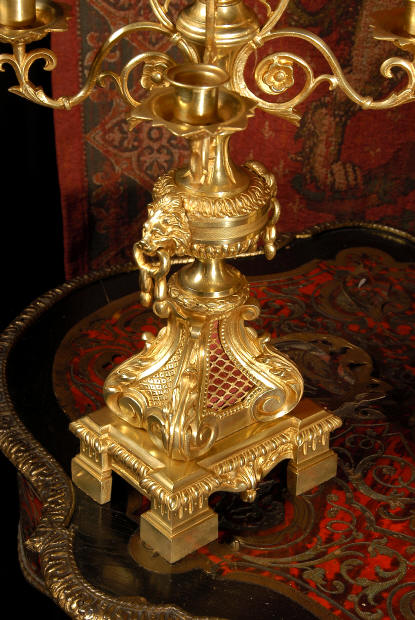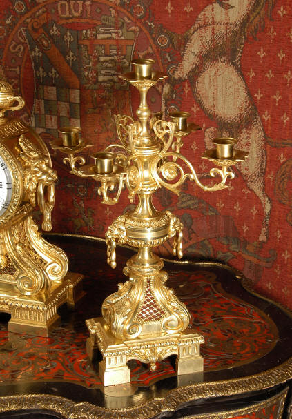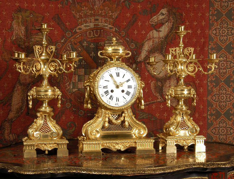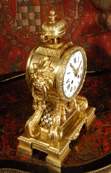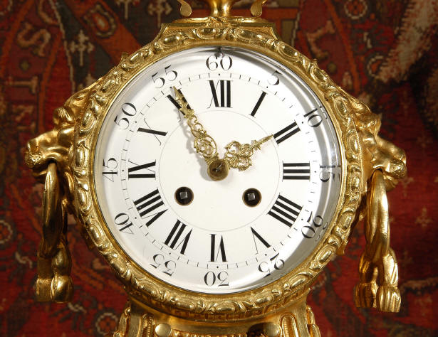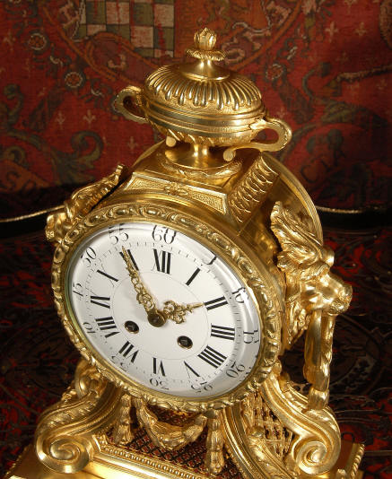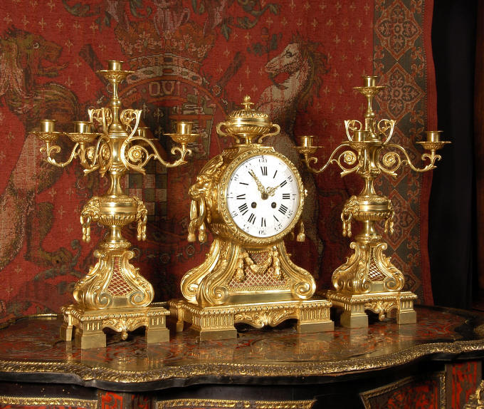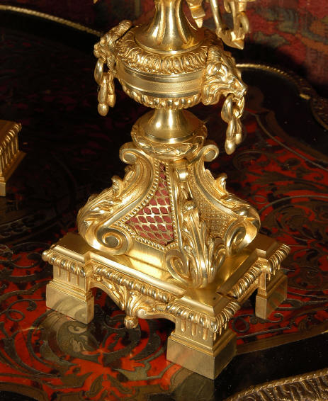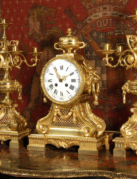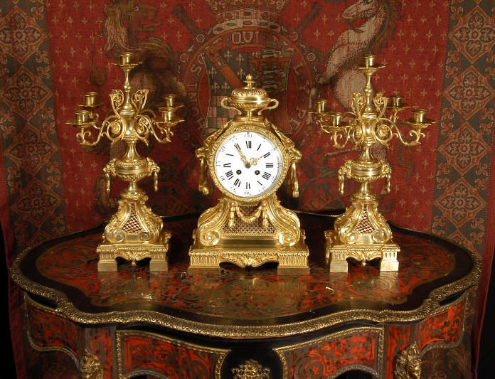 ~ French - Circa 1890 ~ ~~ Excellent condition ~~ A stunning classical clock set of large and impressive proportions. The clock itself is of 'drum head' shape with a particularly large enamel dial mounted on a waisted support of bold acanthus scrolls. These are mounted on a heavy, square base. A classical handled urn is mounted on the top of the case and to the sides are lions masks with laurel swag ring handles. Fretted panels are backed with red velvet. Candelabra are similarly designed and mounted with 5 light candelabra. The dial is enamel on copper and has a Roman hour ring with an Arabic minute ring. It is fitted with the original fretted gilt brass hands and covered by a convex, bevelled glass mounted in a heavy hobnail bezel. The set is of very good quality with crisp, sharp and finely detailed modelling and the brass has a lovely clean and bright finish. This is a heavy and well made clock set. The movement is of excellent quality and is by the famous Paris maker A D Mougin. It runs for 8 days and strikes half-hourly on a bell. It is in excellent clean and running condition having been fully overhauled by our clockmaker and is complete with a replacement pendulum and bell. See the video clip below to see this actual clock working! Condition of the case is