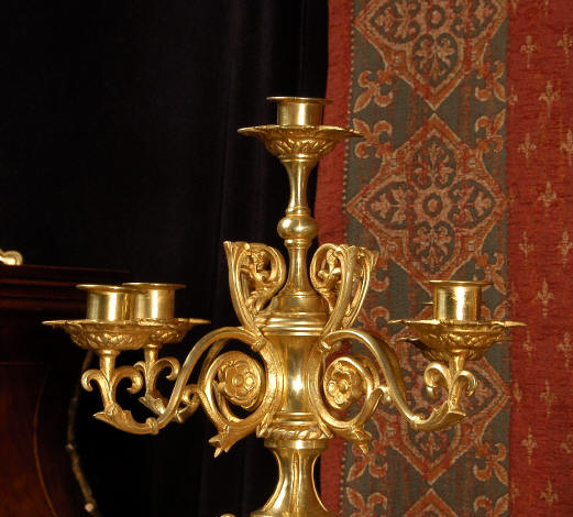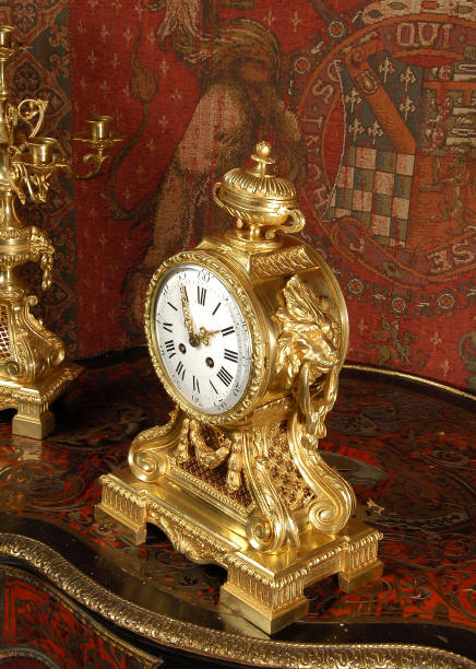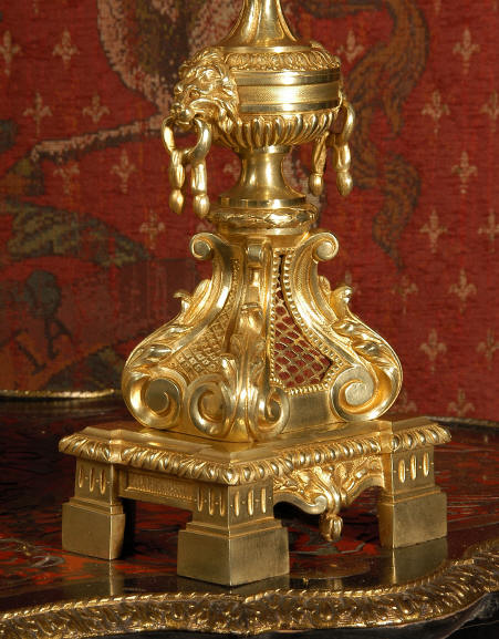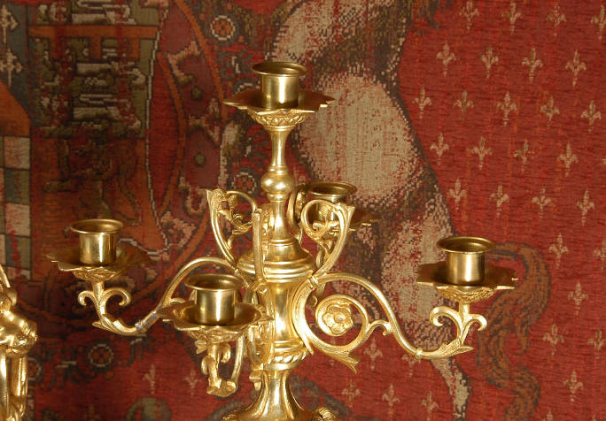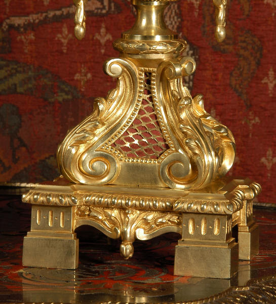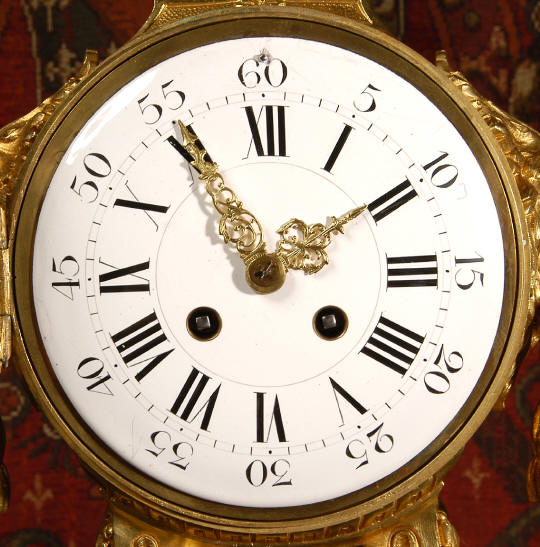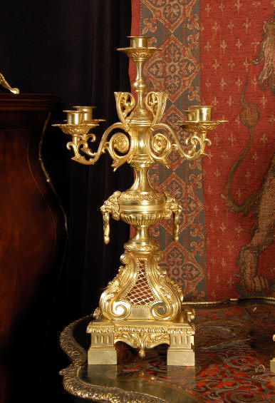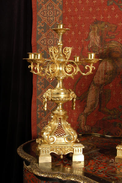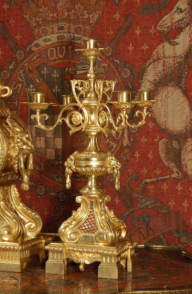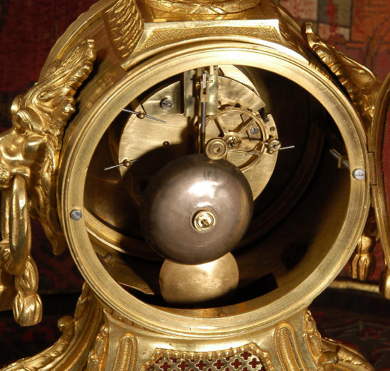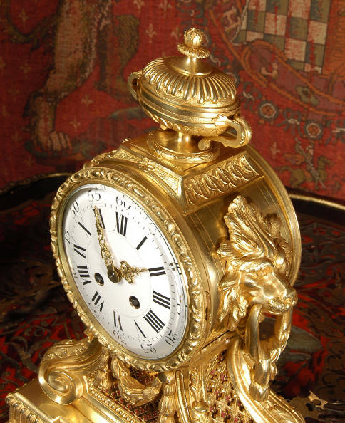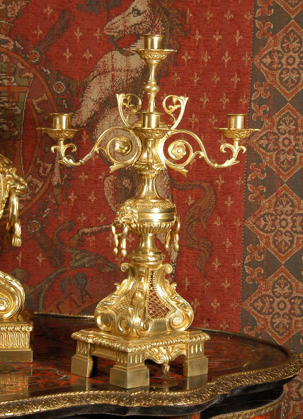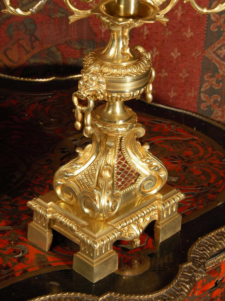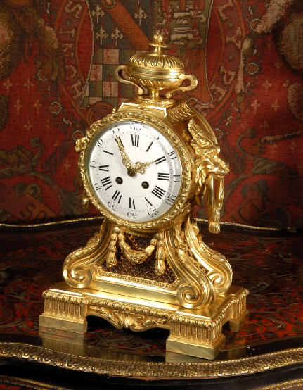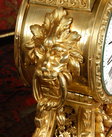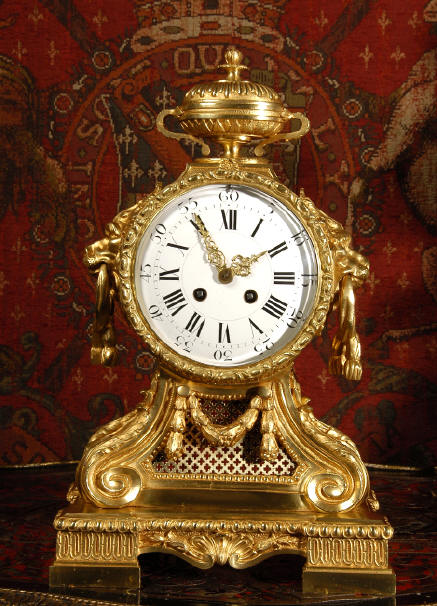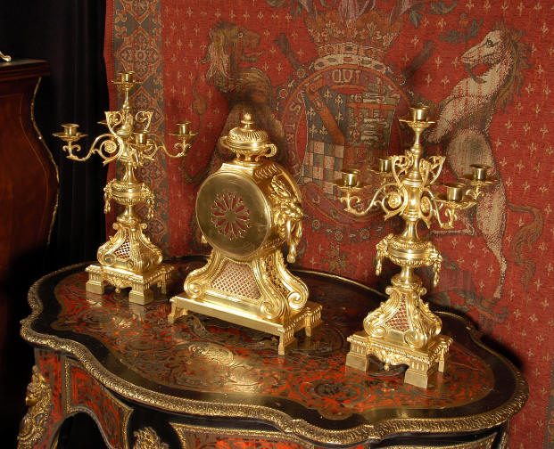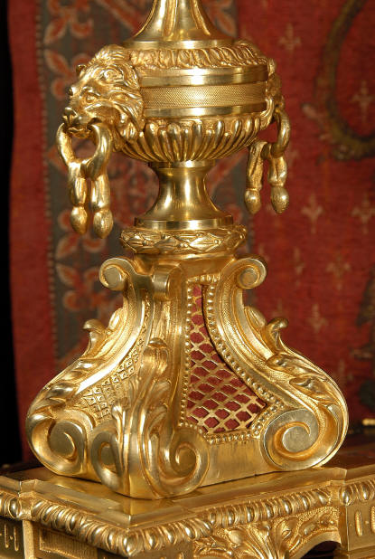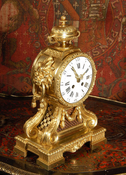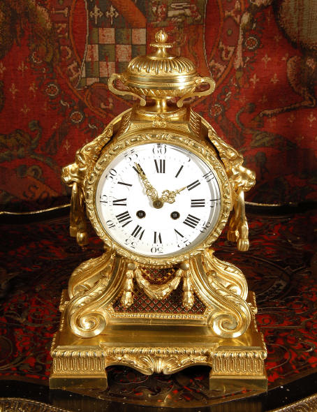 ~ French - Circa 1890 ~ ~~ Excellent condition ~~ A stunning classical clock set of large and impressive proportions. The clock itself is of 'drum head' shape with a particularly large enamel dial mounted on a waisted support of bold acanthus scrolls. These are mounted on a heavy, square base. A classical handled urn is mounted on the top of the case and to the sides are lions masks with laurel swag ring handles. Fretted panels are backed with red velvet. Candelabra are similarly designed and mounted with 5 light candelabra. The dial is enamel on copper and has a Roman hour ring with an Arabic minute ring. It is fitted with the original fretted gilt brass hands and covered by a convex, bevelled glass mounted in a heavy hobnail bezel. The set is of very good quality with crisp, sharp and finely detailed modelling and the brass has a lovely clean and bright finish. This is a heavy and well made clock set. The movement is of excellent quality and is by the famous Paris maker A D Mougin. It runs for 8 days and strikes half-hourly on a bell. It is in excellent clean and running condition having been fully overhauled by our clockmaker and is complete with a replacement pendulum and bell. See the video clip below to see this actual clock working! Condition of the case is