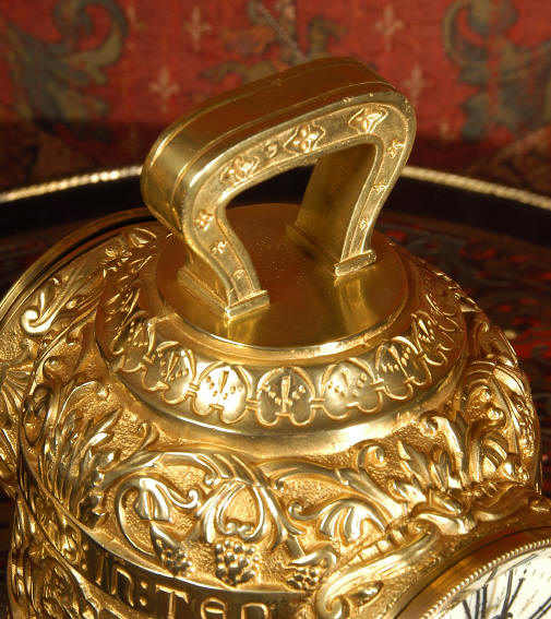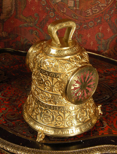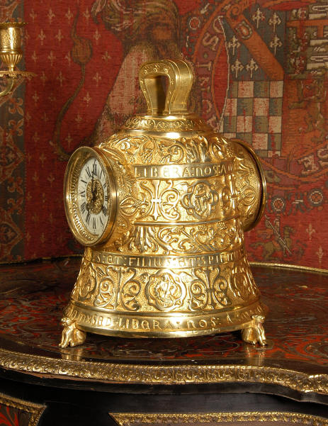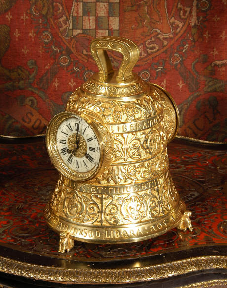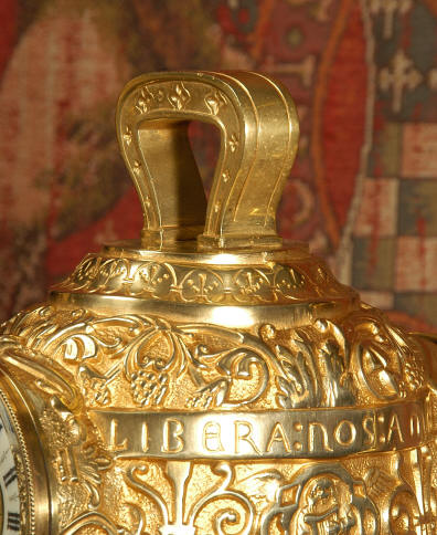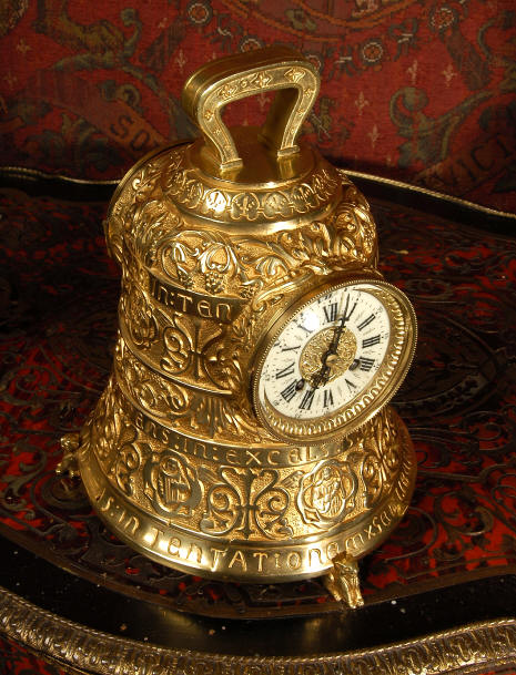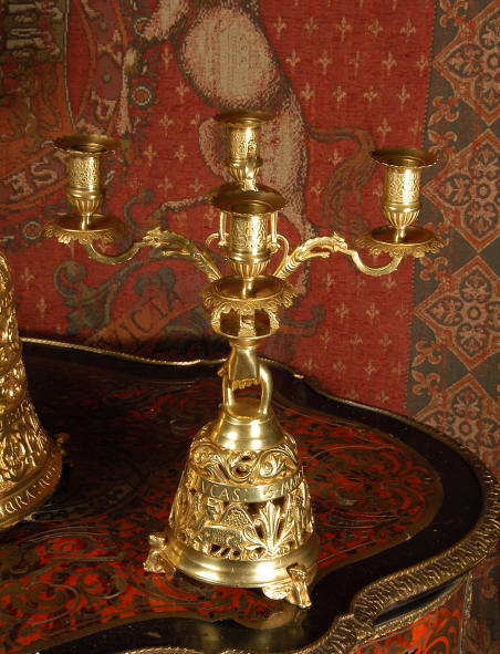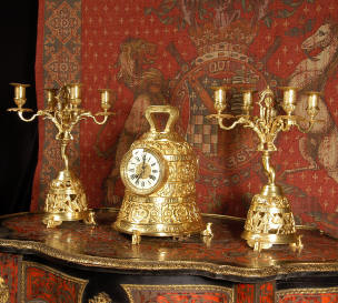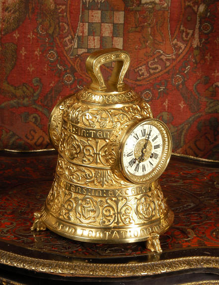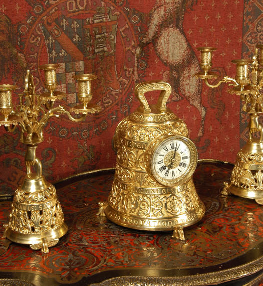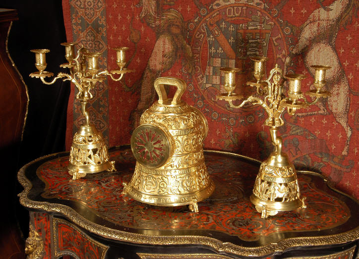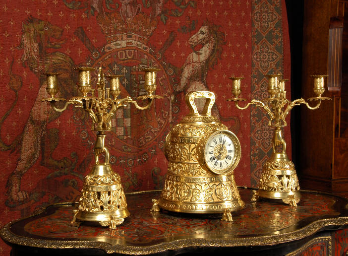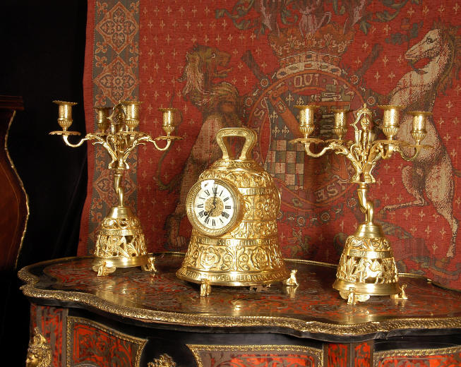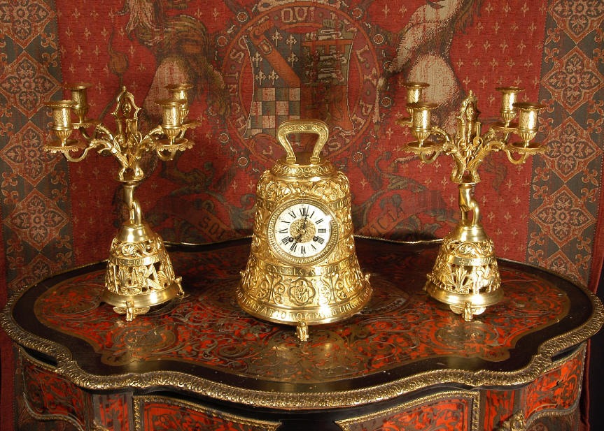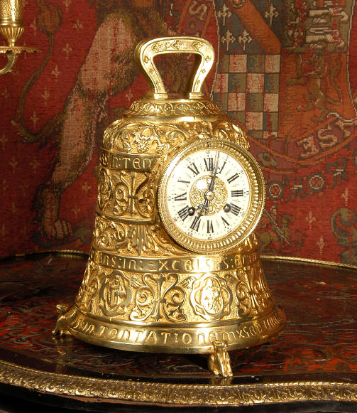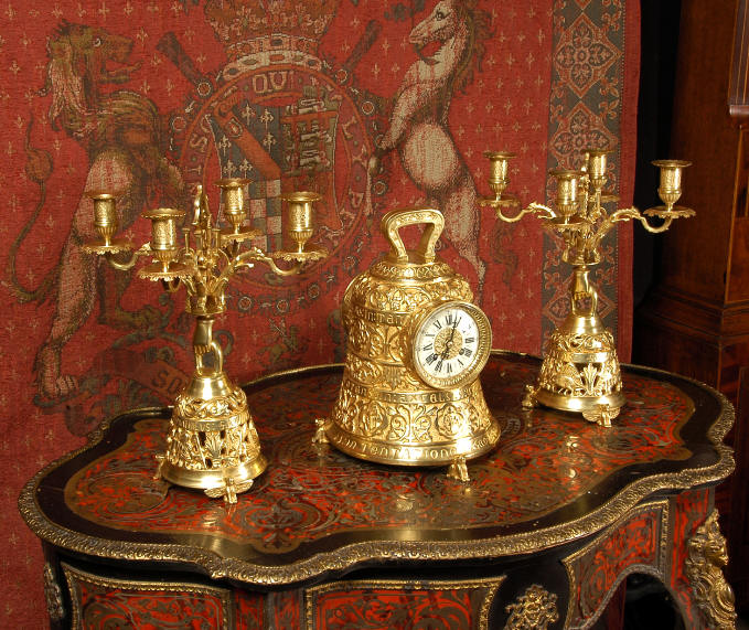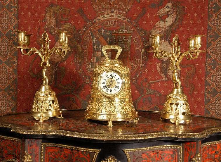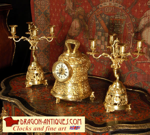 ~ French - Circa 1870 ~ ~~ Excellent condition ~~ Bell clocks are unusual, but to find a bell clock set is very rare. This one is heavily cast in brass and is profusely decorated. The clock features Christian symbolism in fragments from the Lord's Prayer in Latin, a bold brass handle and it sits on feet in the form of mythical creatures. Candelabra are in the form of the Evangelist bell with four winged creatures: Matheus � The winged man represents Matthew, because his gospel narrative traces Jesus� human genealogy. Marcus � The winged lion. This is the symbol of Mark (and also Venice), because his gospel narrative begins with the voice of one crying in the wilderness, and this suggests the roar of a lion. Lucas � The winged creature with the head of an ox is the symbol of Luke; the animal of sacrifice stresses the atoning sacrifice of Jesus. Johannes � the winged creature with the head of the eagle. This is the emblem of John because in his narrative, he rises to the loftiest heights, in dealing with the mind of Christ. Four light candelabra are held above the bell by well sculptured hands. Each arm is in the form of a mythical creature, hanging on by its tail and holding the sconce in its mouth. The dial is enamel on copper with a cast brass centre and is complete with original blued steel hands. The French movement is of very good quality and is in excellent clean and running condition having been fully serviced by our clockmaker. Pendulum and the gong sound board had been replaced. It runs for 8 days and strikes the hours and halves on a coiled gong. Click the movie below to see this actual clock running! Condition of the case is