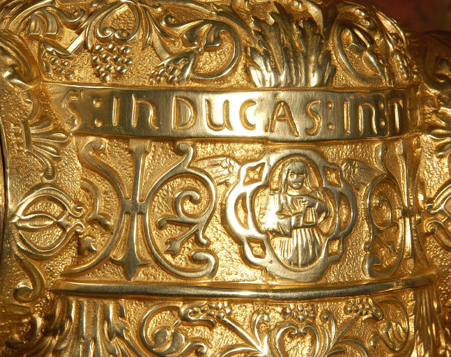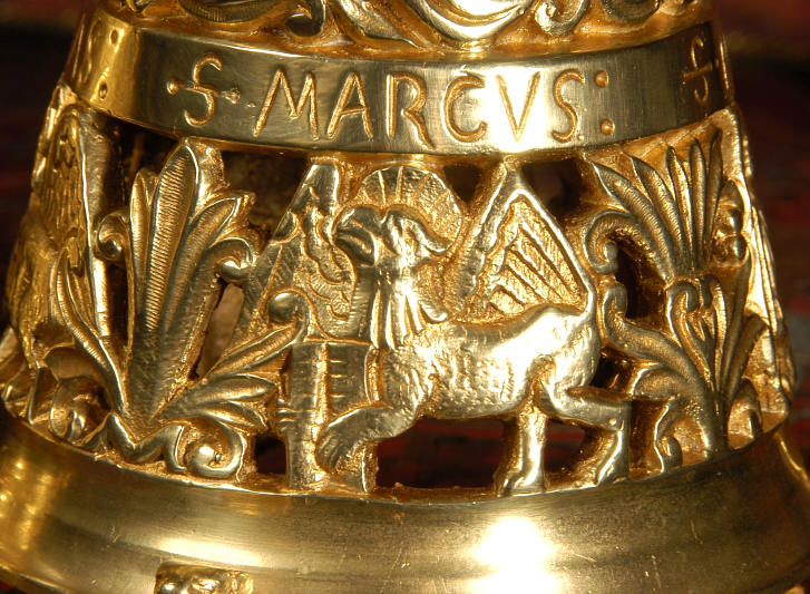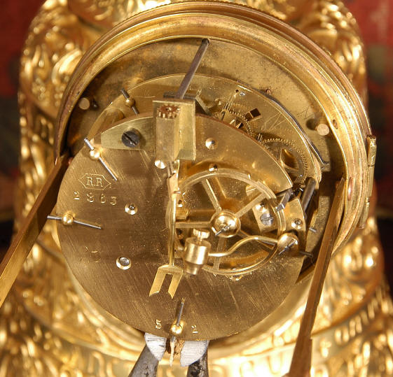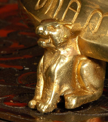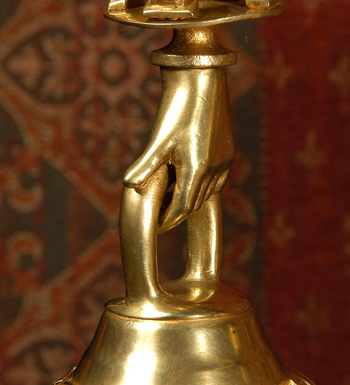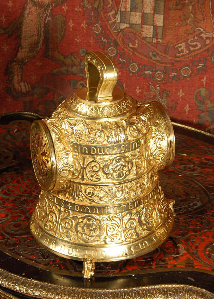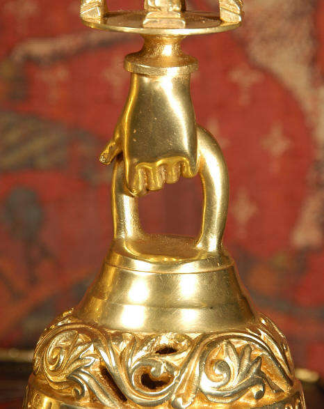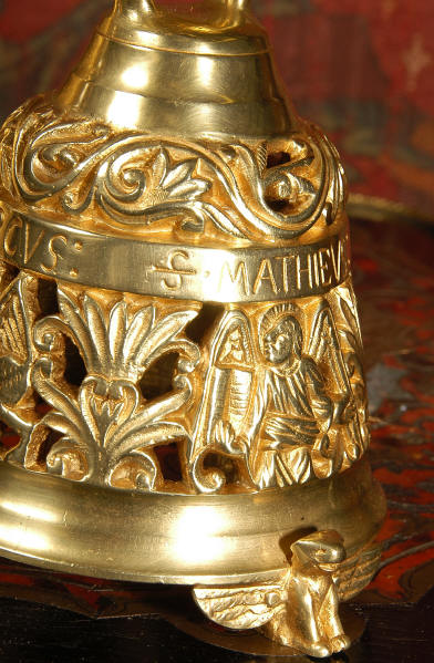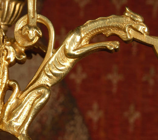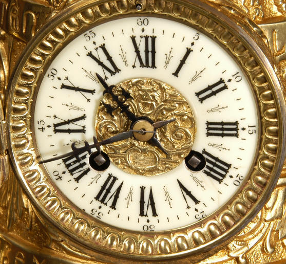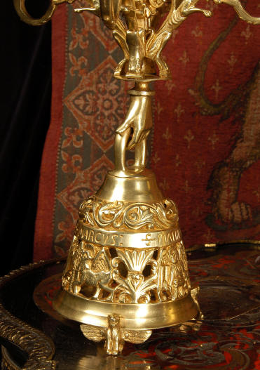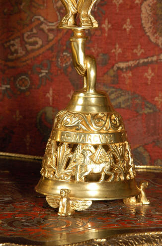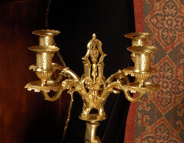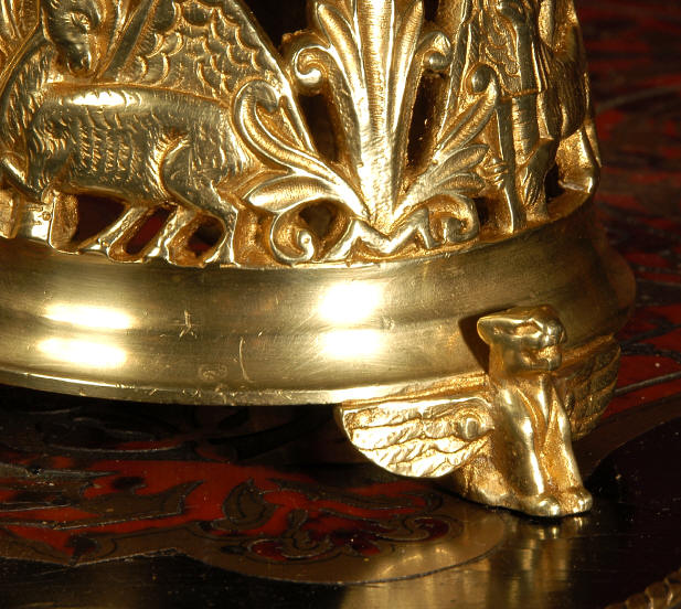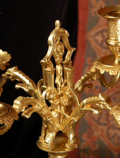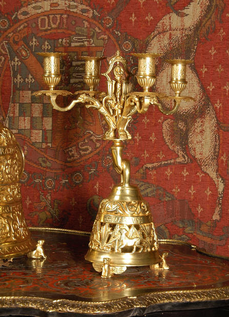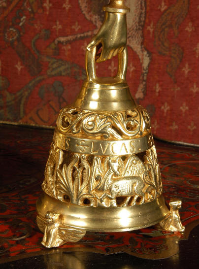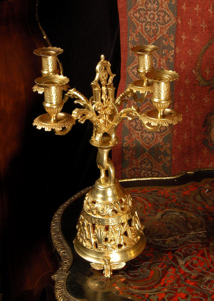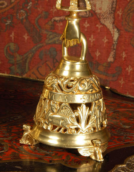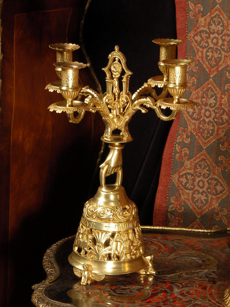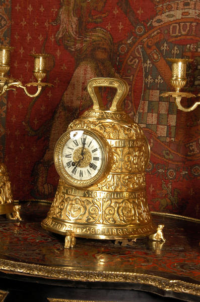 ~ French - Circa 1870 ~ ~~ Excellent condition ~~ Bell clocks are unusual, but to find a bell clock set is very rare. This one is heavily cast in brass and is profusely decorated. The clock features Christian symbolism in fragments from the Lord's Prayer in Latin, a bold brass handle and it sits on feet in the form of mythical creatures. Candelabra are in the form of the Evangelist bell with four winged creatures: Matheus � The winged man represents Matthew, because his gospel narrative traces Jesus� human genealogy. Marcus � The winged lion. This is the symbol of Mark (and also Venice), because his gospel narrative begins with the voice of one crying in the wilderness, and this suggests the roar of a lion. Lucas � The winged creature with the head of an ox is the symbol of Luke; the animal of sacrifice stresses the atoning sacrifice of Jesus. Johannes � the winged creature with the head of the eagle. This is the emblem of John because in his narrative, he rises to the loftiest heights, in dealing with the mind of Christ. Four light candelabra are held above the bell by well sculptured hands. Each arm is in the form of a mythical creature, hanging on by its tail and holding the sconce in its mouth. The dial is enamel on copper with a cast brass centre and is complete with original blued steel hands. The French movement is of very good quality and is in excellent clean and running condition having been fully serviced by our clockmaker. Pendulum and the gong sound board had been replaced. It runs for 8 days and strikes the hours and halves on a coiled gong. Click the movie below to see this actual clock running! Condition of the case is