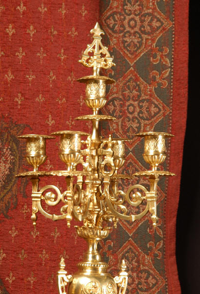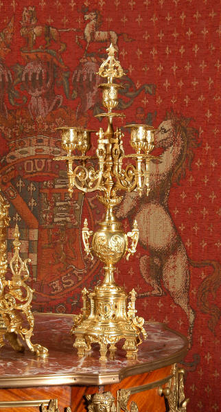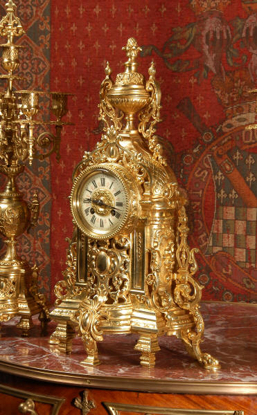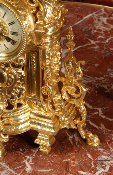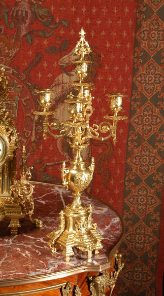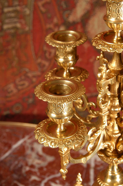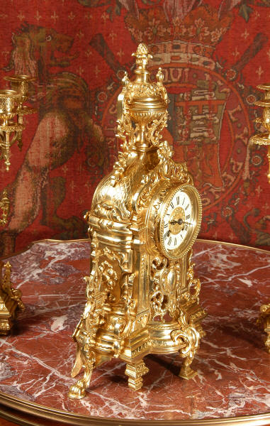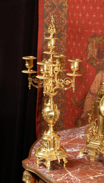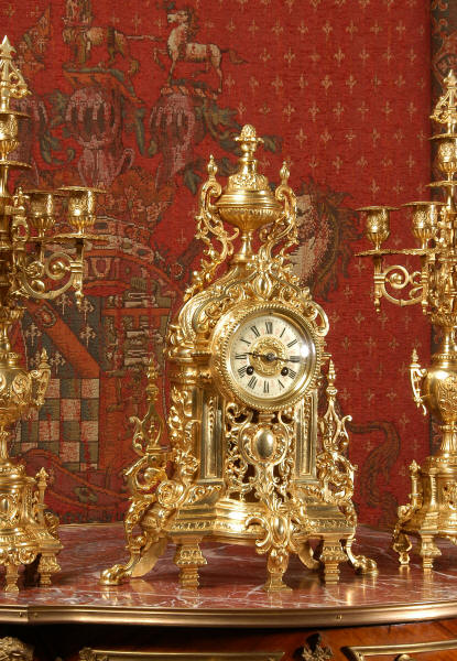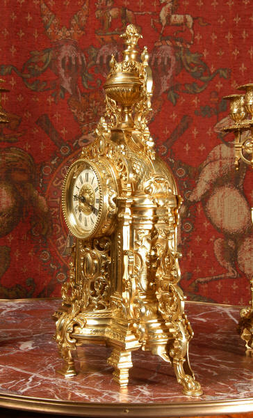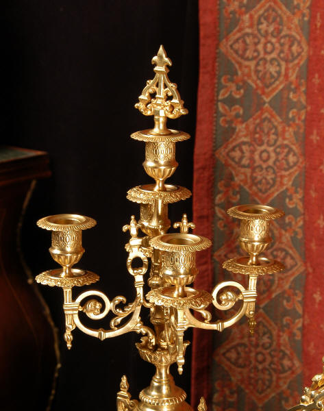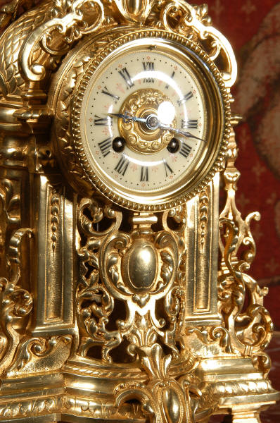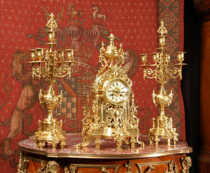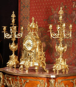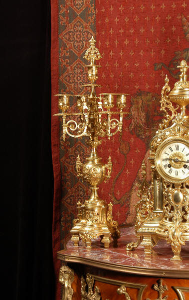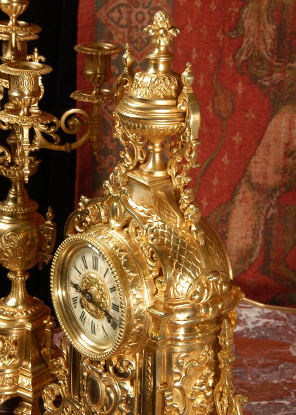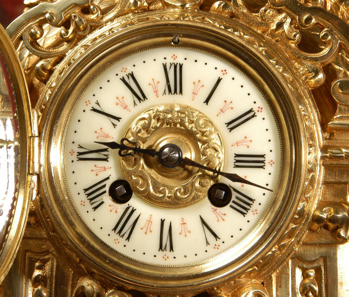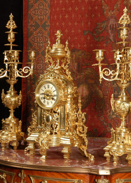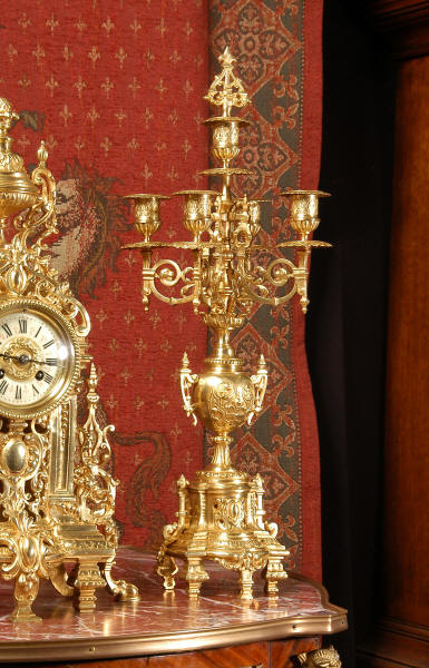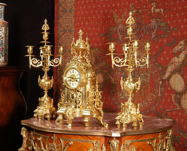~ French - Circa 1880 ~ ~~ Excellent condition, fully overhauled & working ~~ A beautiful antique French Louis XVI style clock set 'Garniture de cheminee'. It is very well modelled in gilded brass in the Louis XVI style. The case is architecturally shaped, profusely decorated with floral swags. The front of the case is fretted to allow the pendulum to be glimpsed swinging inside the case. Candelabra are conforming in style with bold 4 branch candelabra above handled urns and are complete with original snuffers. These sit in the central nozzle as finials. The dial is enamel on copper with a cast brass centre and is complete with original blued steel hands. The French movement is of high quality and is in excellent clean and running condition having been fully overhauled by our clockmaker. It is complete with the original pendulum. It runs for 8 days on one wind and strikes the hours and halves on a bell. Click the movie below to hear the bell and watch the clock running! Condition of the case is