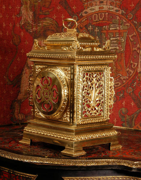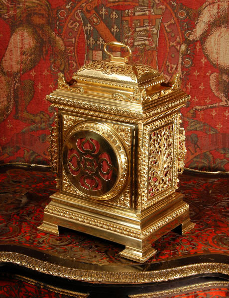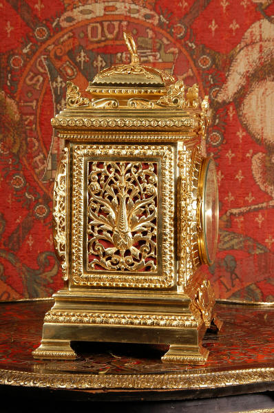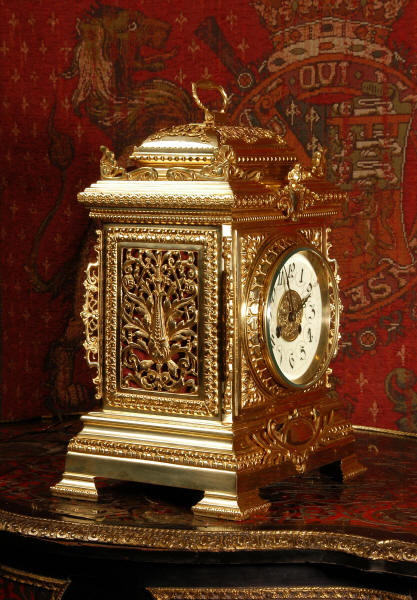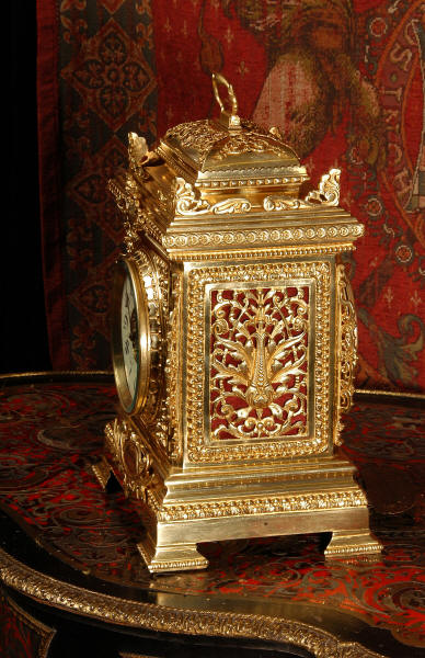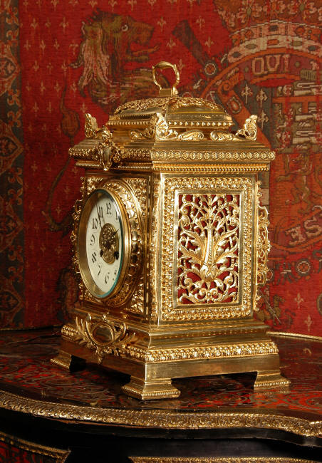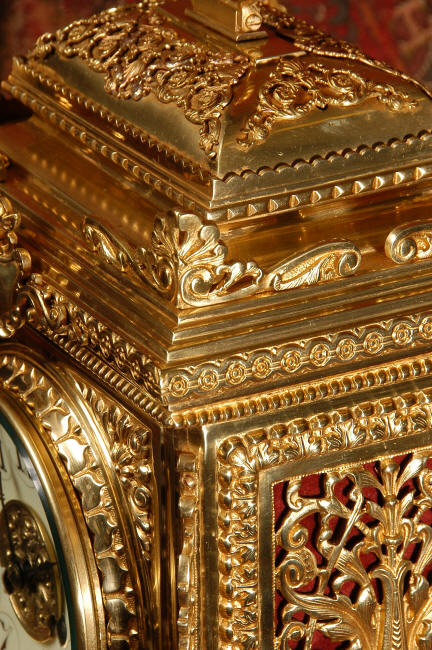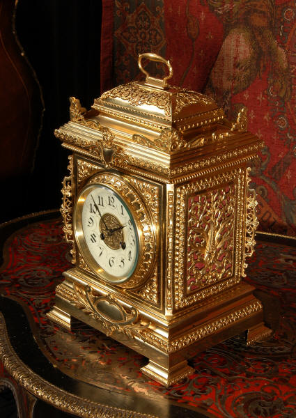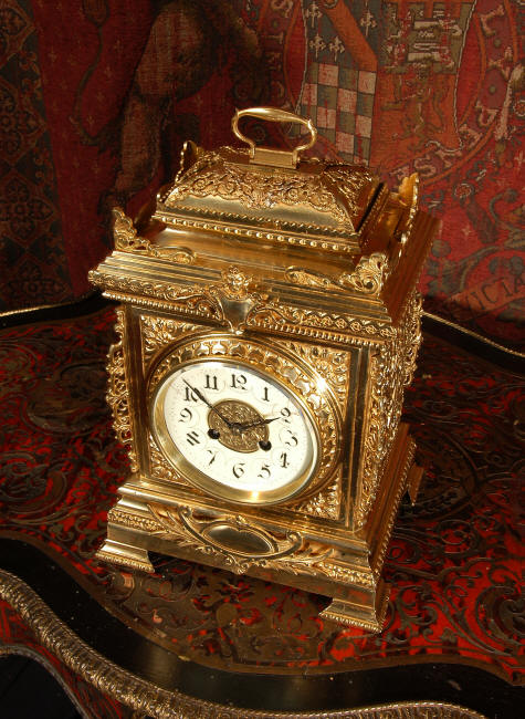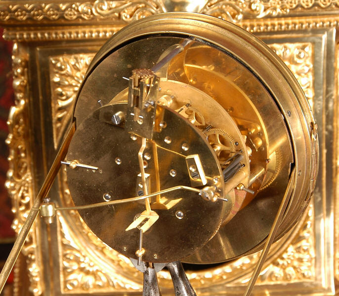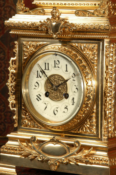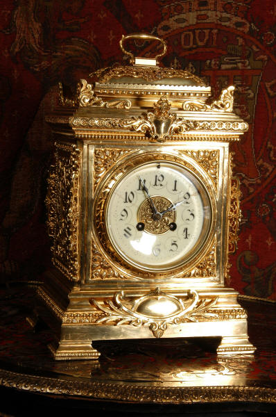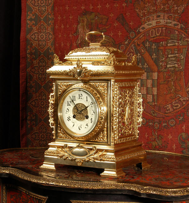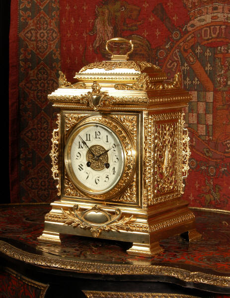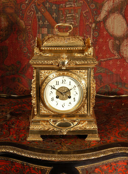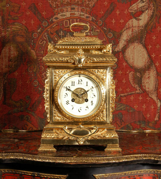 ~ French - Circa 1900 ~ ~~ Excellent condition, full overhauled and working ~~ A very impressive and substantial antique French table clock, modelled in gilded brass in the classical style. It features a beautiful large enamel dial with brass centre and fine blued steel hands. To the sides are red velvet backed sound frets, finely detailed, to enable the sonorous gong strike to be fully appreciated. The caddy top is draped with blind fretted swags. The French movement by Fritz Marti and has the makers 'Medaille D'Or, Paris 1900' mark on the movement backplate. It is of excellent quality and is the large plate version of the Pendule de Paris movement and has the superior rack striking and pin-pallet escapement. We have dismantled the movement, fully cleaned and overhauled it, fitted two new springs and made a new pendulum. We then tested it thoroughly until satisfied that it runs perfectly. It runs for 8 days on one wind and strikes the hours and half-hours on a sonorous coiled gong. You can watch the clock running in the video clip below. Condition of the case is
