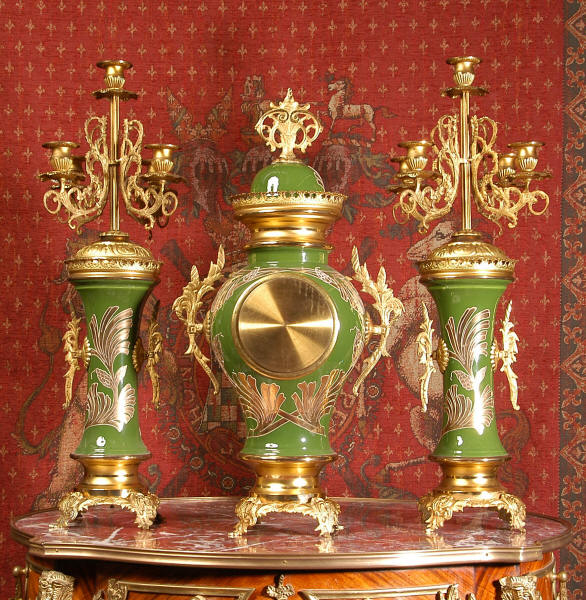 Dimensions of clock: inches Height 22 3/4", Width 12", Depth 7 1/4" centimetres Height 58 cm, Width 30 cm, Depth 18 cm Dimensions of candelabra: inches Height 24 1/2", Width 7 1/2", Depth 7 1/2" centimetres Height 62.5 cm, Width 19 cm, Depth 19 cm