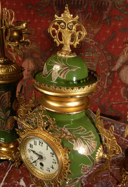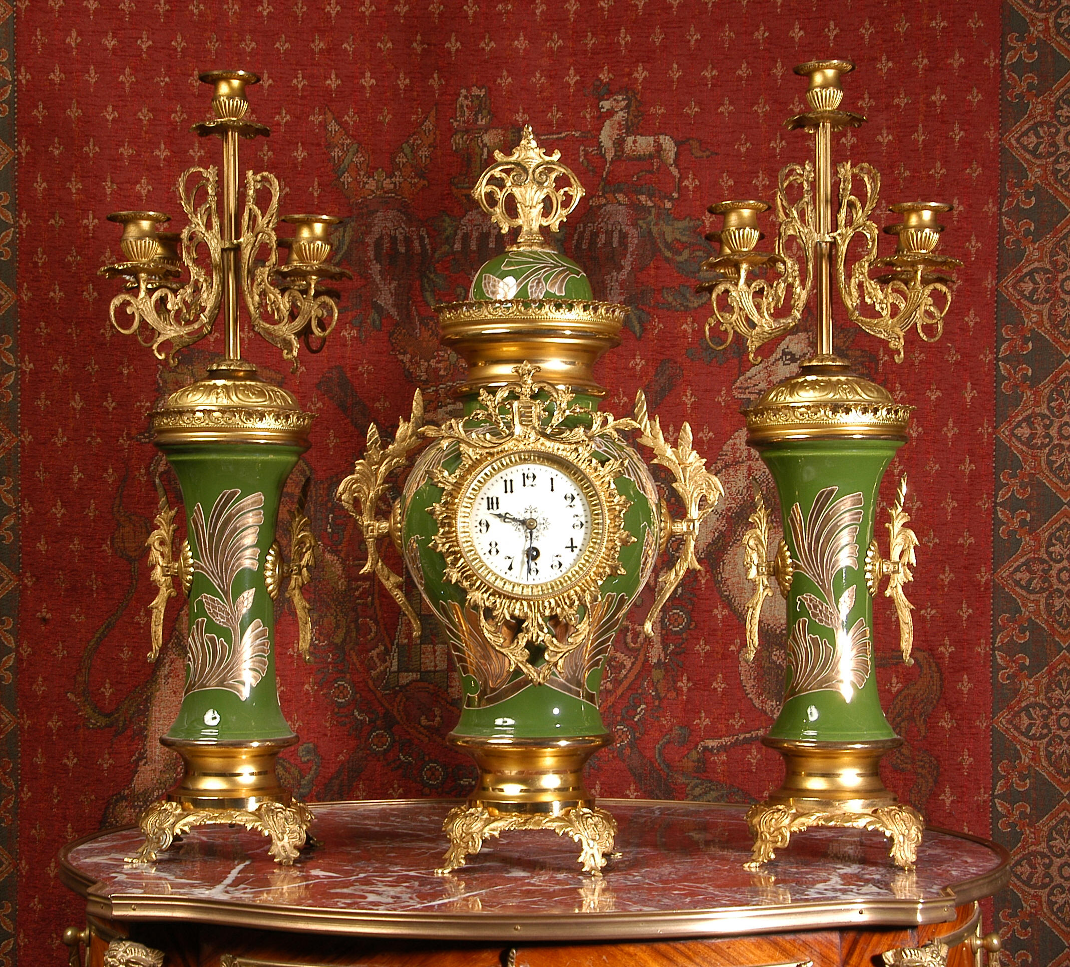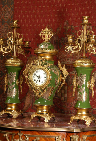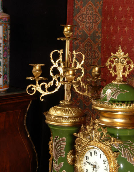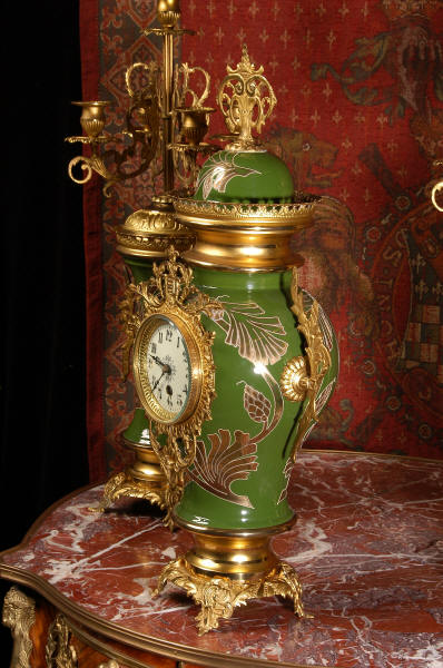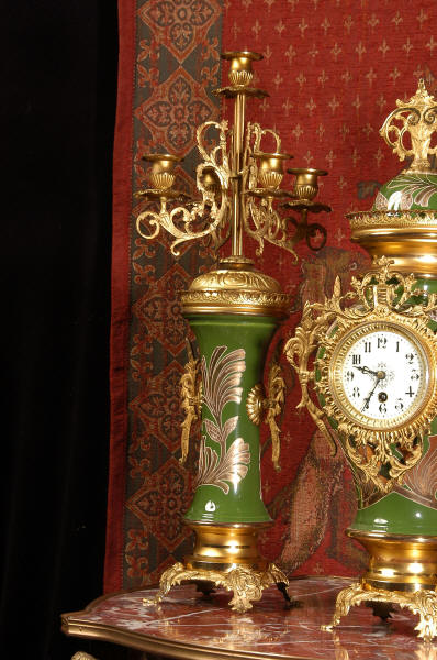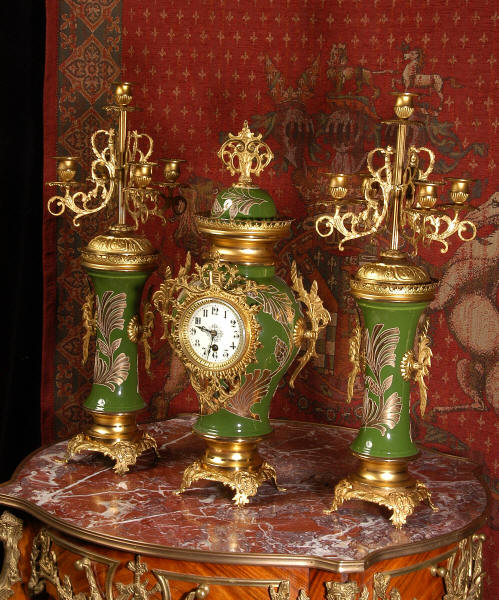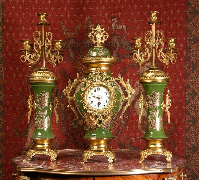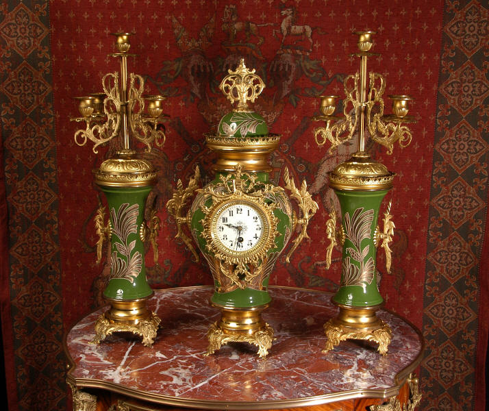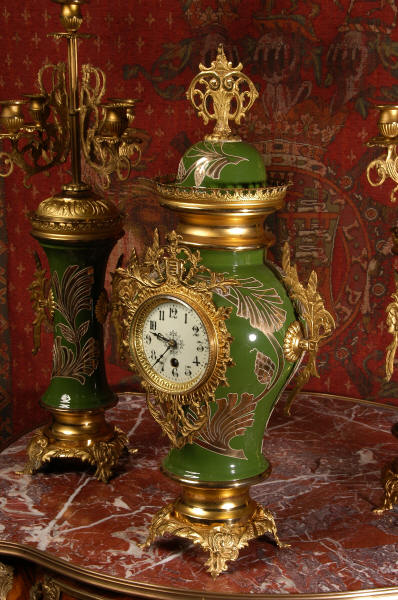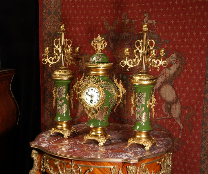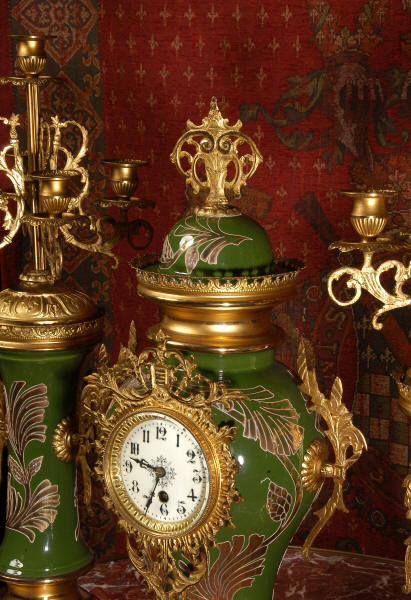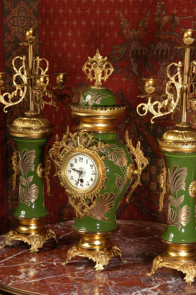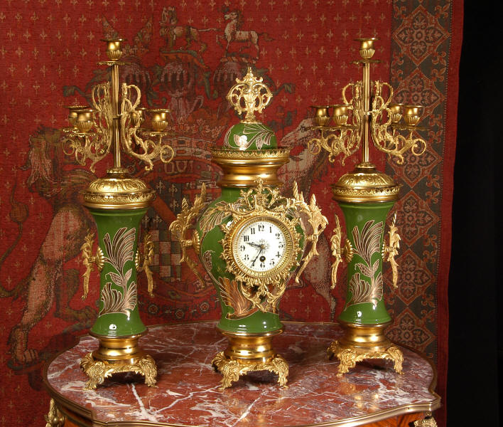 A very decorative clock set. Pottery bodies are