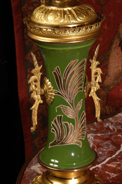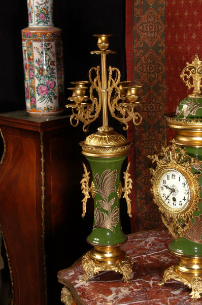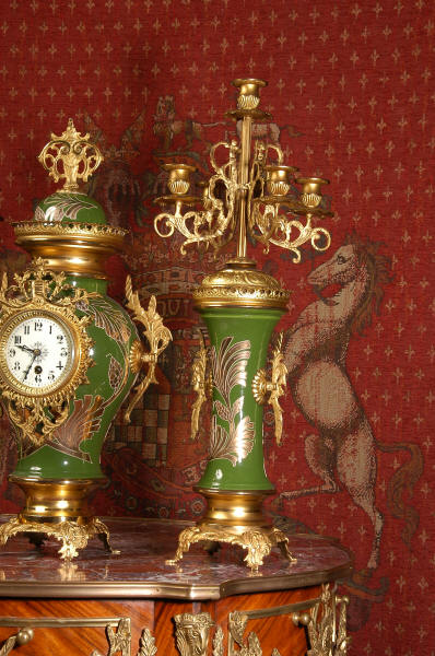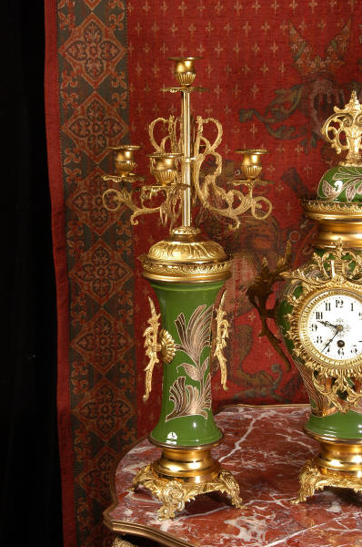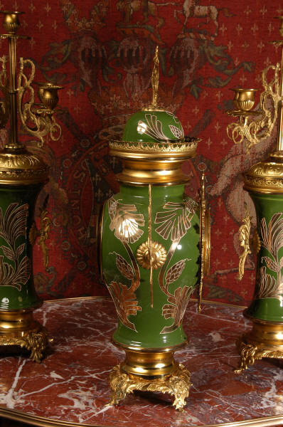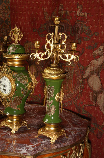 Nouveau style. The pottery is mounted with gilded brass bases and candelabra. To