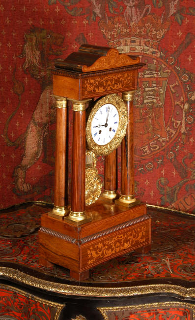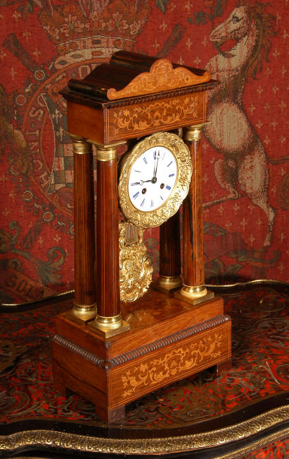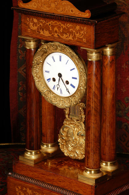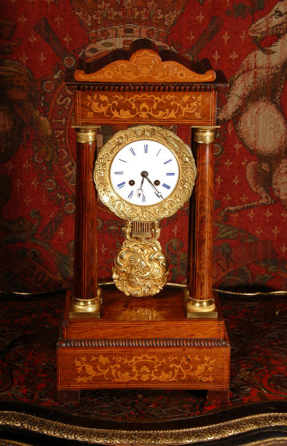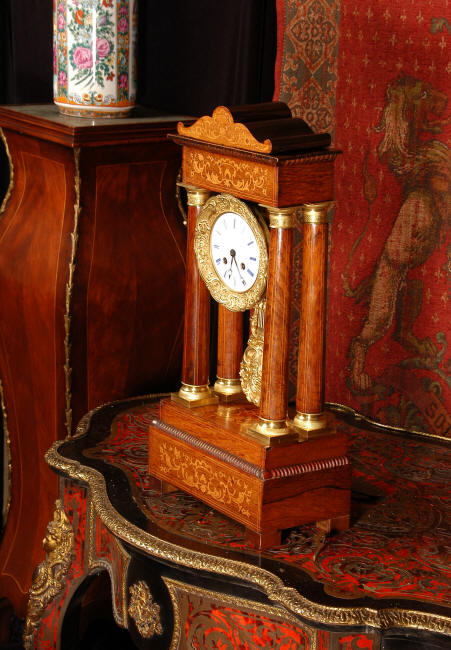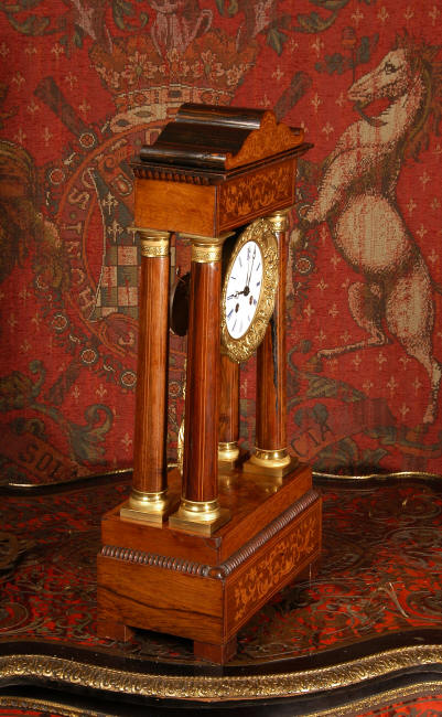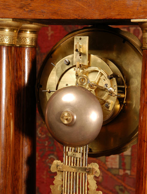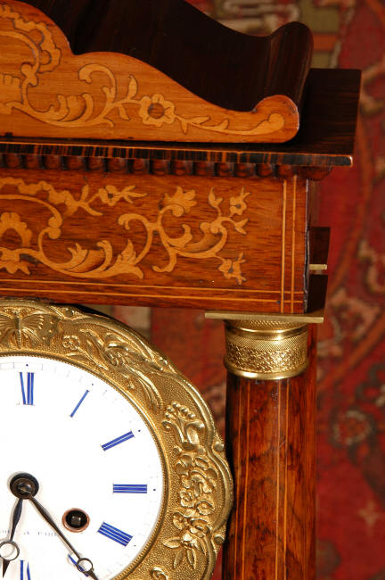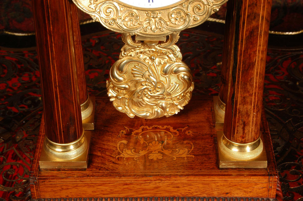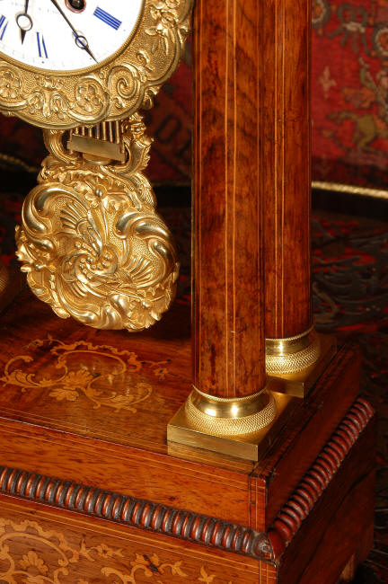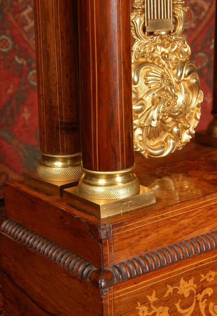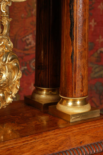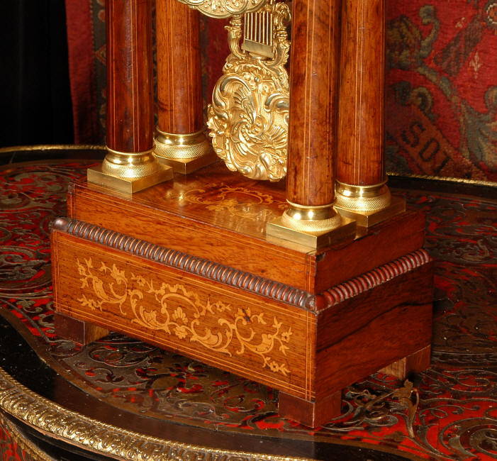 with fine inlaid stringing and ormolu capitals support the top with the movement