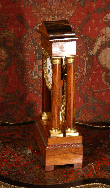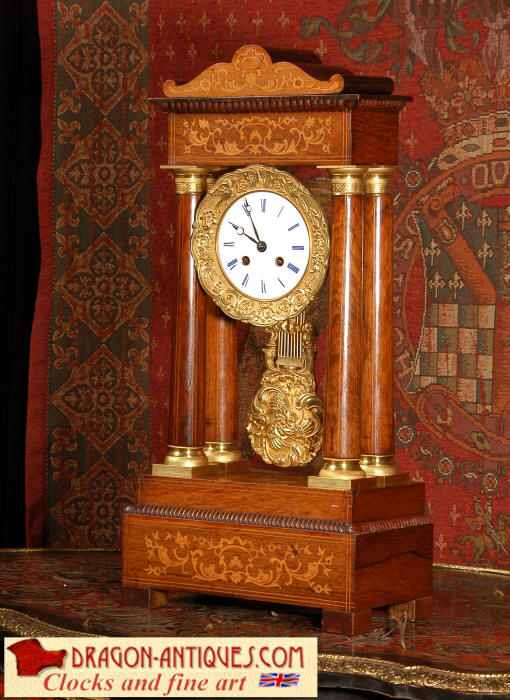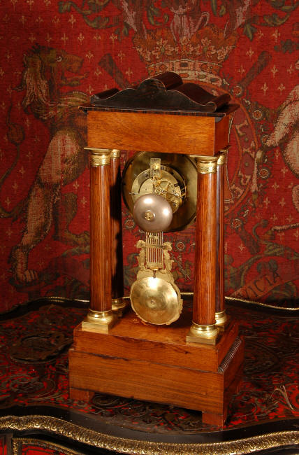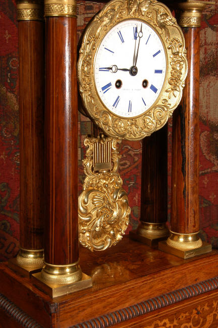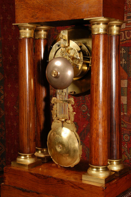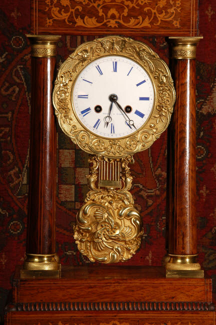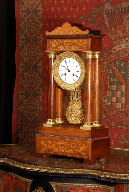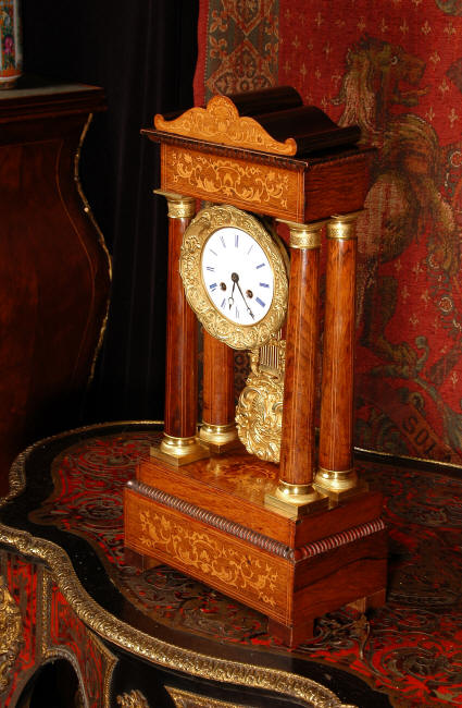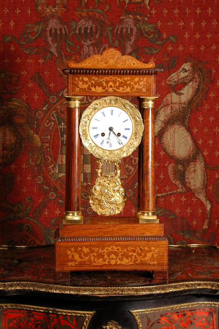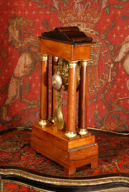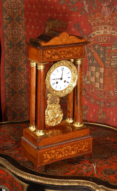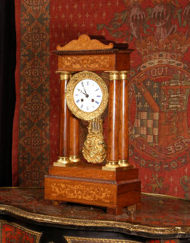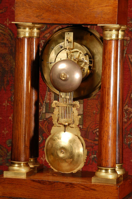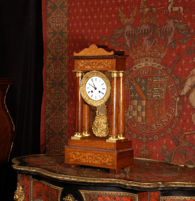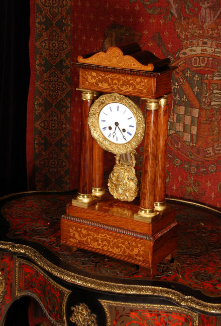 with fine inlaid stringing and ormolu capitals support the top with the movement