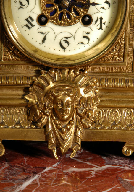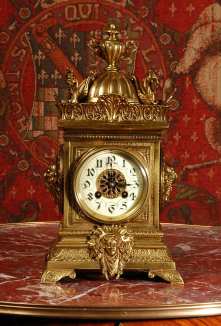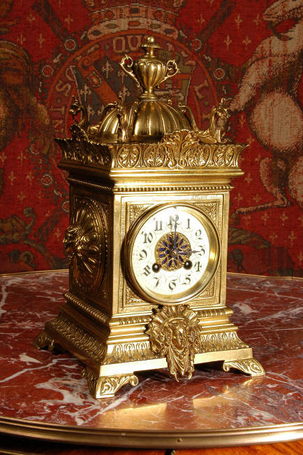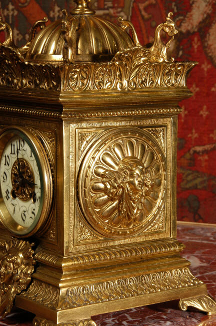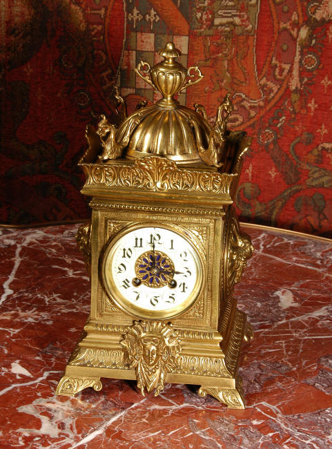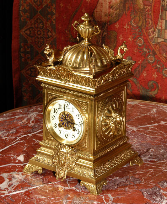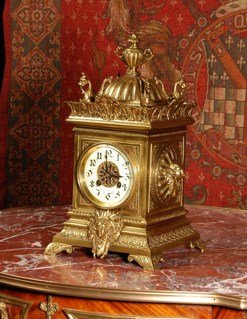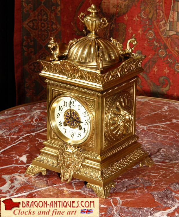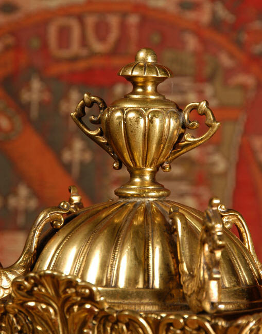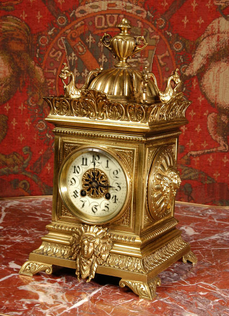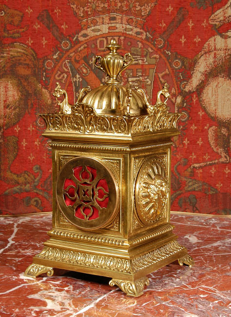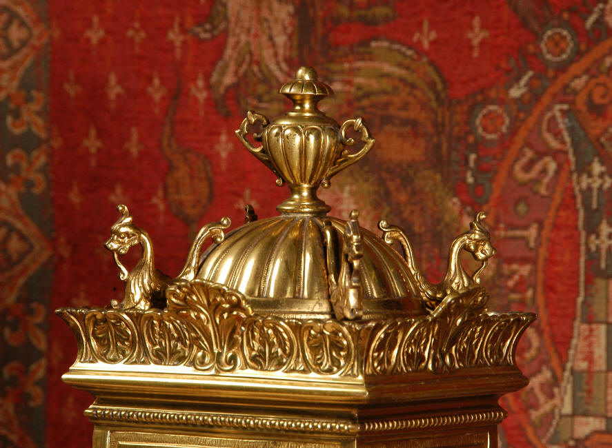 the sun-god, who conquers all demons of darkness within a sun burst. A cushion shaped dome top features an urn to the top and mythical creatures to
