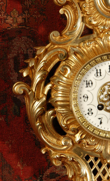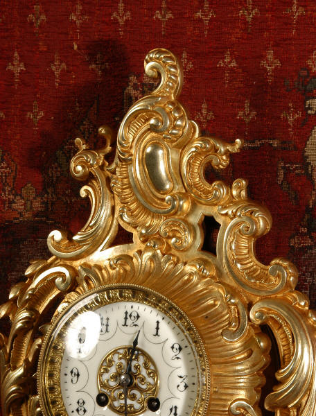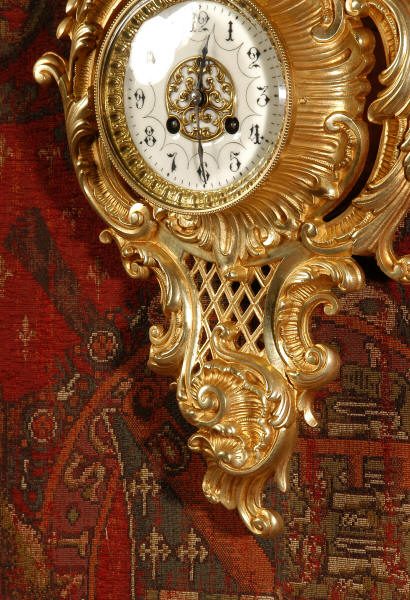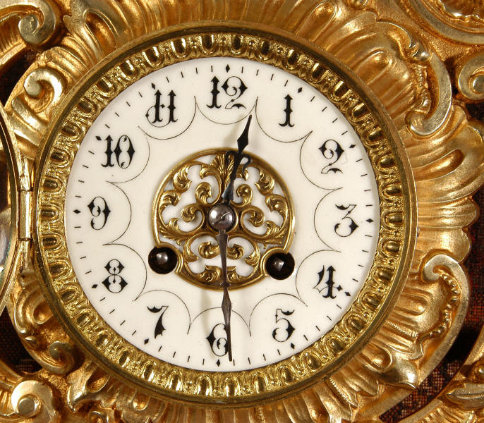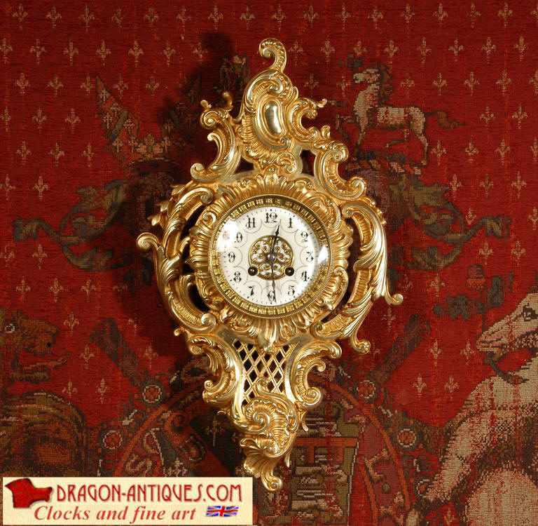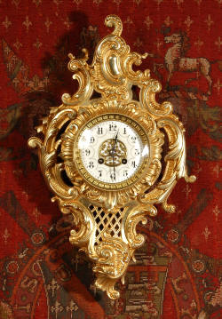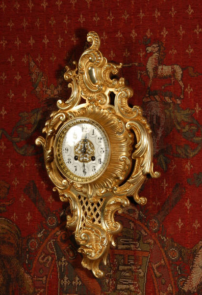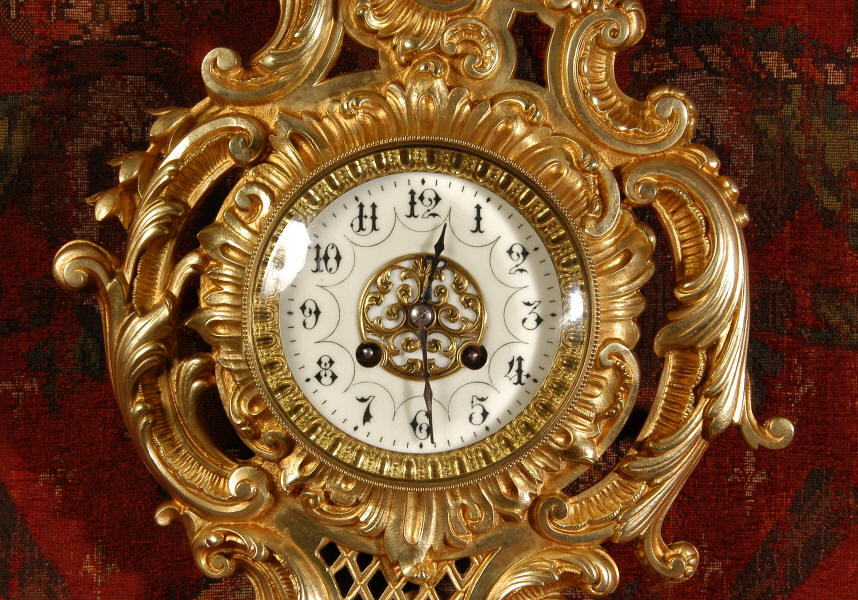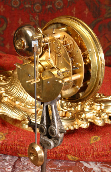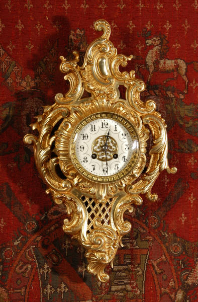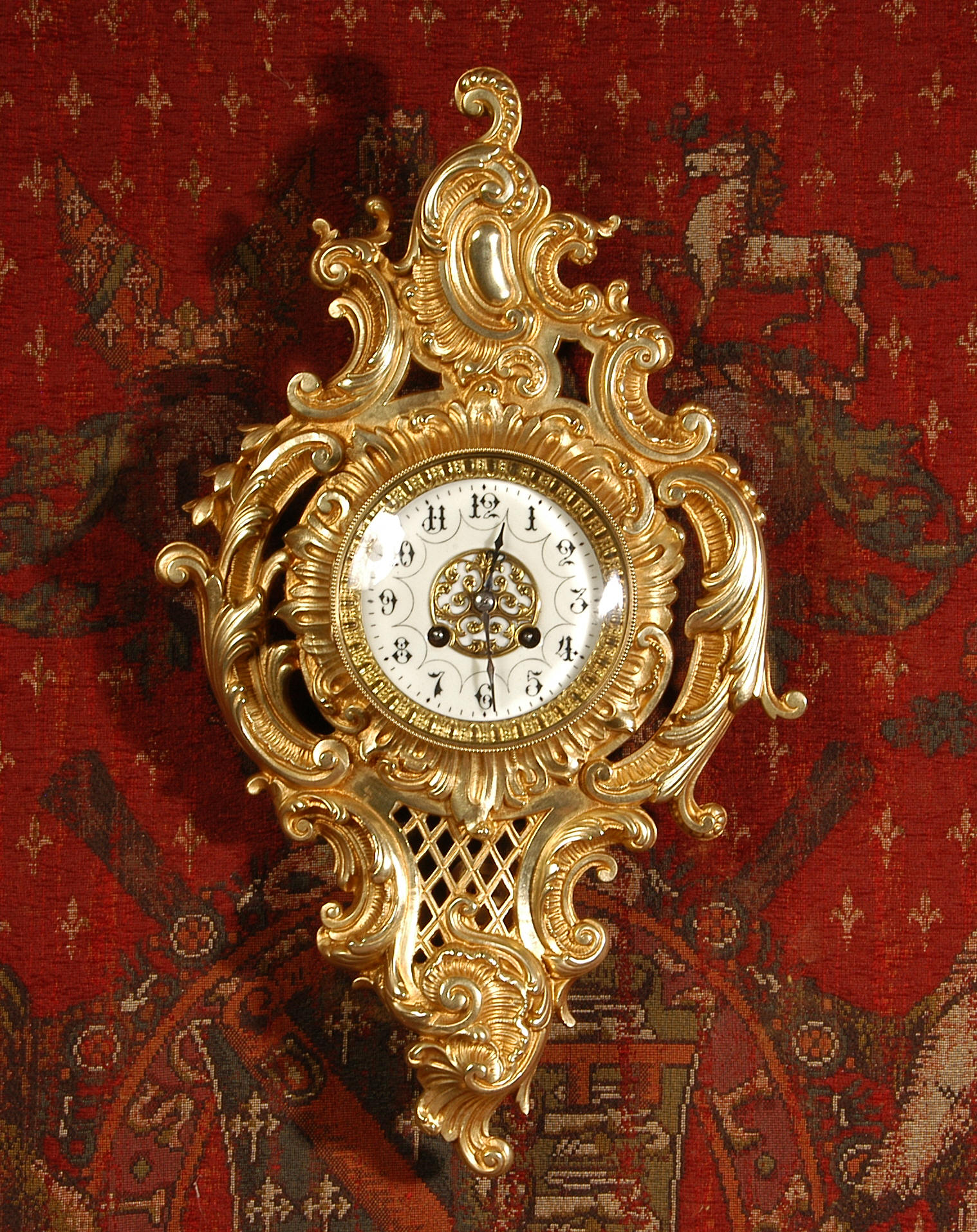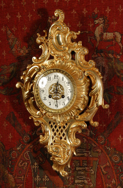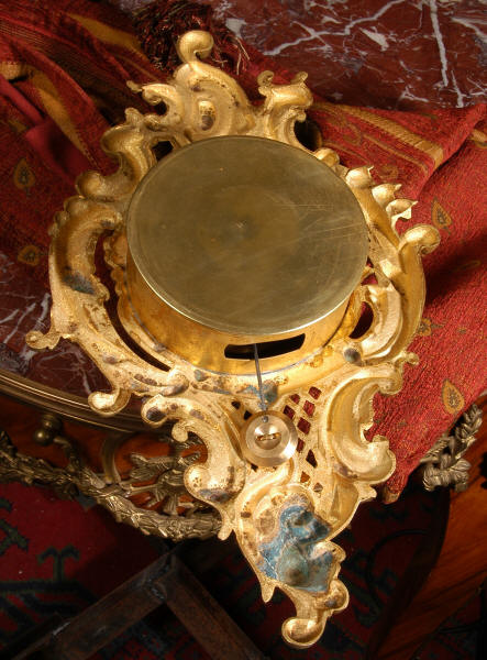 gilded finish. The pendulum can be seen swinging below the dial behind a fretted