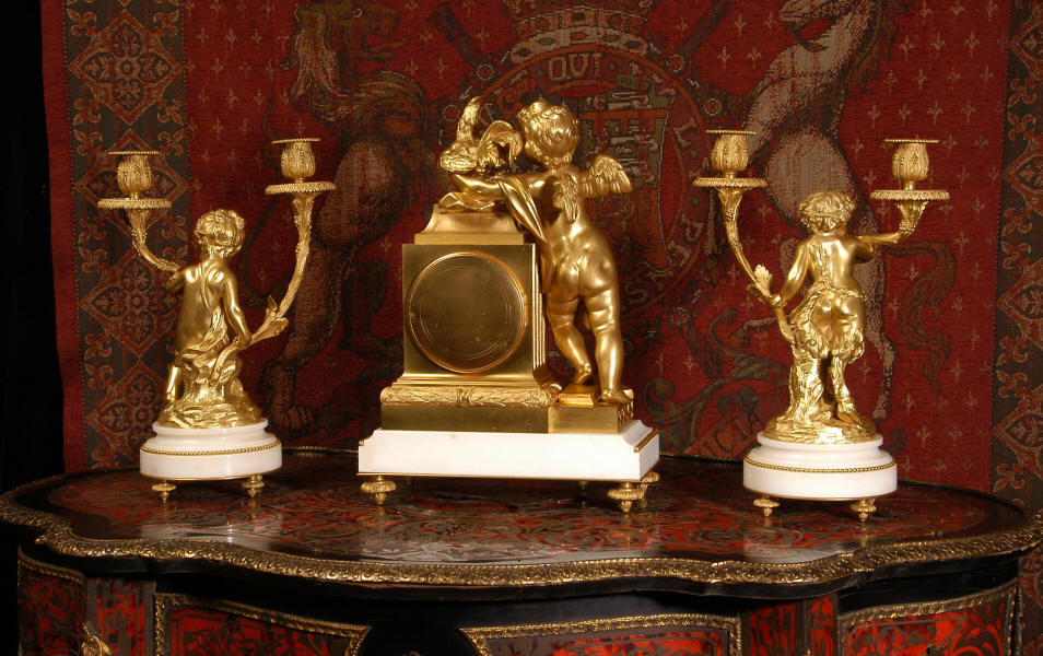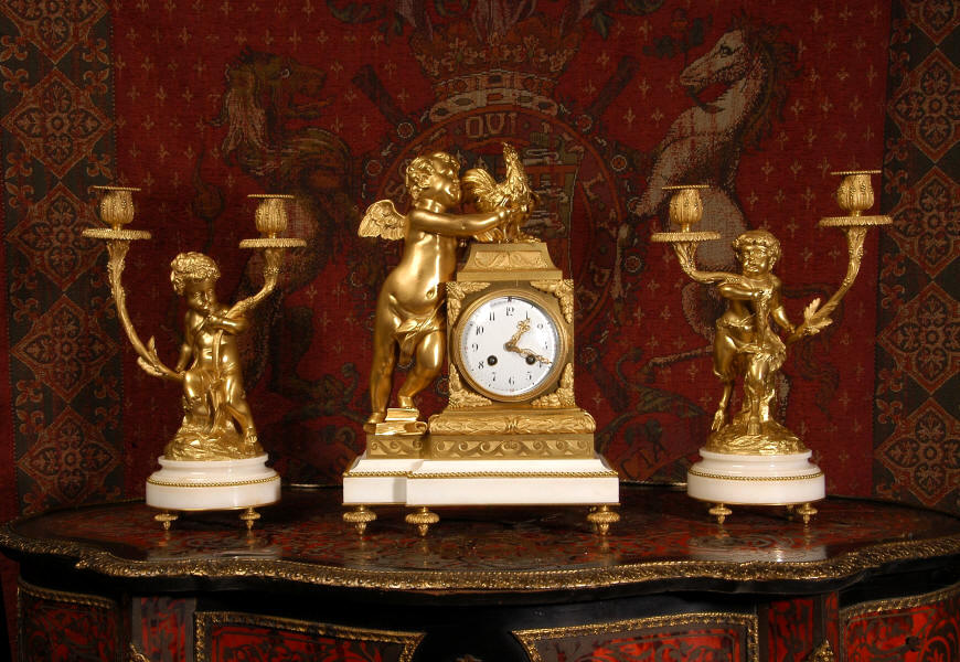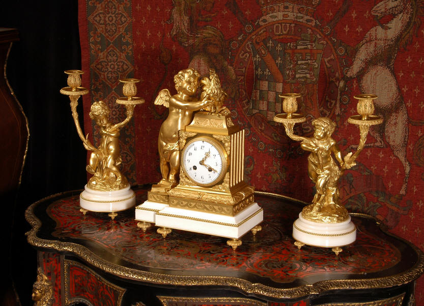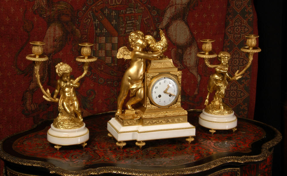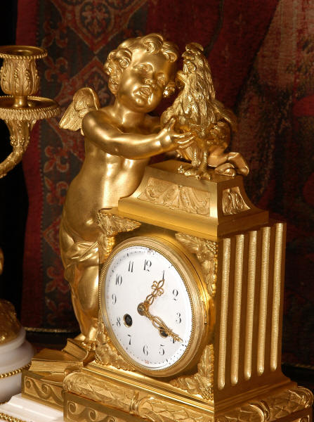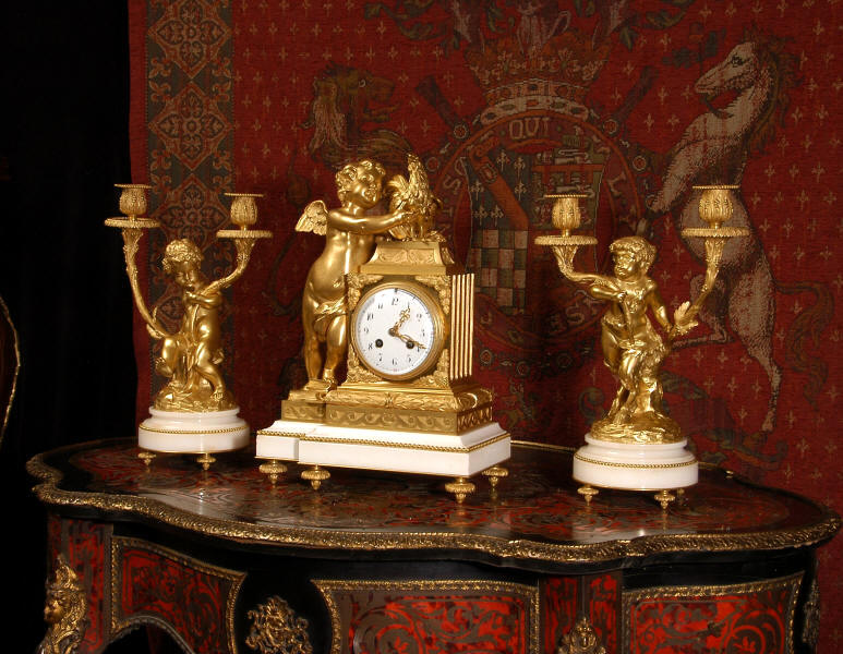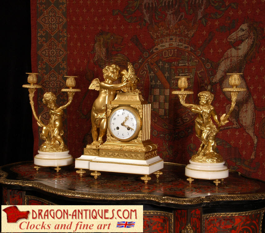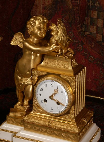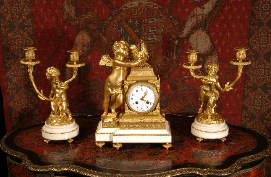 ~ French - Circa 1890 ~ ~~ Excellent condition, fully overhauled and running ~~ A very fine and stunning ormolu (finely gilded bronze) and white marble clock set in the Louis XVI style. Exquisitely modelled, this is a large, heavy and finely detailed set. It features a putto standing on a pile of books, playfully grabbing a cockerel or rooster 'le coq gaulois', the symbol of the French nation and also symbolising alertness. The candelabra are formed as cherubs, one as a young faun, holding the candelabra branches, formed as foliage. The quality of the bronze is superb, beautifully cast and chased and with a lovely original gild with a good colour. The bases of each piece have the 'Unis' foundry or exporters mark. Marble is a lovely creamy white colour with a good polish. The dial is enamel on copper with a cast brass centre and is complete with original finely fretted gilt brass hands. The French movement is of high quality and has the Vincenti mark on the movement backplate. It is in excellent clean and running condition having been fully serviced by our clockmaker. Pendulum is original. It runs for 8 days and strikes the hours and halves on a large bell. Click the video clip below to hear the bell and watch the clock running! Condition of the case is