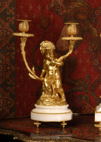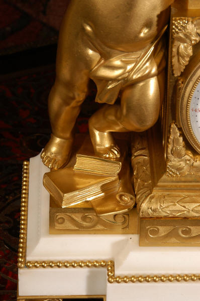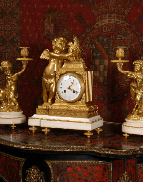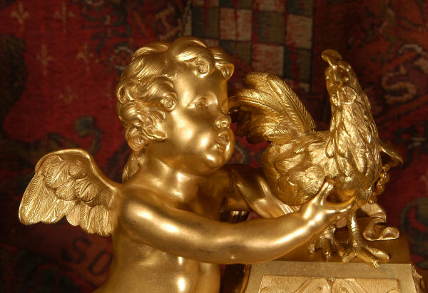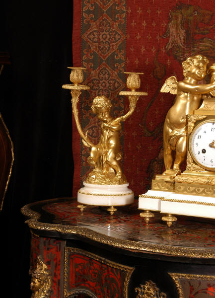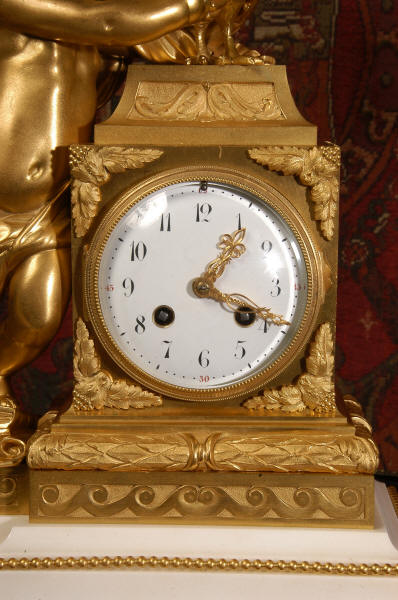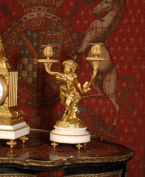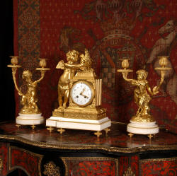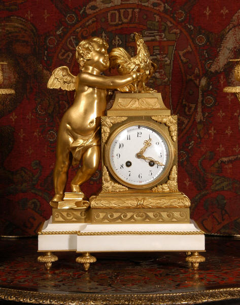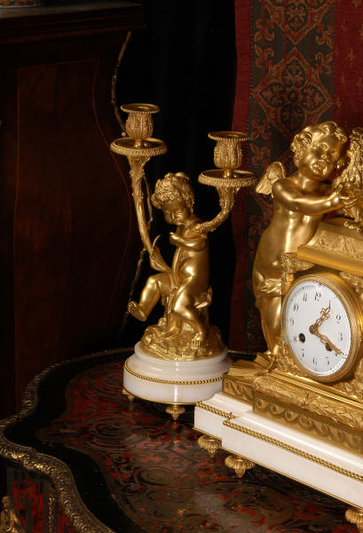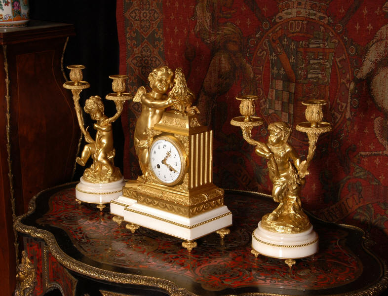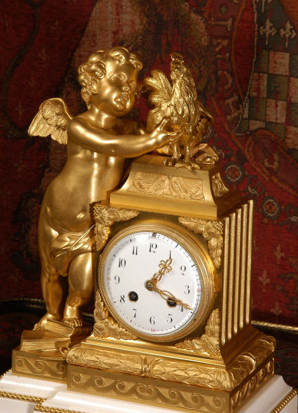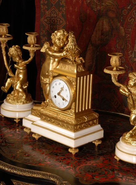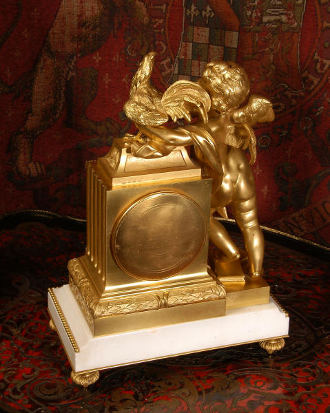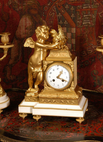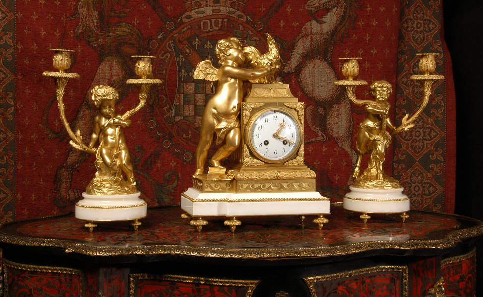 ~ French - Circa 1890 ~ ~~ Excellent condition, fully overhauled and running ~~ A very fine and stunning ormolu (finely gilded bronze) and white marble clock set in the Louis XVI style. Exquisitely modelled, this is a large, heavy and finely detailed set. It features a putto standing on a pile of books, playfully grabbing a cockerel or rooster 'le coq gaulois', the symbol of the French nation and also symbolising alertness. The candelabra are formed as cherubs, one as a young faun, holding the candelabra branches, formed as foliage. The quality of the bronze is superb, beautifully cast and chased and with a lovely original gild with a good colour. The bases of each piece have the 'Unis' foundry or exporters mark. Marble is a lovely creamy white colour with a good polish. The dial is enamel on copper with a cast brass centre and is complete with original finely fretted gilt brass hands. The French movement is of high quality and has the Vincenti mark on the movement backplate. It is in excellent clean and running condition having been fully serviced by our clockmaker. Pendulum is original. It runs for 8 days and strikes the hours and halves on a large bell. Click the video clip below to hear the bell and watch the clock running! Condition of the case is