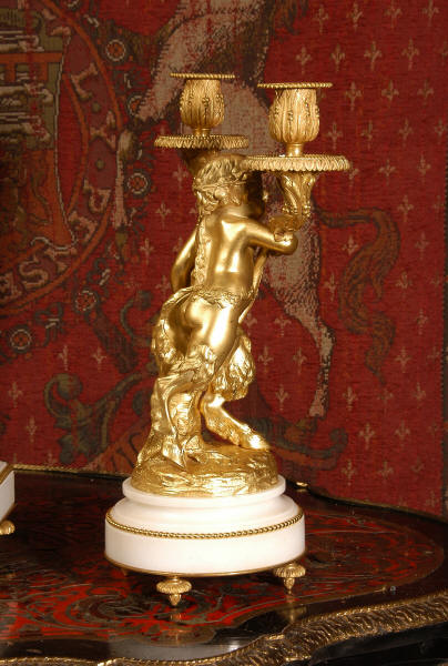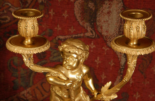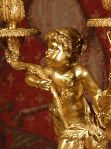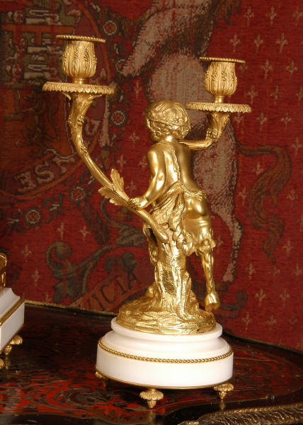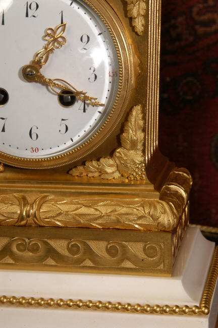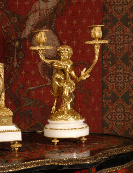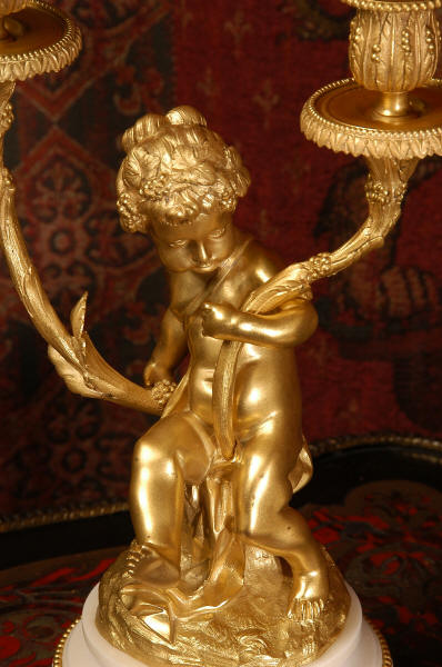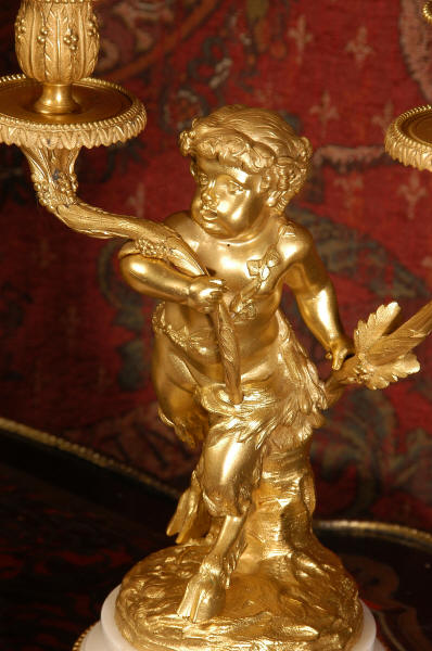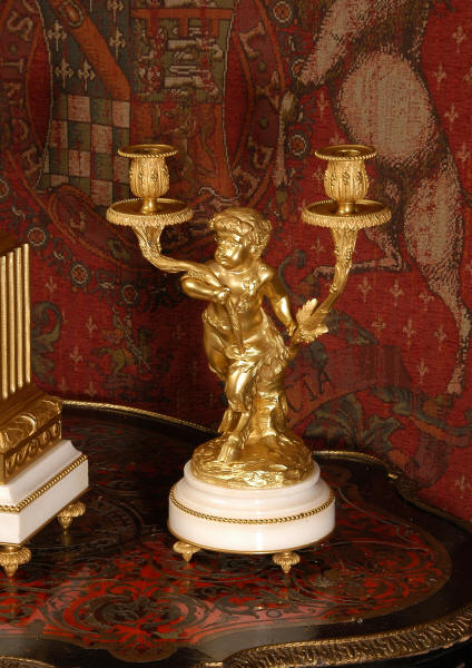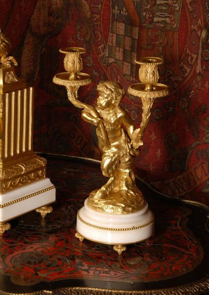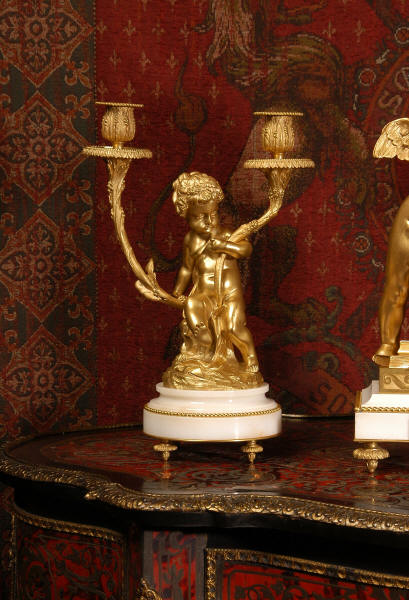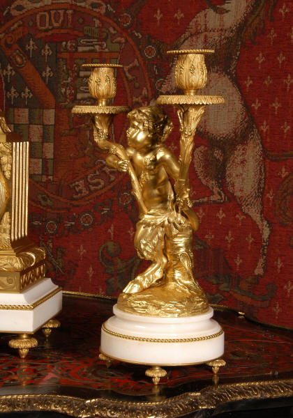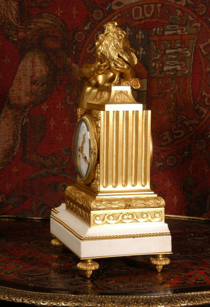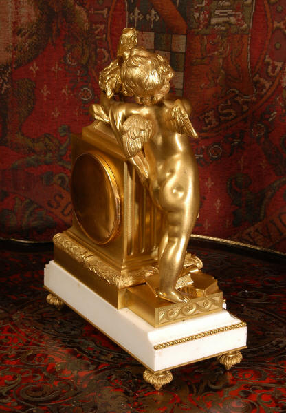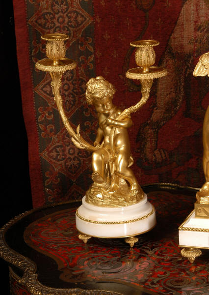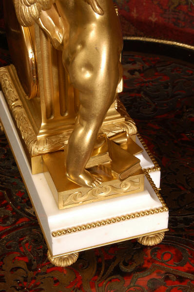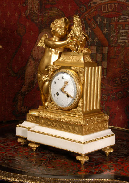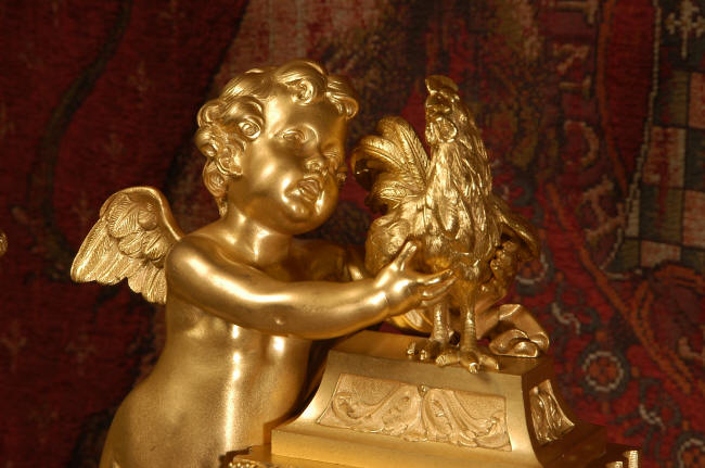 ~ French - Circa 1890 ~ ~~ Excellent condition, fully overhauled and running ~~ A very fine and stunning ormolu (finely gilded bronze) and white marble clock set in the Louis XVI style. Exquisitely modelled, this is a large, heavy and finely detailed set. It features a putto standing on a pile of books, playfully grabbing a cockerel or rooster 'le coq gaulois', the symbol of the French nation and also symbolising alertness. The candelabra are formed as cherubs, one as a young faun, holding the candelabra branches, formed as foliage. The quality of the bronze is superb, beautifully cast and chased and with a lovely original gild with a good colour. The bases of each piece have the 'Unis' foundry or exporters mark. Marble is a lovely creamy white colour with a good polish. The dial is enamel on copper with a cast brass centre and is complete with original finely fretted gilt brass hands. The French movement is of high quality and has the Vincenti mark on the movement backplate. It is in excellent clean and running condition having been fully serviced by our clockmaker. Pendulum is original. It runs for 8 days and strikes the hours and halves on a large bell. Click the video clip below to hear the bell and watch the clock running! Condition of the case is