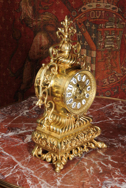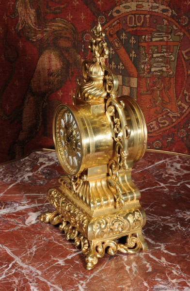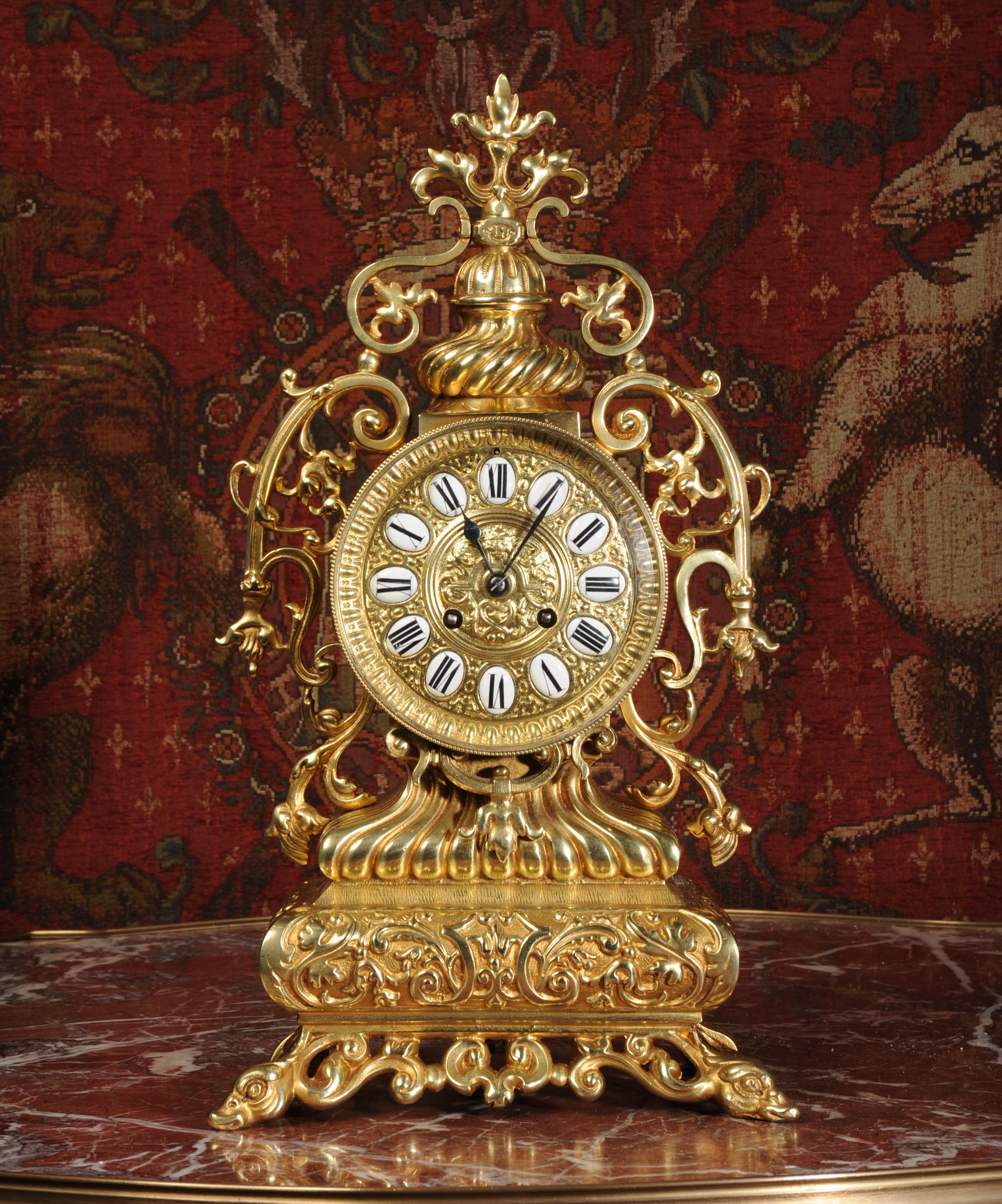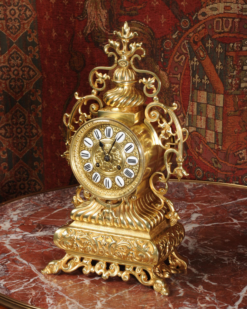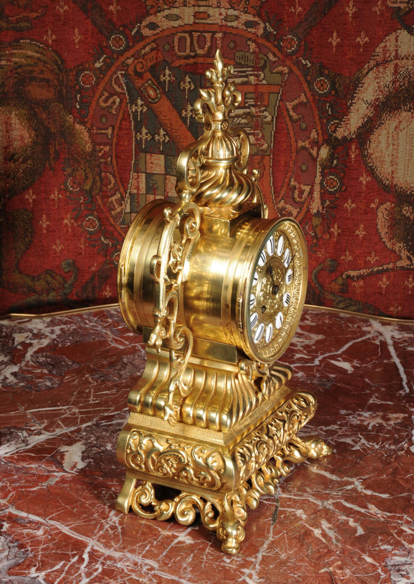 ~ French - Circa 1870 ~ ~~ Excellent condition, fully overhauled ~~ An original antique French drum head table clock of excellent quality, made in gilded brass. The large dial is mounted in the drum of the case, on a fluted stand which itself is mounted on a cushion shaped base. The base is decorated with incised blind fret work and the feet are styled as mythical sea creatures and waves. The drum has elaborate foliate decoration and an large fluted urn to the top. The rear door is glazed to allow the movement to be seen and so would be ideal to display on a table.