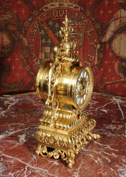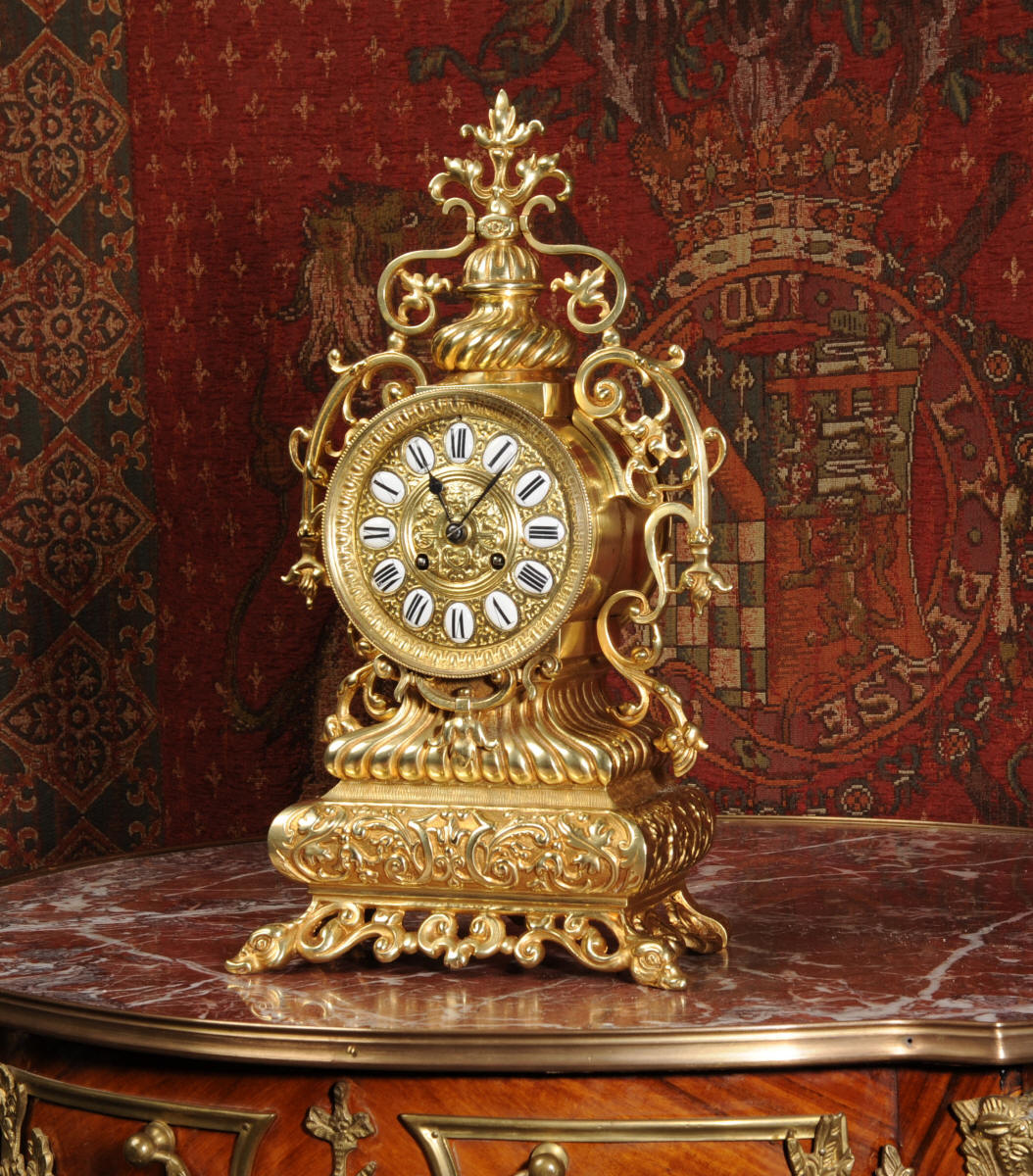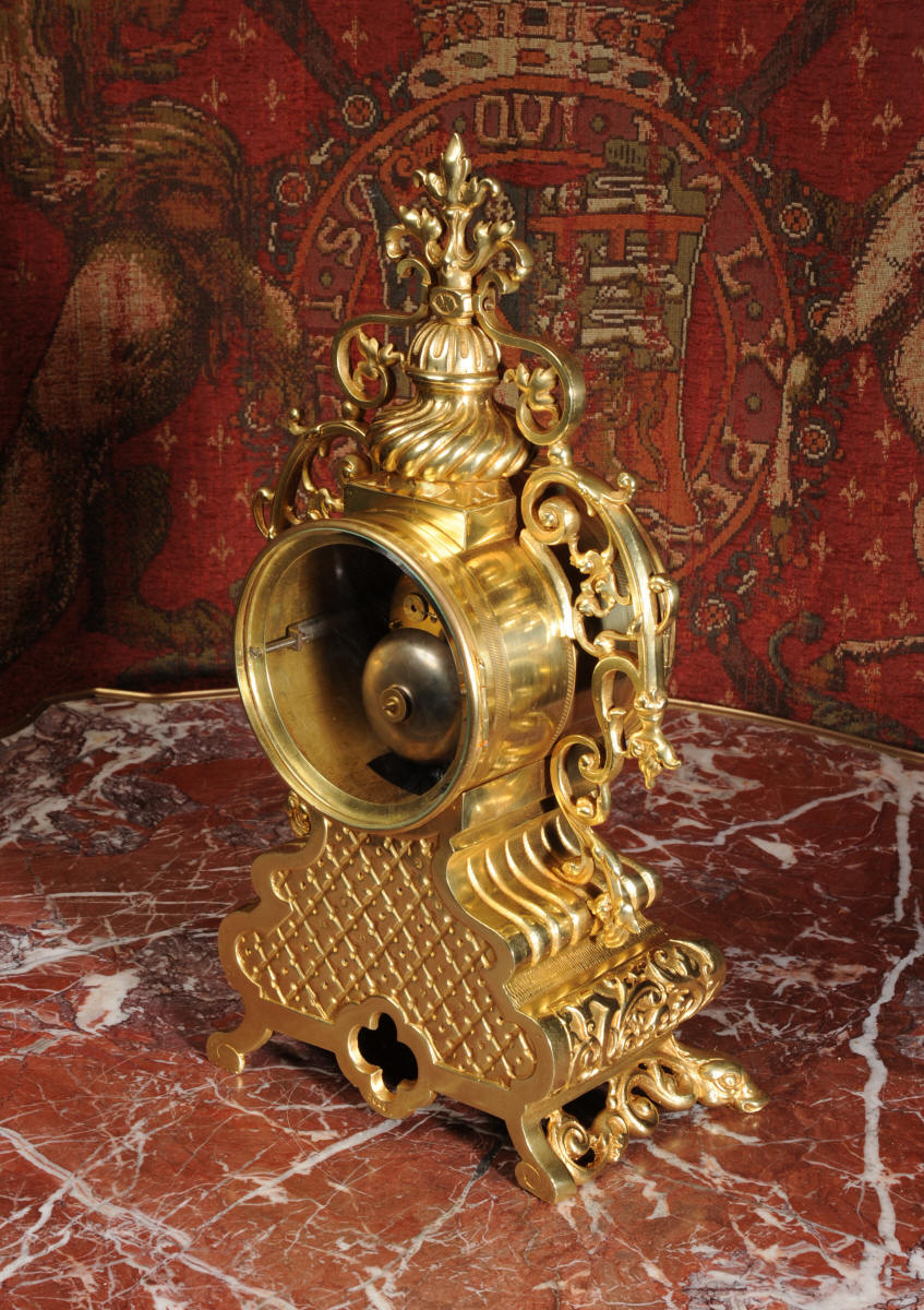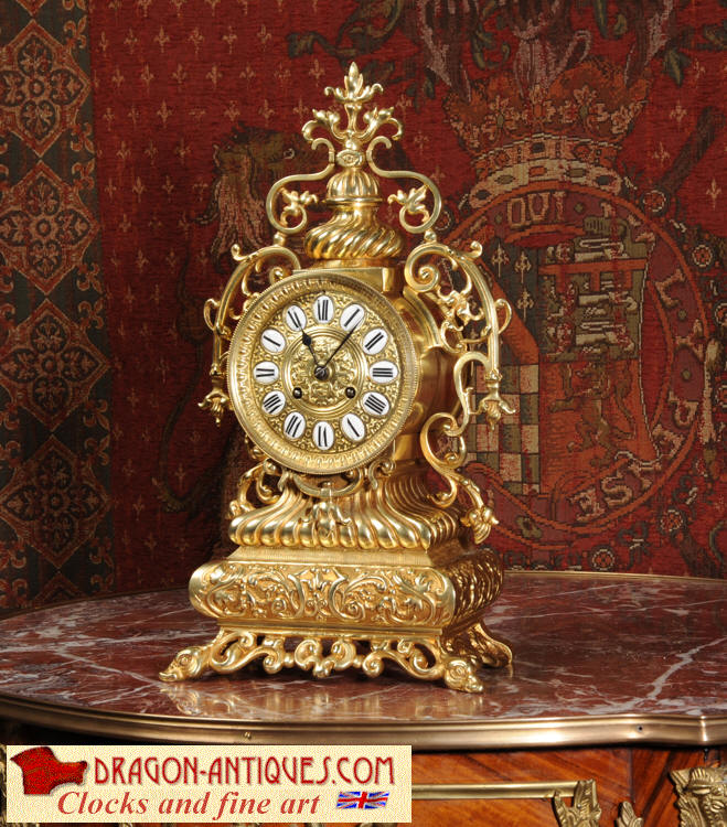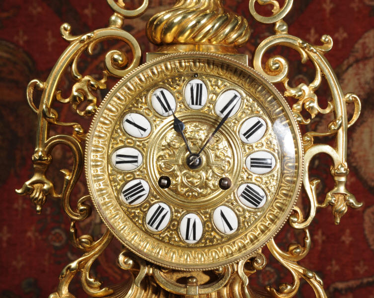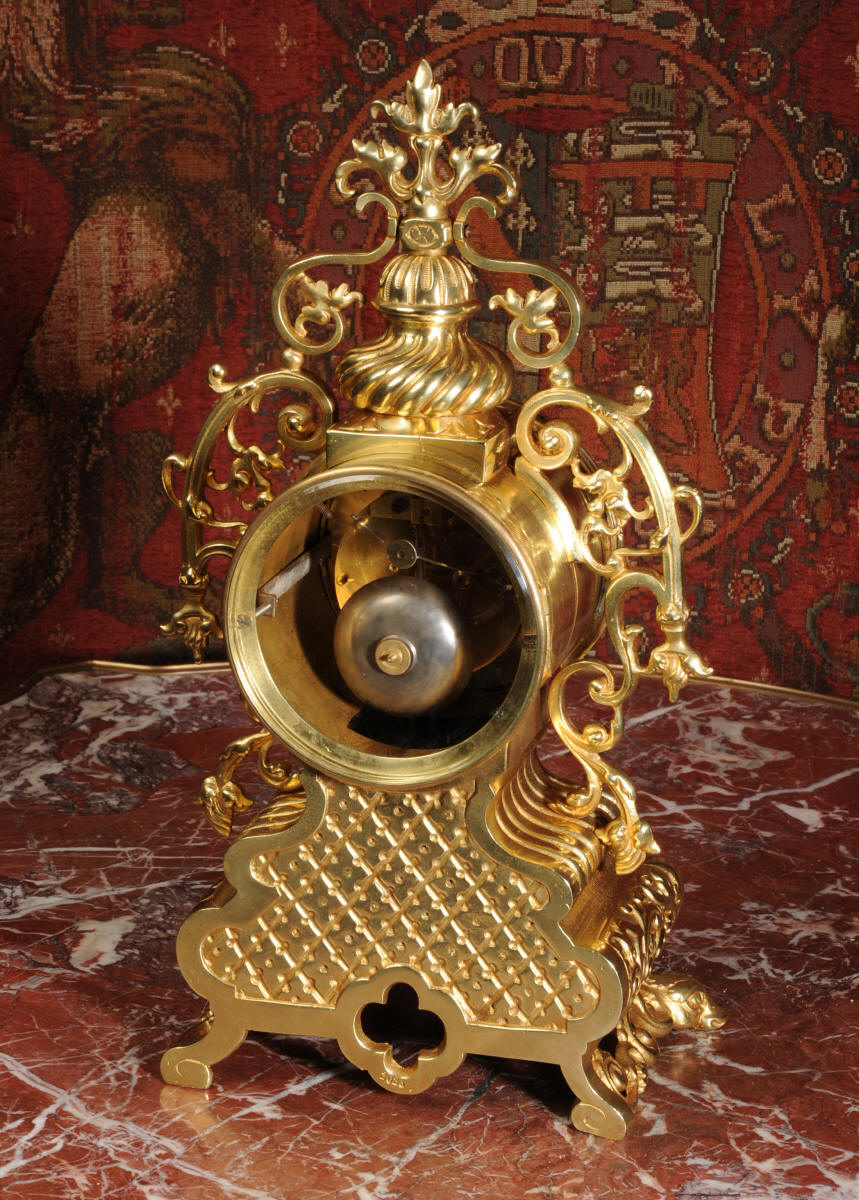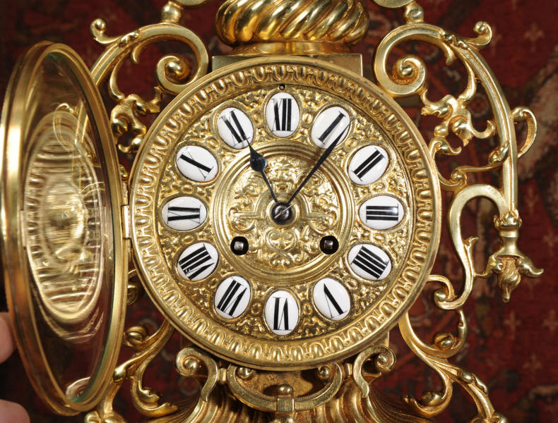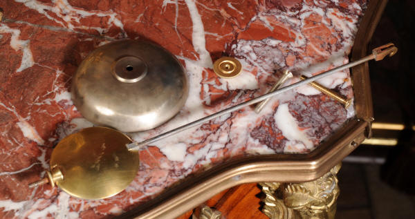 The dial is also gilt brass with 12 individual enamel cartouches and blued steel hands. The French movement is of high quality and is in excellent clean and running condition having been fully overhauled by our clockmaker. Pendulum is an old replacement. It runs for 8 days and strikes the hours and halves on a large sonorous bell. Click the video clip below to hear the bell and watch the clock running!