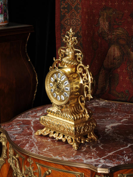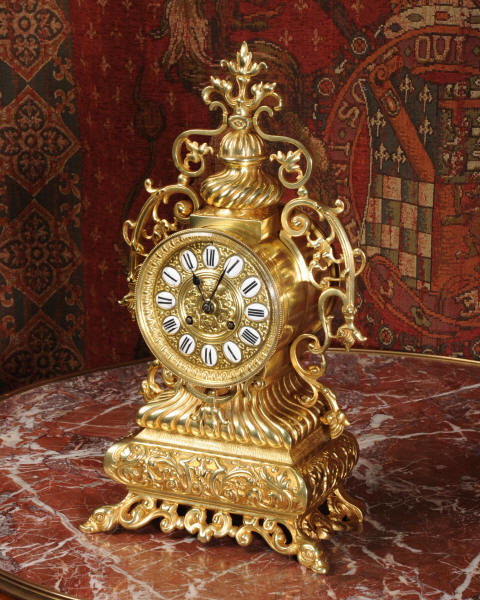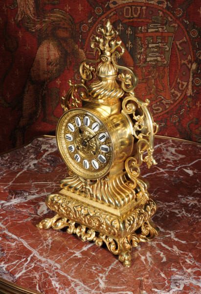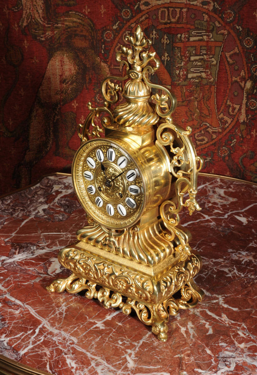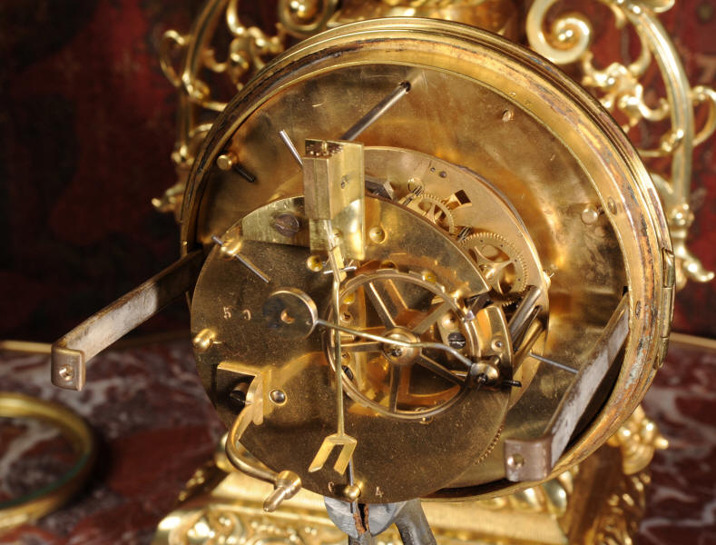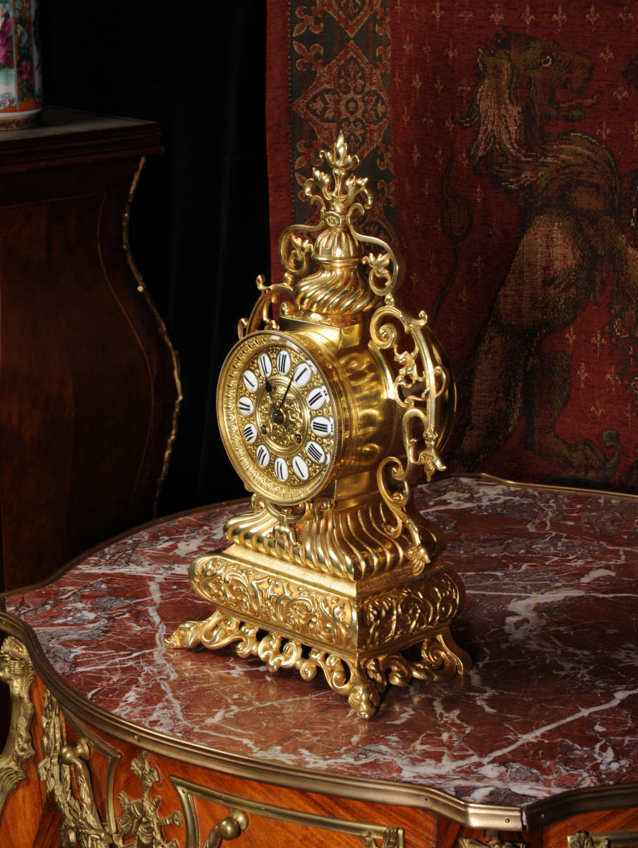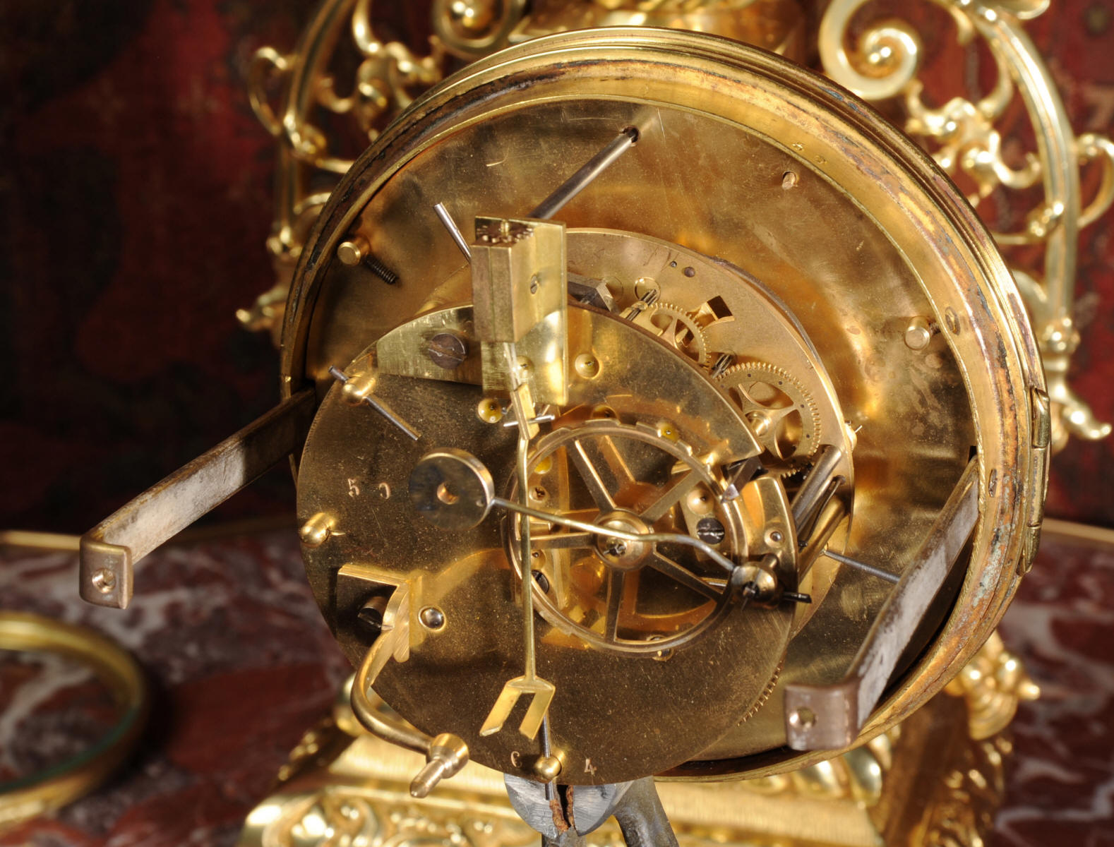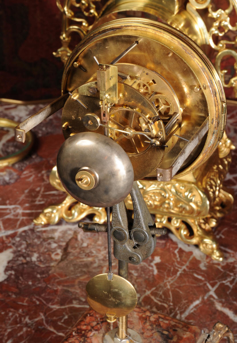 The dial is also gilt brass with 12 individual enamel cartouches and blued steel hands. The French movement is of high quality and is in excellent clean and running condition having been fully overhauled by our clockmaker. Pendulum is an old replacement. It runs for 8 days and strikes the hours and halves on a large sonorous bell. Click the video clip below to hear the bell and watch the clock running!