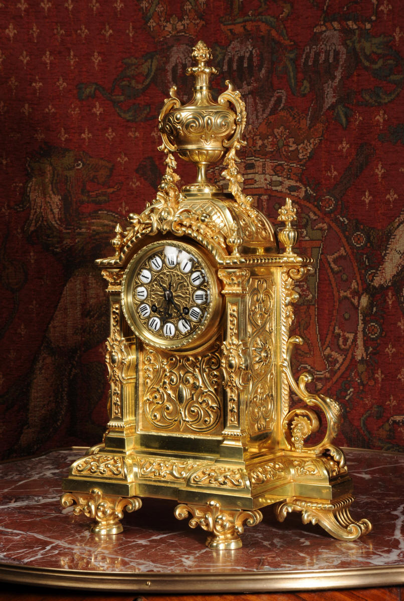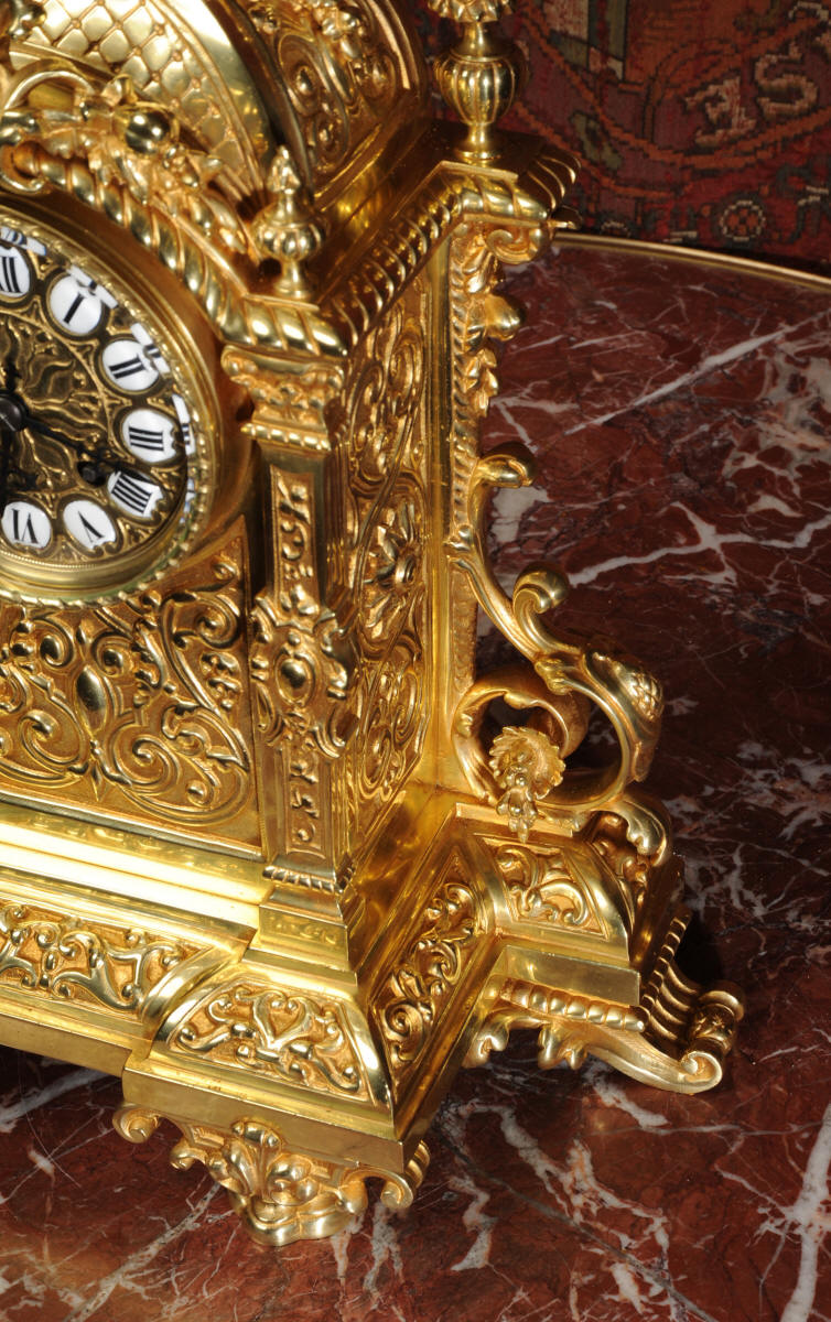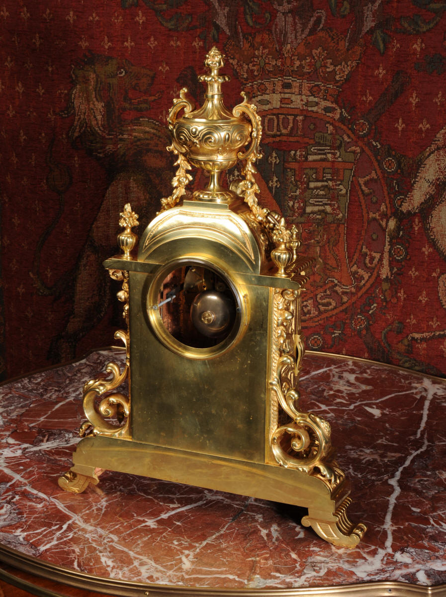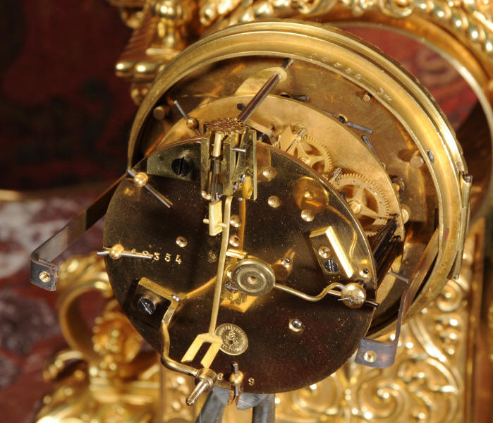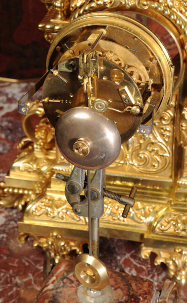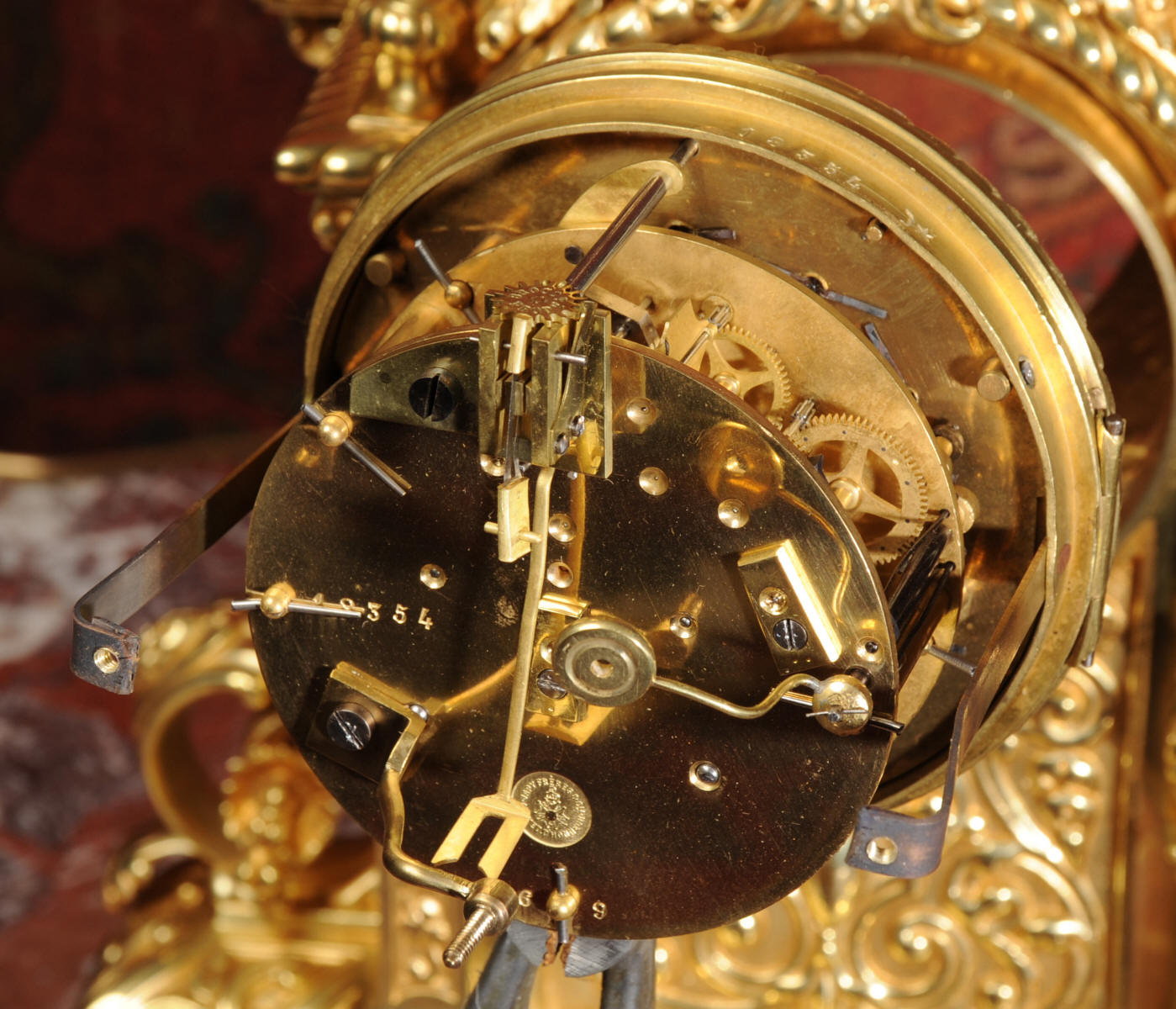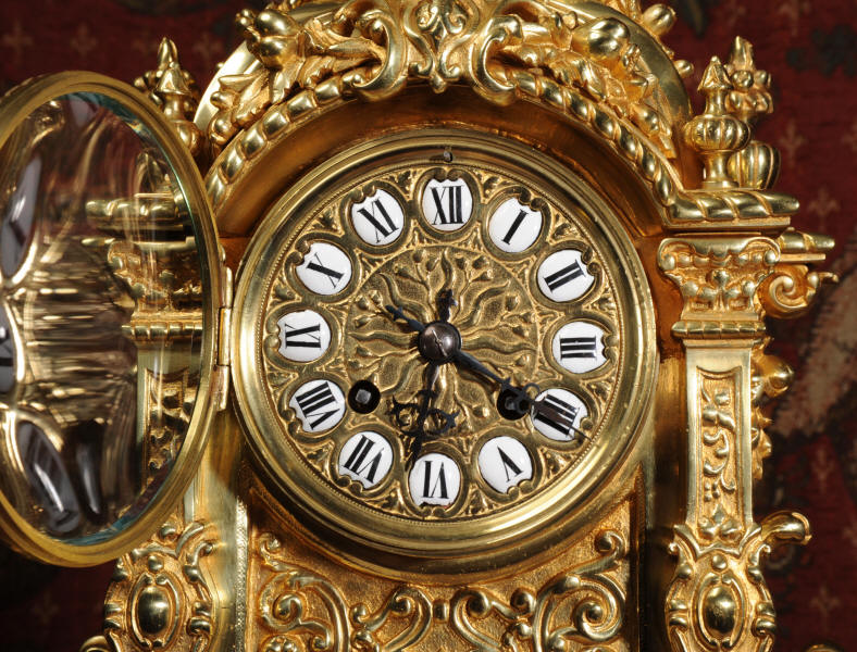 The dial is also gilt brass with 12 individual enamel cartouches and original blued steel hands. The bezel is fitted with convex, bevelled glass. The rear door is also glazed to allow the movement to be seen. The French movement is by Japy Freres and has the makers 'Grande Medaille D'Honneur' on the backplate. It is of high quality and is in excellent clean and running condition having been fully overhauled by our clockmaker. Pendulum is a replacement. It runs for 8 days and strikes the hours and halves on a bell. Click the video clip below to hear the bell and watch the clock running! Condition of the case is excellent, the original gilding is beautifully clean and bright with hardly any wear or discolouration and there are no losses. The dial is also in excellent condition just an occasional tiny nibble to the cartouches.