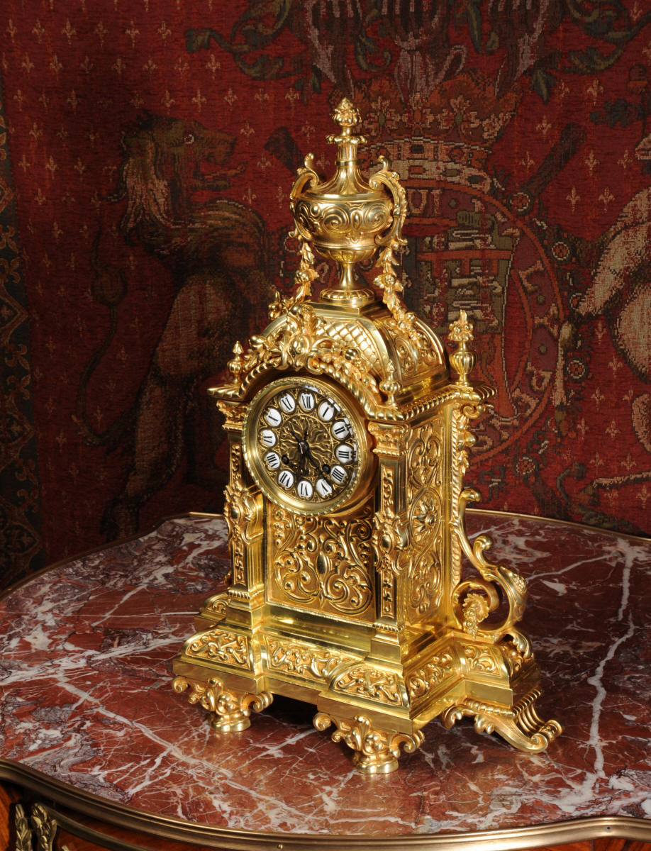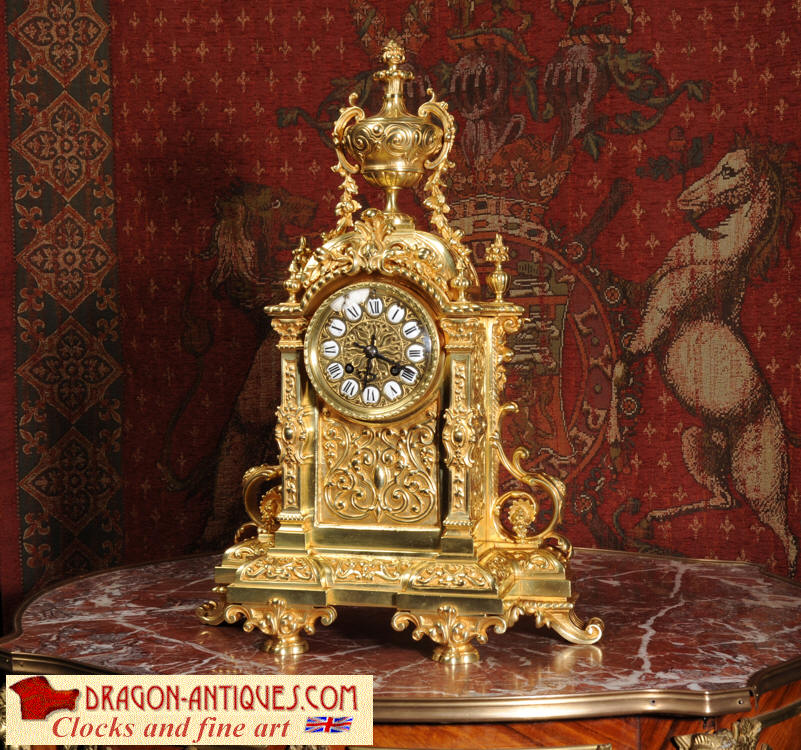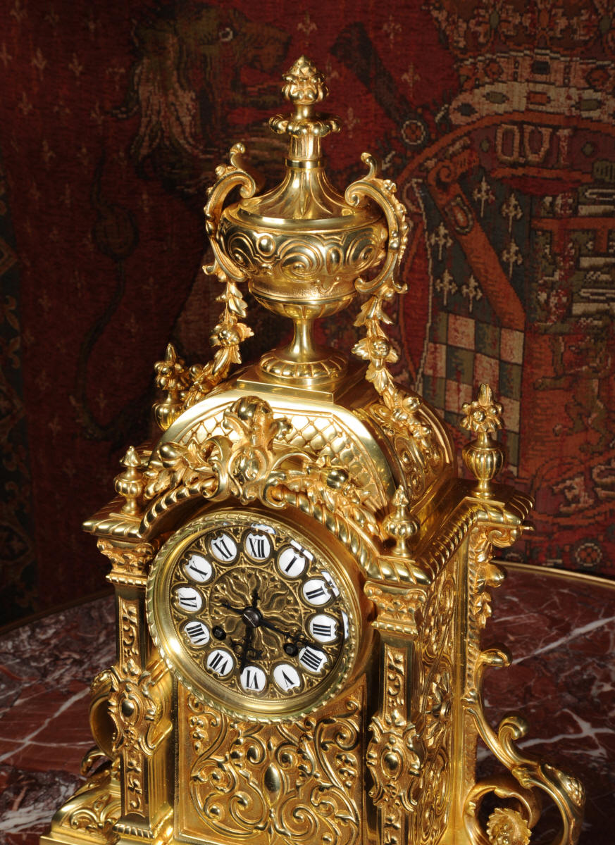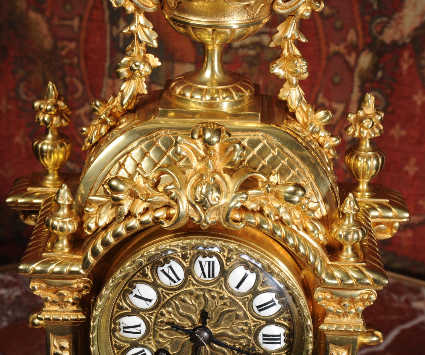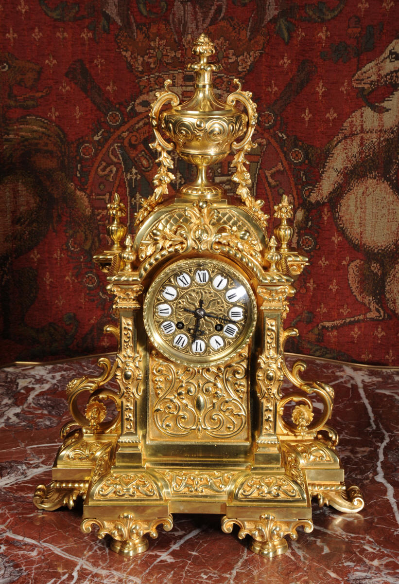 The dial is also gilt brass with 12 individual enamel cartouches and original blued steel hands. The bezel is fitted with convex, bevelled glass. The rear door is also glazed to allow the movement to be seen. The French movement is by Japy Freres and has the makers 'Grande Medaille D'Honneur' on the backplate. It is of high quality and is in excellent clean and running condition having been fully overhauled by our clockmaker. Pendulum is a replacement. It runs for 8 days and strikes the hours and halves on a bell. Click the video clip below to hear the bell and watch the clock running! Condition of the case is excellent, the original gilding is beautifully clean and bright with hardly any wear or discolouration and there are no losses. The dial is also in excellent condition just an occasional tiny nibble to the cartouches.