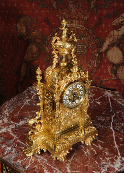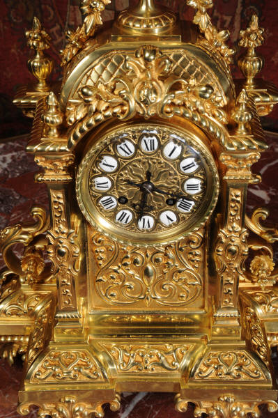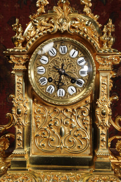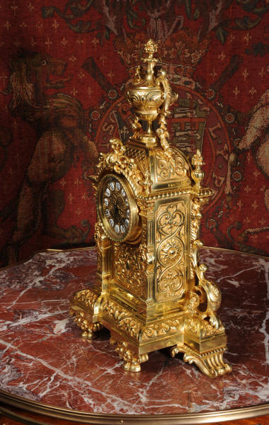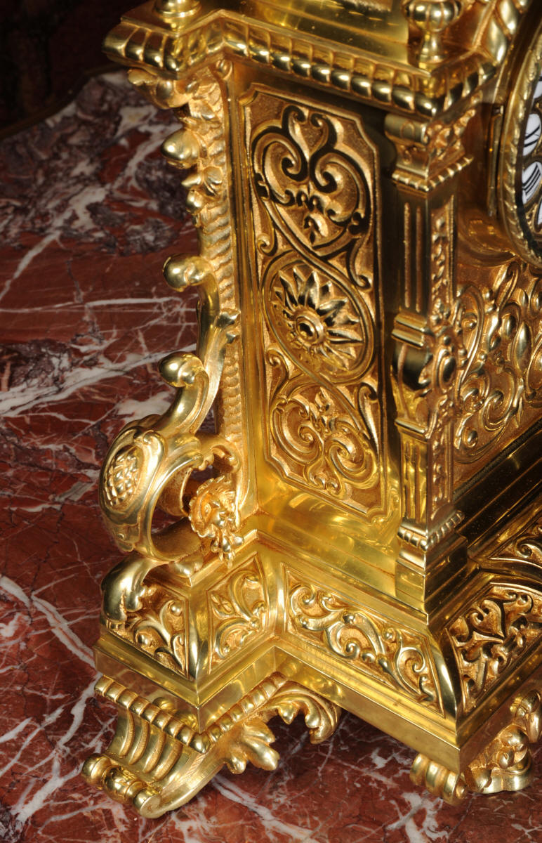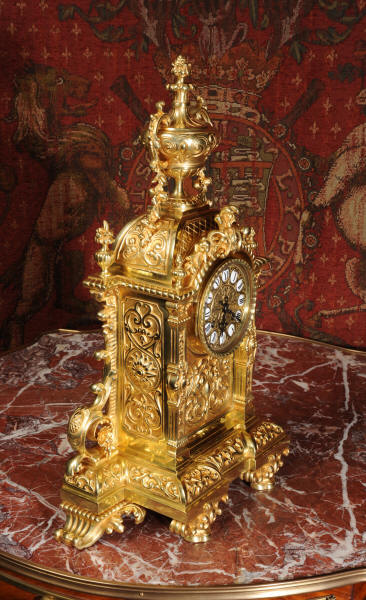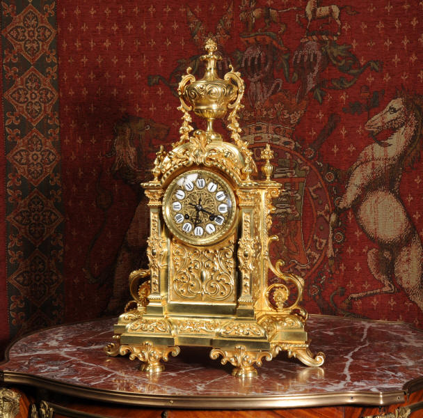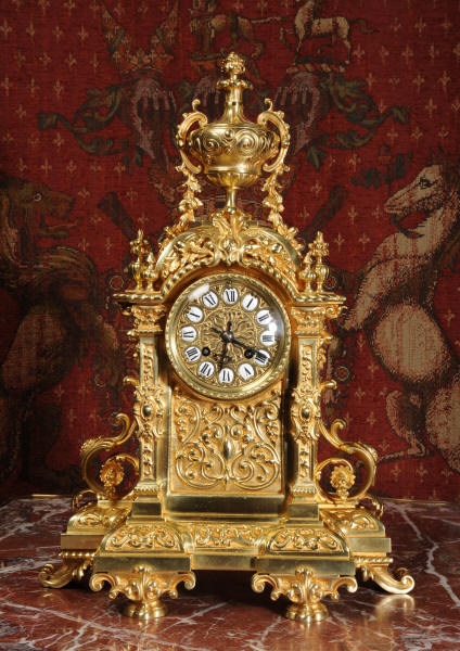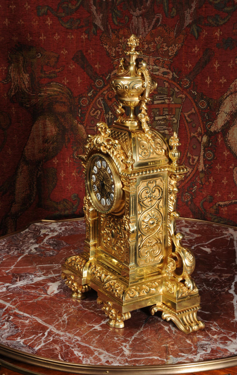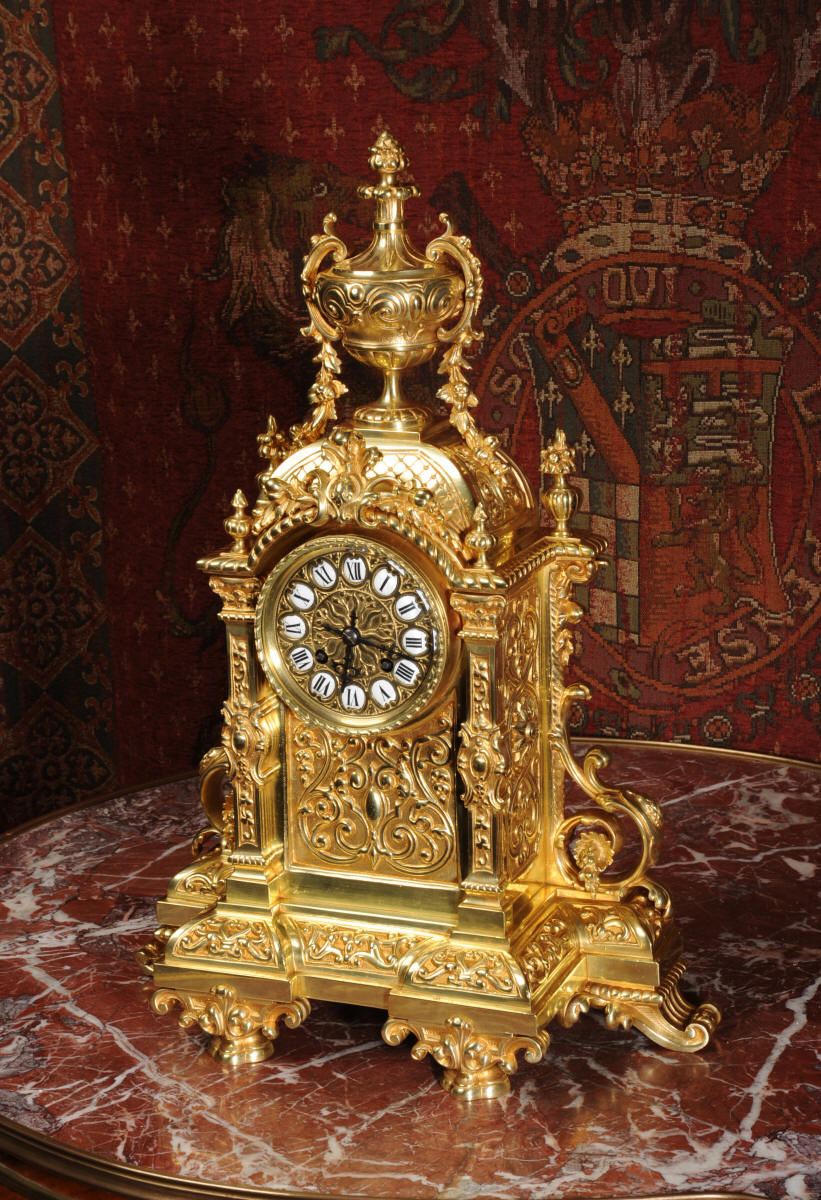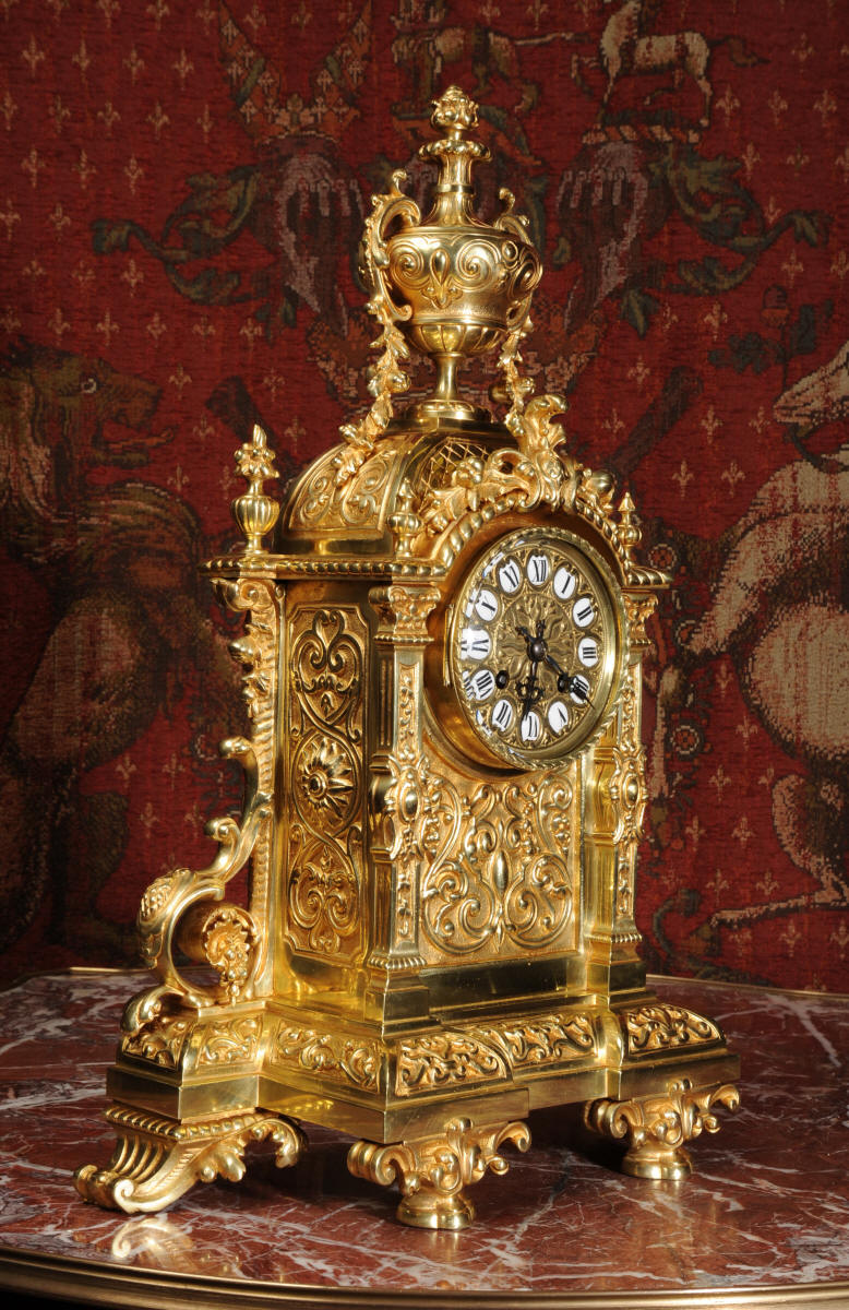 The dial is also gilt brass with 12 individual enamel cartouches and original blued steel hands. The bezel is fitted with convex, bevelled glass. The rear door is also glazed to allow the movement to be seen. The French movement is by Japy Freres and has the makers 'Grande Medaille D'Honneur' on the backplate. It is of high quality and is in excellent clean and running condition having been fully overhauled by our clockmaker. Pendulum is a replacement. It runs for 8 days and strikes the hours and halves on a bell. Click the video clip below to hear the bell and watch the clock running! Condition of the case is excellent, the original gilding is beautifully clean and bright with hardly any wear or discolouration and there are no losses. The dial is also in excellent condition just an occasional tiny nibble to the cartouches.