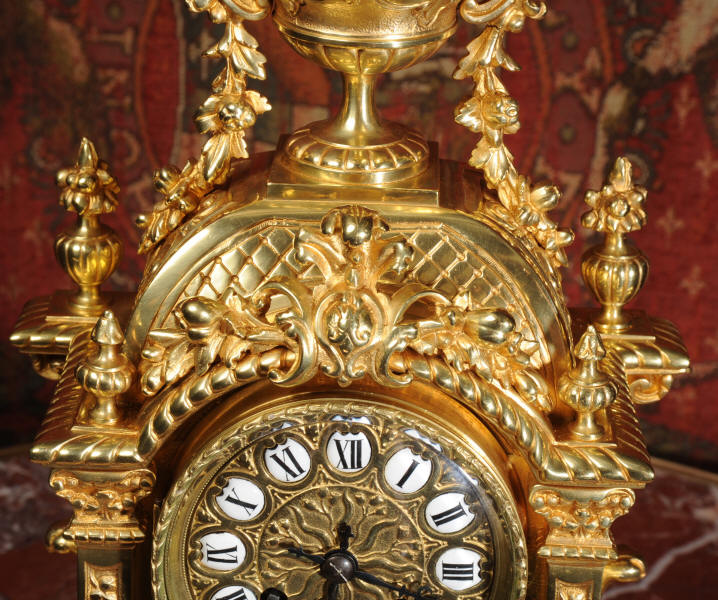 ~ French - Circa 1870 ~ ~~ Excellent condition, fully overhauled ~~ A lovely, top quality original antique French clock from the famous maker Japy Freres. It is classical Louis XVI in style, architectural in shape with the movement mounted above an elaborate panel flanked by columns. The domed top is surmounted by a large urn with trailing foliage. The whole case is profusely decorated with floral foliage and acanthus and sits on acanthus bracket feet. It is a heavy clock, beautifully modelled and finished with a good original gild.