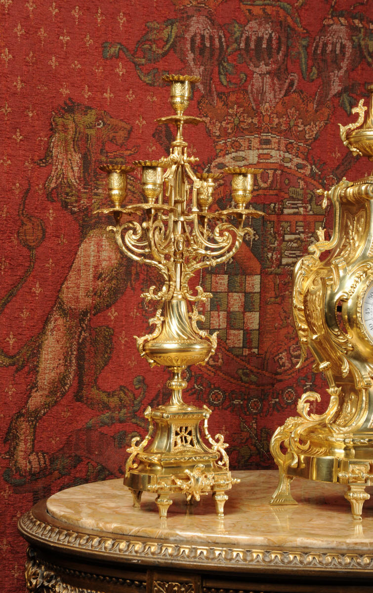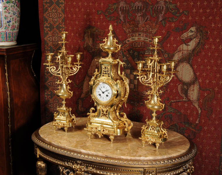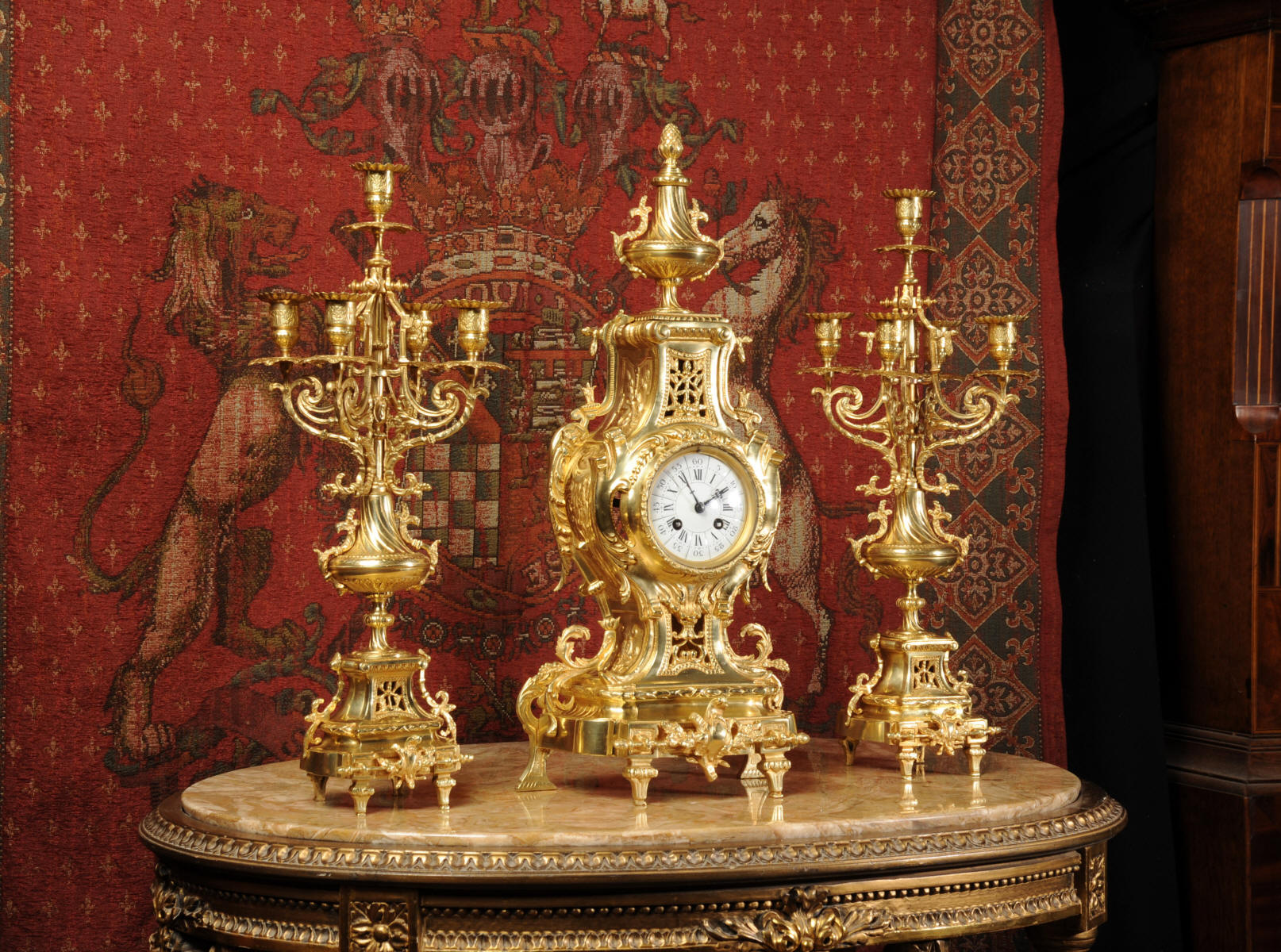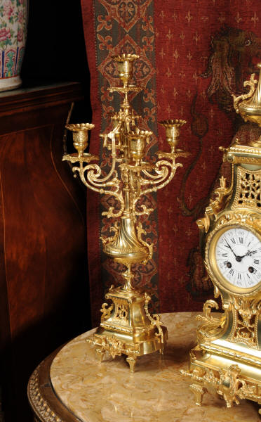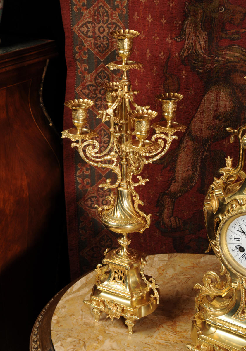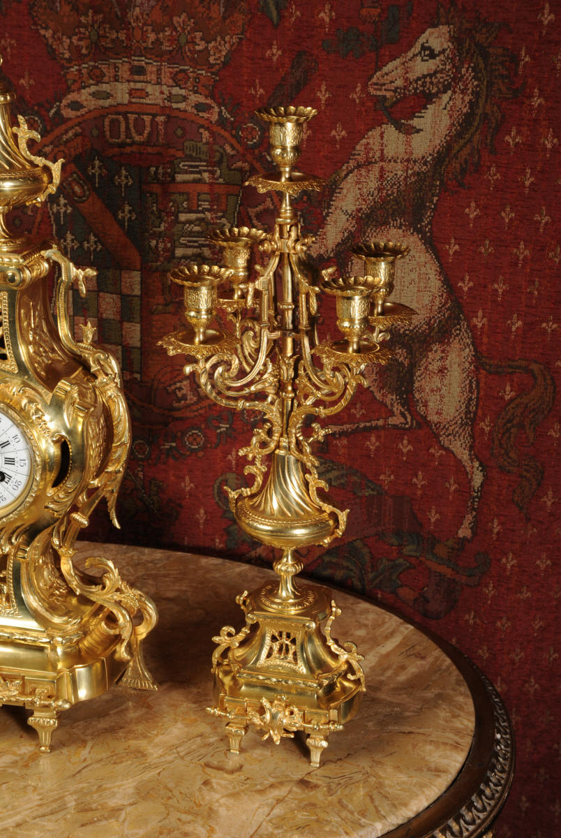 Condition of the case is excellent, the original gilding is beautifully clean and bright with hardly any wear or discolouration and there are no losses. The dial is also in excellent condition just some tiny nibbles next to the winding holes. Candelabra are slightly distorted and some of the nozzles have some slight splitting. Some of the candelabra arms have a break in the design but they are still strong and complete. The set makes a stunning display as you can see below.