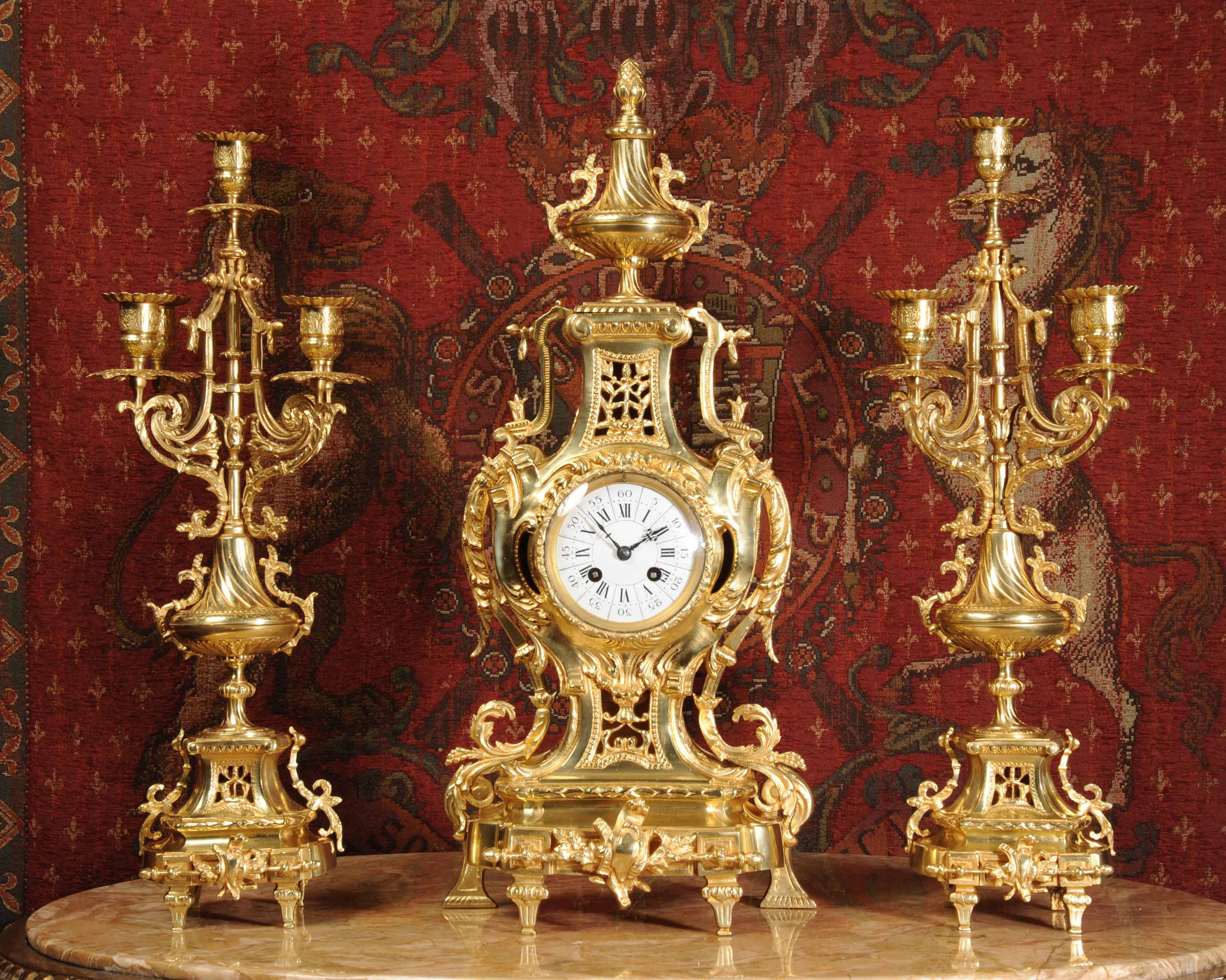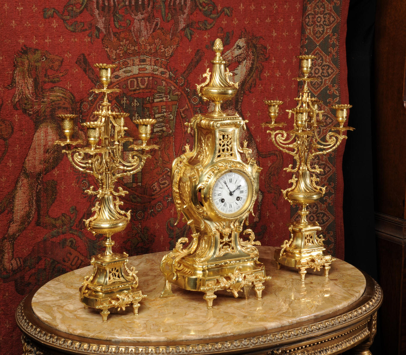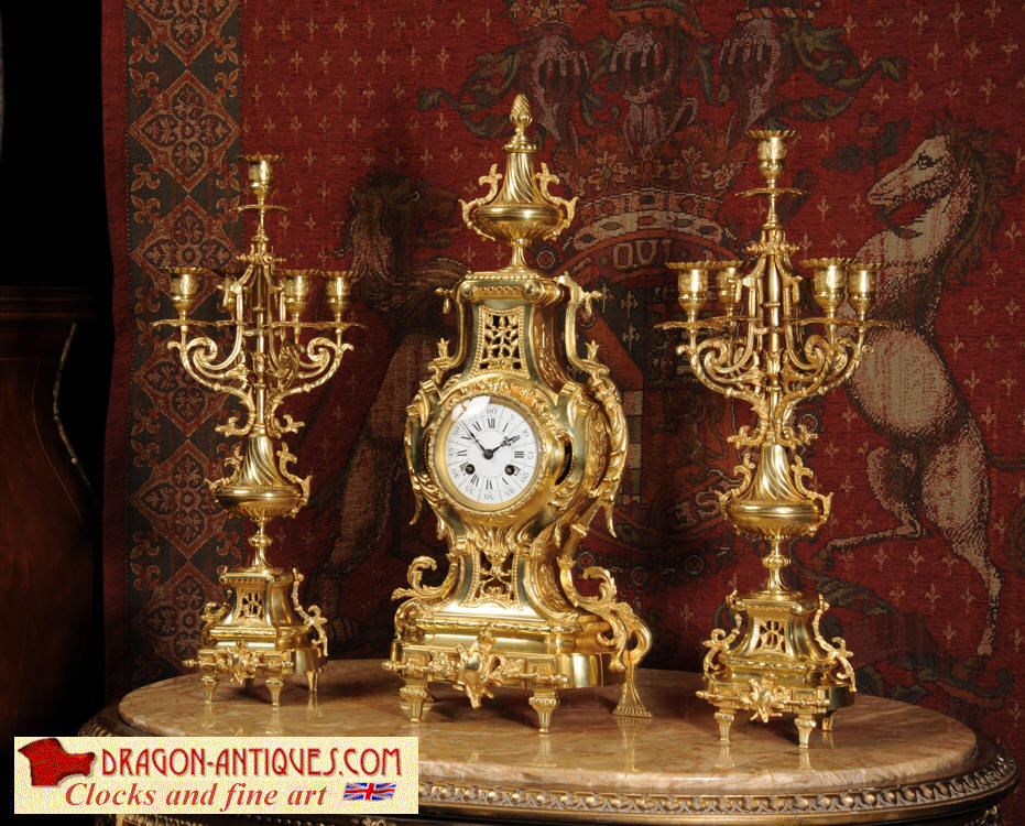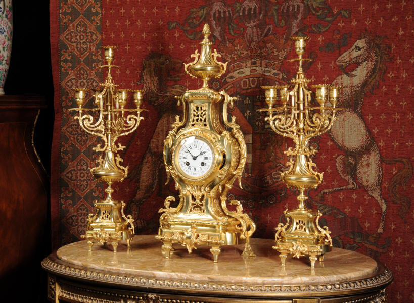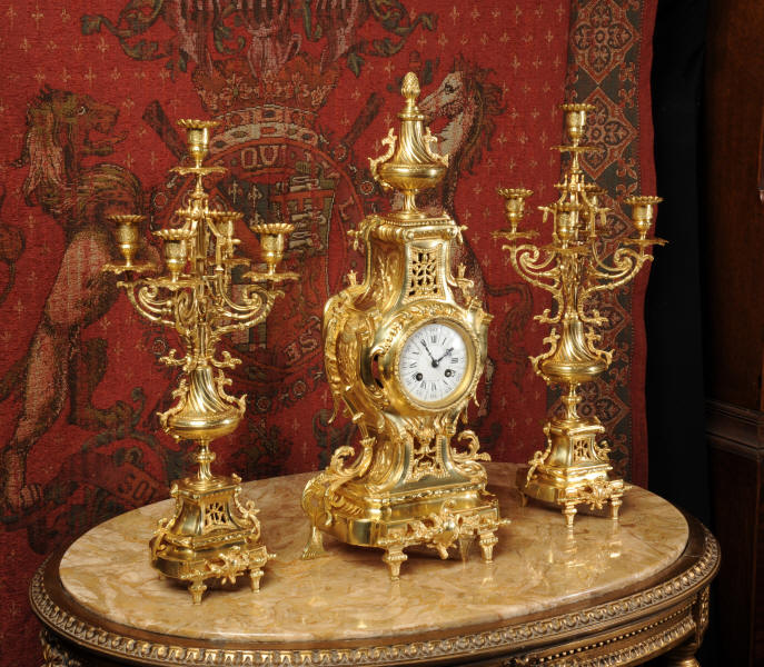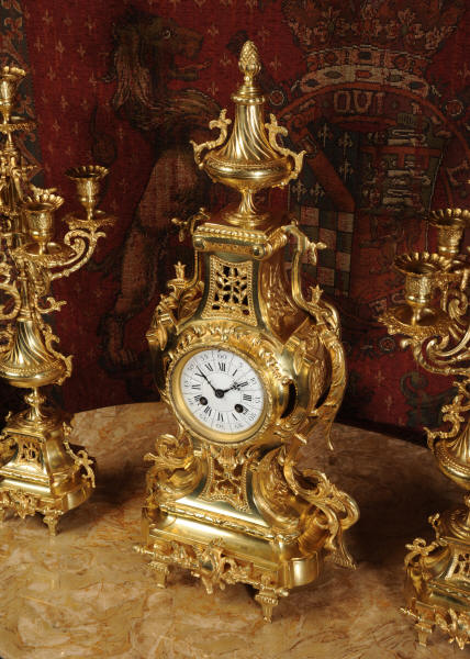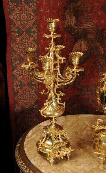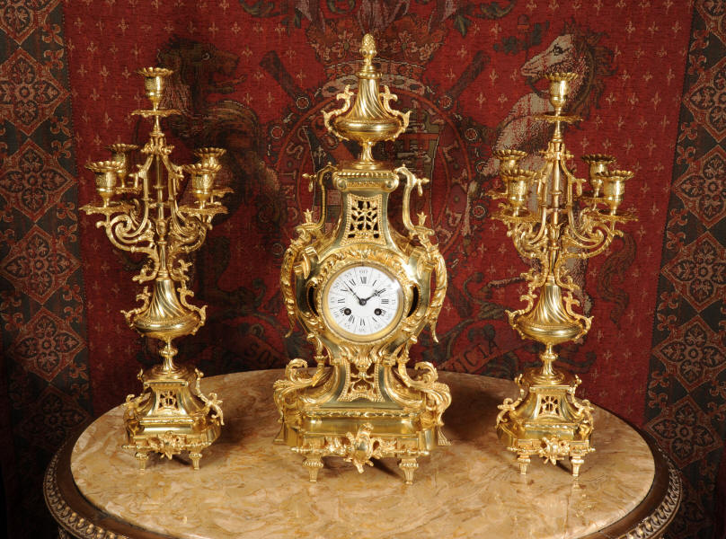 Condition of the case is excellent, the original gilding is beautifully clean and bright with hardly any wear or discolouration and there are no losses. The dial is also in excellent condition just some tiny nibbles next to the winding holes. Candelabra are slightly distorted and some of the nozzles have some slight splitting. Some of the candelabra arms have a break in the design but they are still strong and complete. The set makes a stunning display as you can see below.