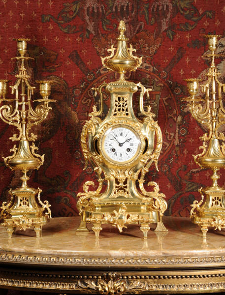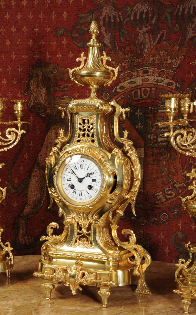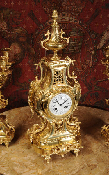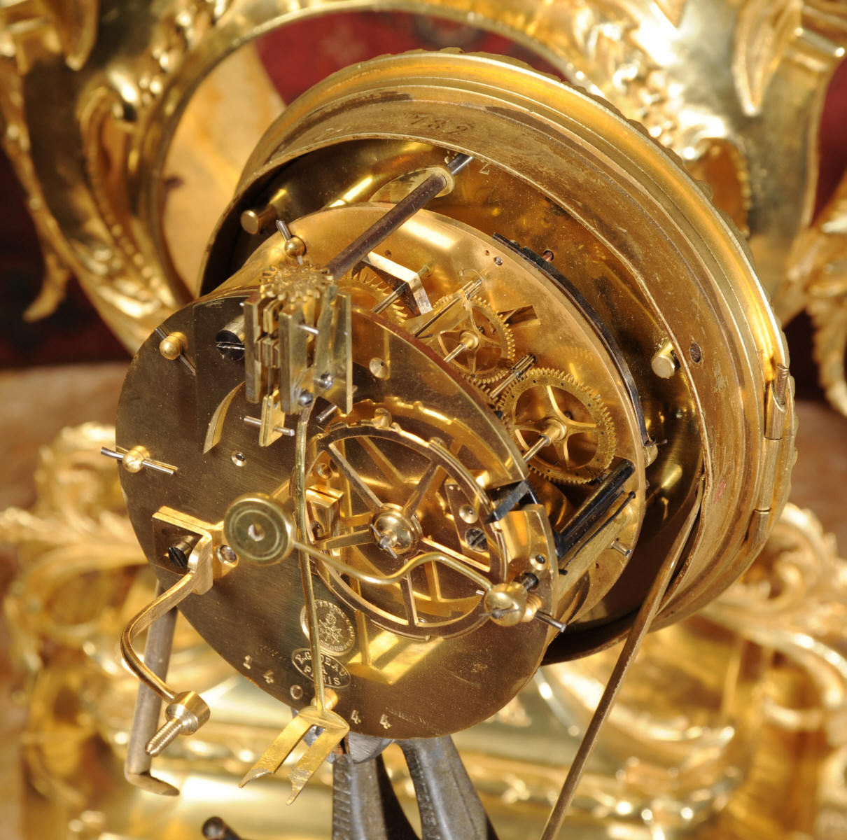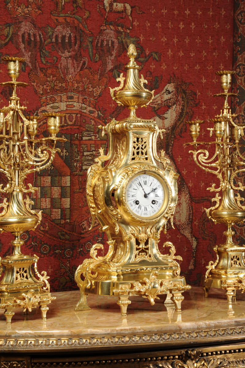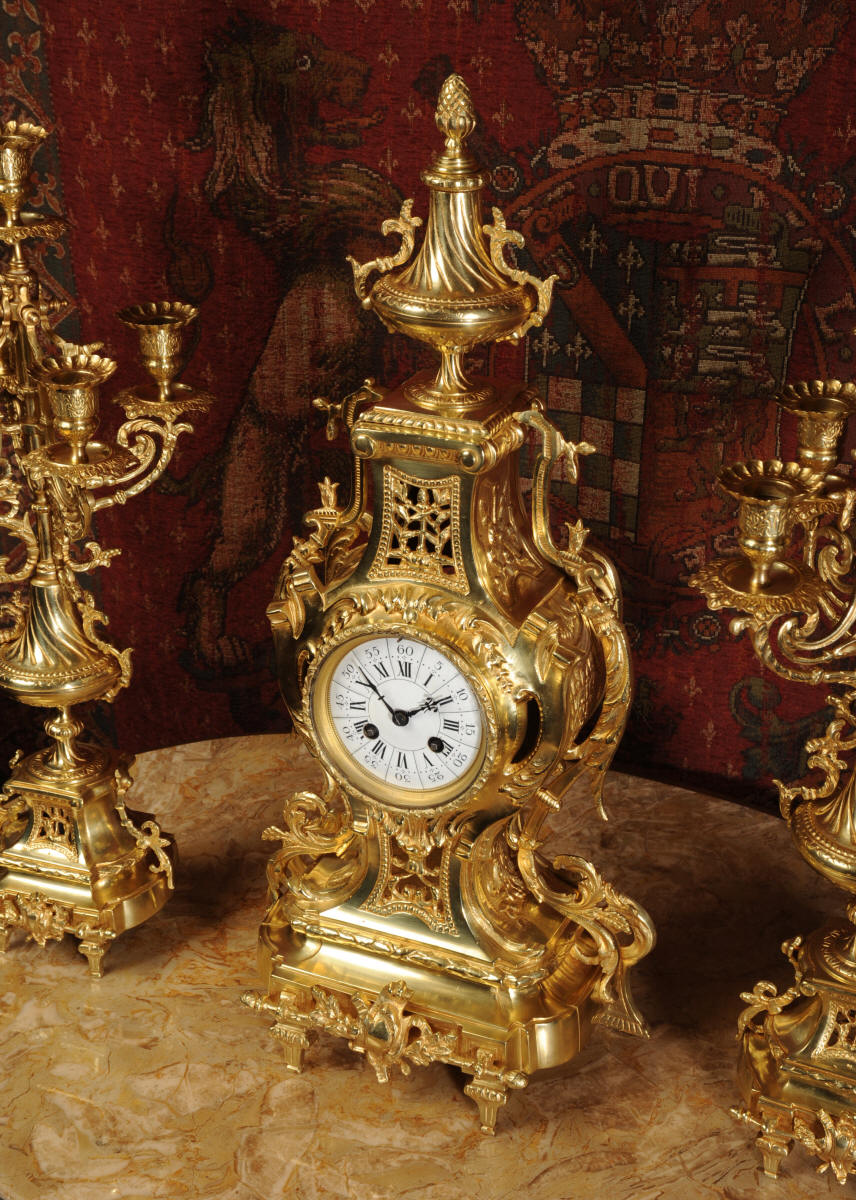 Condition of the case is excellent, the original gilding is beautifully clean and bright with hardly any wear or discolouration and there are no losses. The dial is also in excellent condition just some tiny nibbles next to the winding holes. Candelabra are slightly distorted and some of the nozzles have some slight splitting. Some of the candelabra arms have a break in the design but they are still strong and complete. The set makes a stunning display as you can see below.