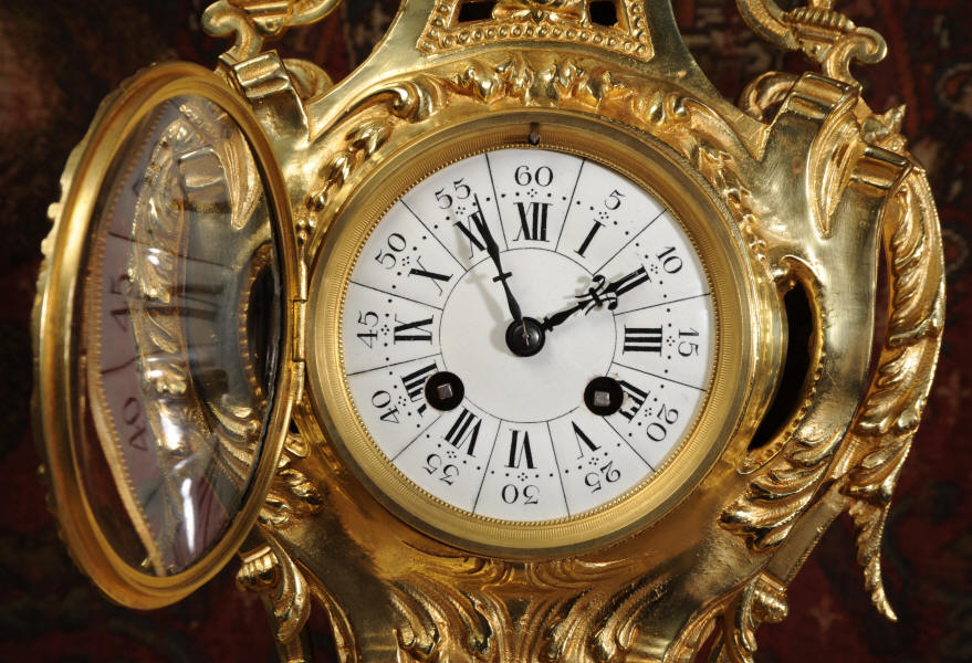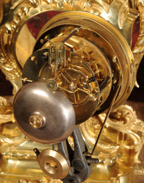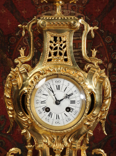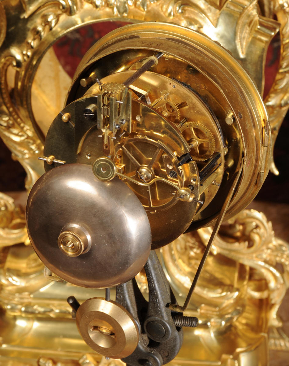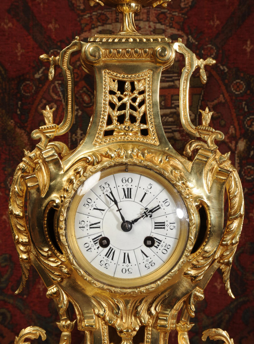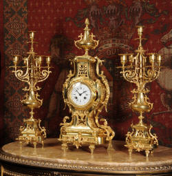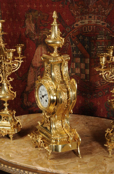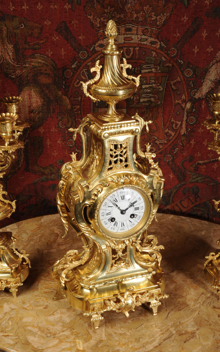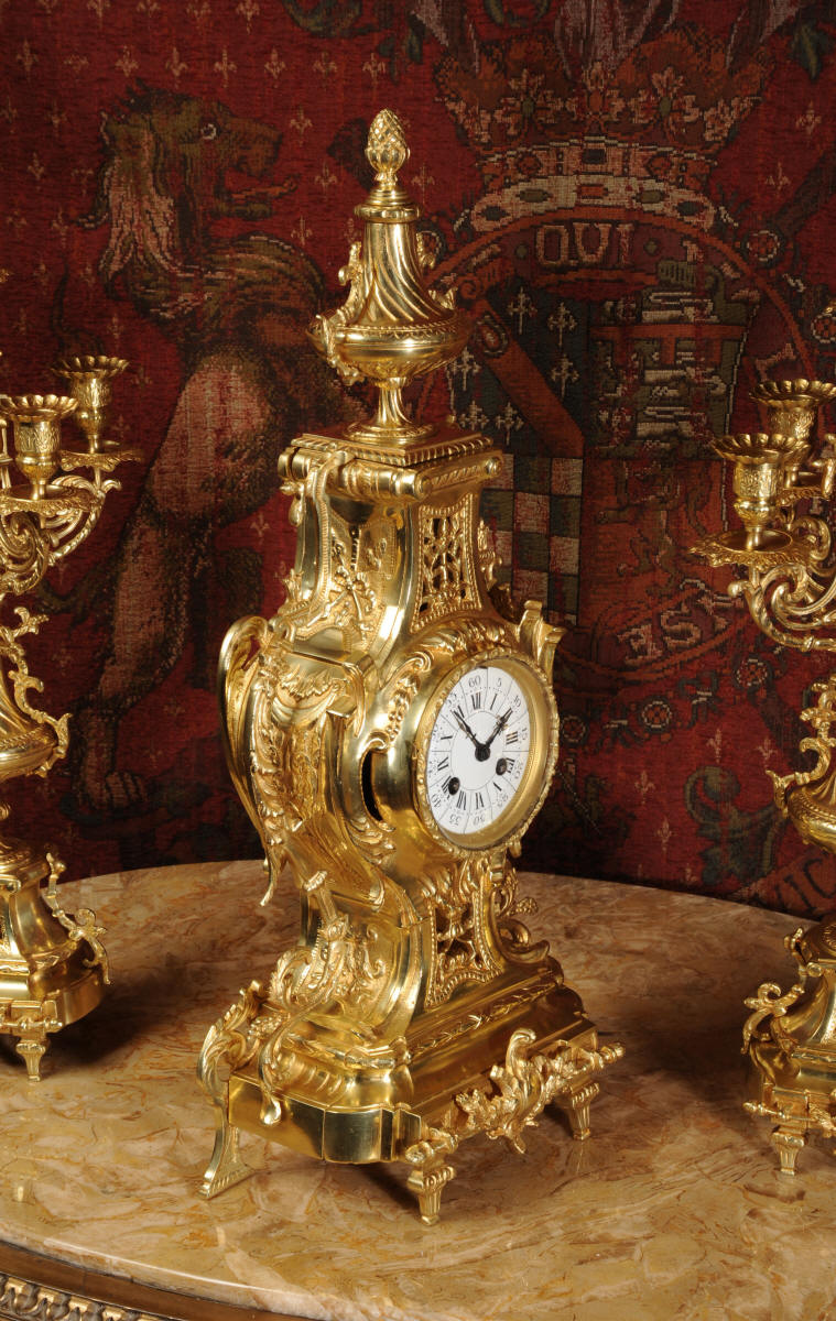 Condition of the case is excellent, the original gilding is beautifully clean and bright with hardly any wear or discolouration and there are no losses. The dial is also in excellent condition just some tiny nibbles next to the winding holes. Candelabra are slightly distorted and some of the nozzles have some slight splitting. Some of the candelabra arms have a break in the design but they are still strong and complete. The set makes a stunning display as you can see below.