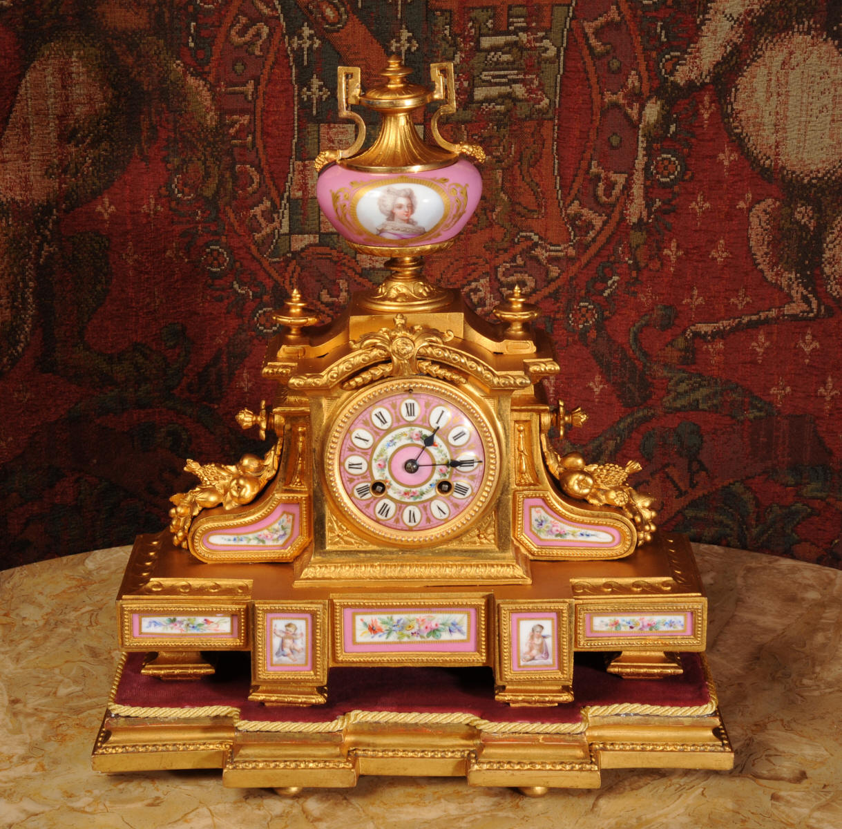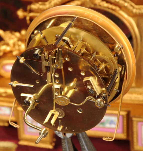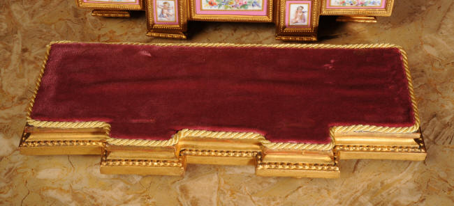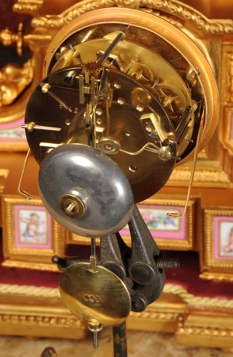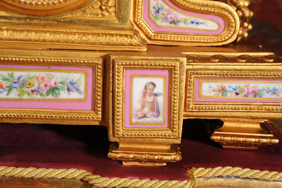 Condition of the case is very good, there is some wear to the original gilding and we have polished it to a bright and clean finish. The rear of the case has some original foundry faults which don't detract. The porcelain is in excellent condition, there is a tiny chip at the top of the lower left hand panel which is hardly noticeable. The vast majority of the over-glaze gilt decoration is fresh and complete with remarkably little wear including the dial. the gesso base is also in good condition with some wear and chips. We have replaced the red velvet. This is a stunning clock to add to your collection.