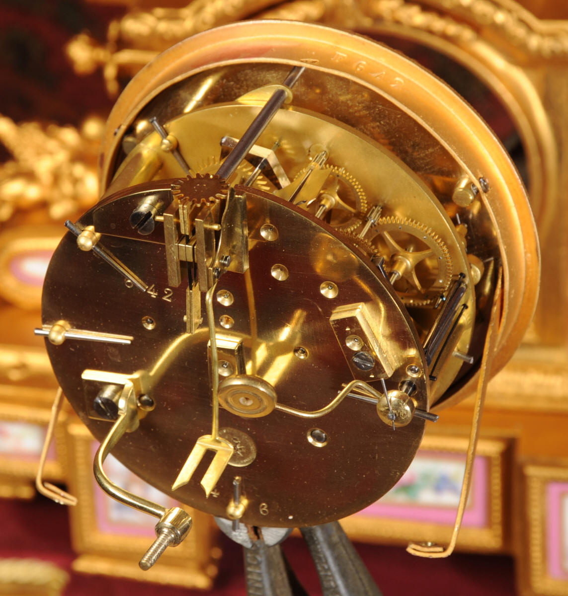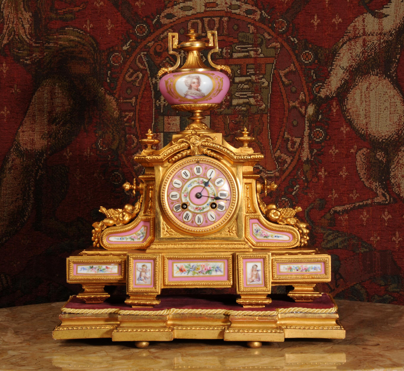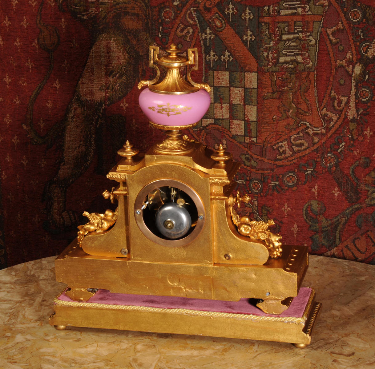 Condition of the case is very good, there is some wear to the original gilding and we have polished it to a bright and clean finish. The rear of the case has some original foundry faults which don't detract. The porcelain is in excellent condition, there is a tiny chip at the top of the lower left hand panel which is hardly noticeable. The vast majority of the over-glaze gilt decoration is fresh and complete with remarkably little wear including the dial. the gesso base is also in good condition with some wear and chips. We have replaced the red velvet. This is a stunning clock to add to your collection.