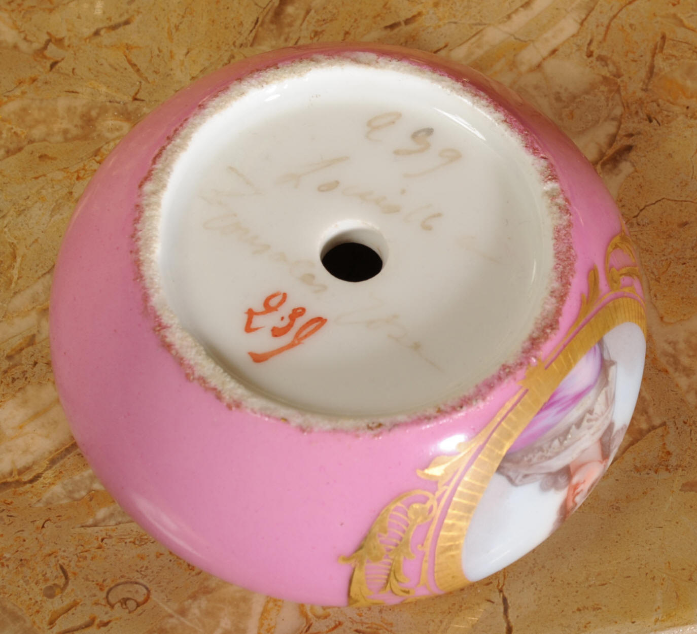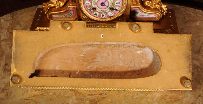 The clock is complete with it's original velvet covered gesso base. The rear of the case is signed for the case maker 'P. H. Mourey' (see pictures below).