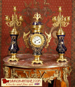 ~ French - Circa 1900 ~ ~~ Excellent condition ~~ A very decorative clock set. Pottery bodies are blue glazed and decorated with over-glaze gilt stylised flowers in the Art Nouveau style. The pottery is mounted with gilded brass bases and candelabra. To the base of each is an impressed mark De Winter et Fils Brussels. The dial is enamel on copper, lettered with Art Nouveau style numbers and is decorated with a delicate floral swag. It is complete with original blued steel hands. The French movement is by Soci�t� Clusienne of Cluses near the Swiss border. It is of the good quality and is in excellent clean and running condition having been fully serviced by our clockmaker. Pendulum has been replaced and it runs for 8 days and strikes the hours and halves on a bell. Click the movie below to hear the bell and watch the clock running! Condition of the pottery is