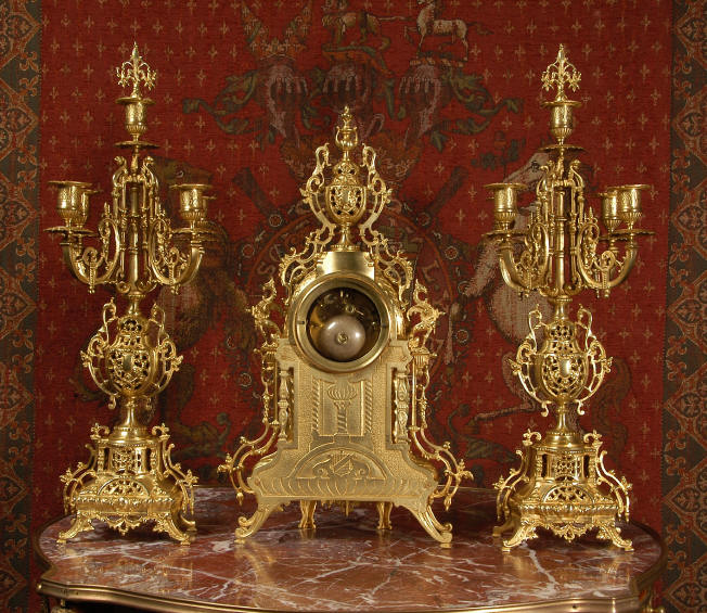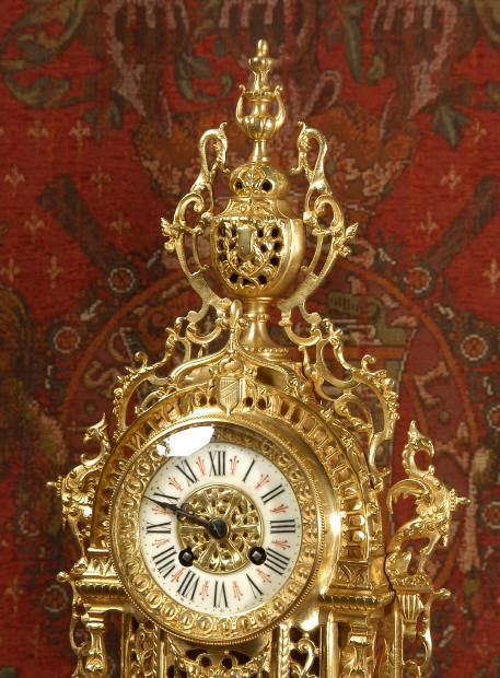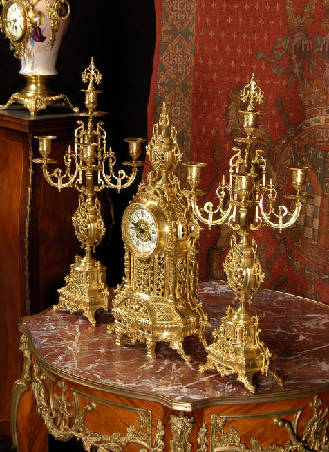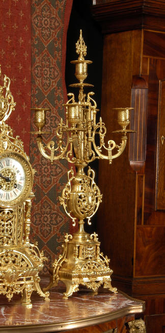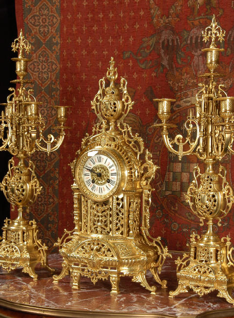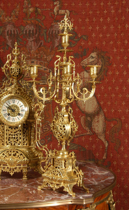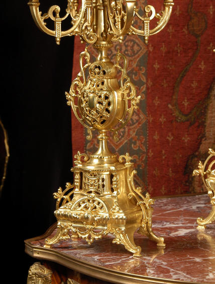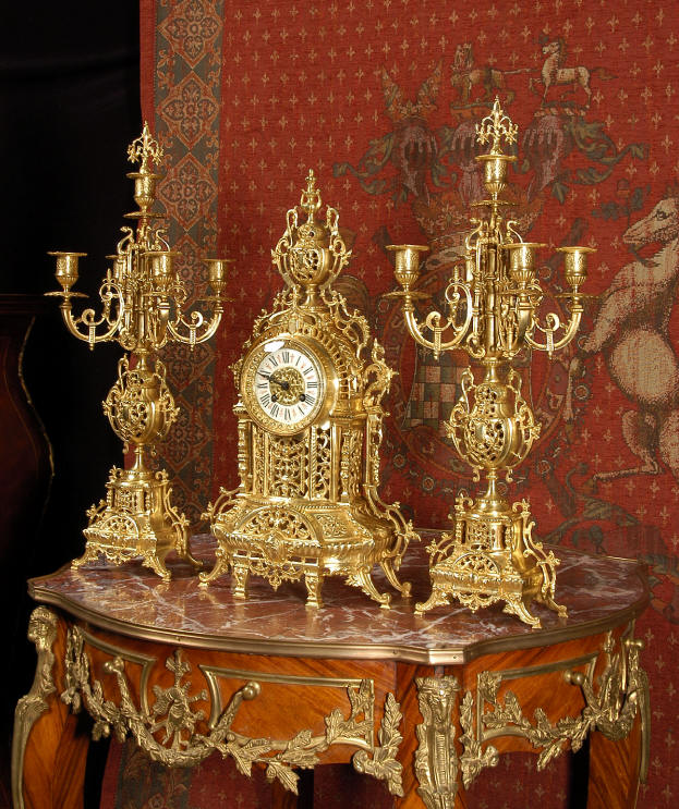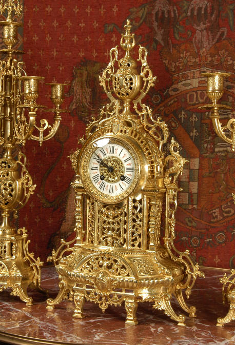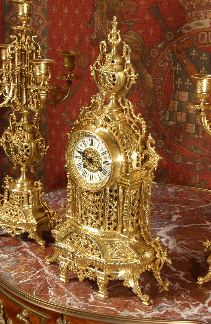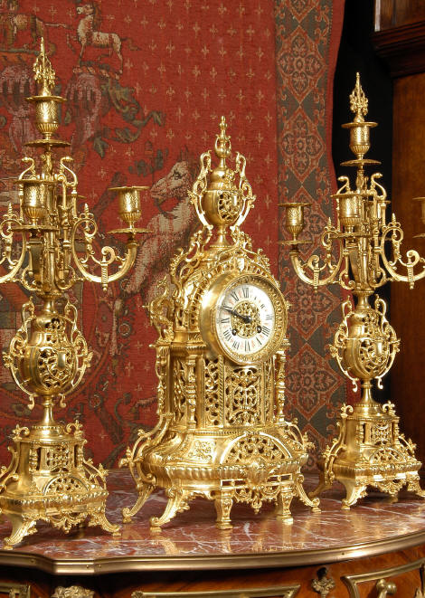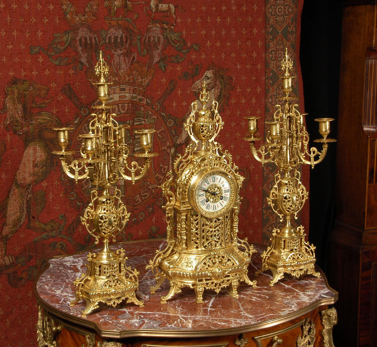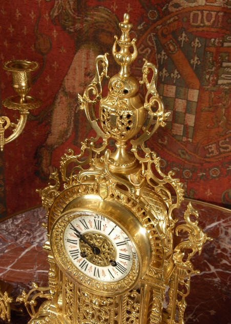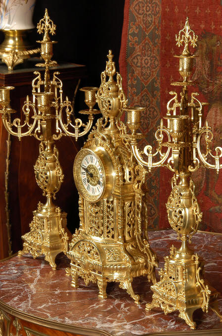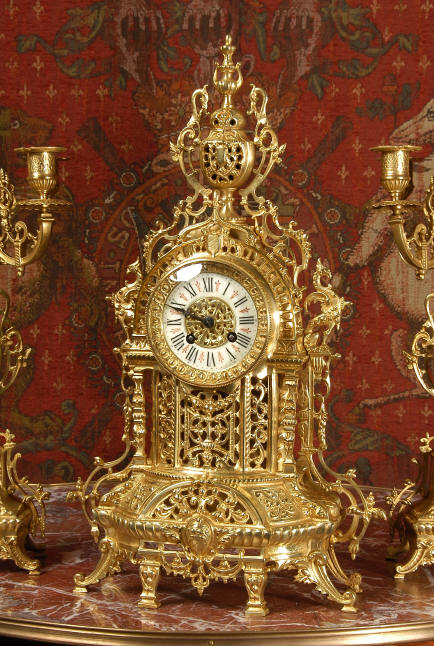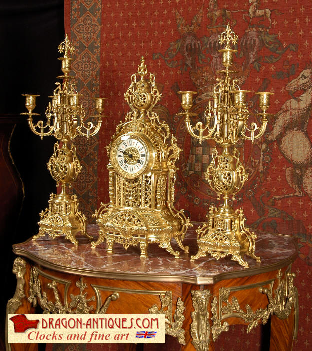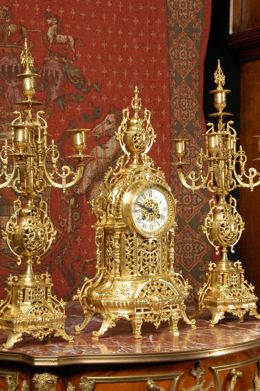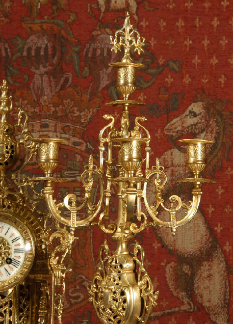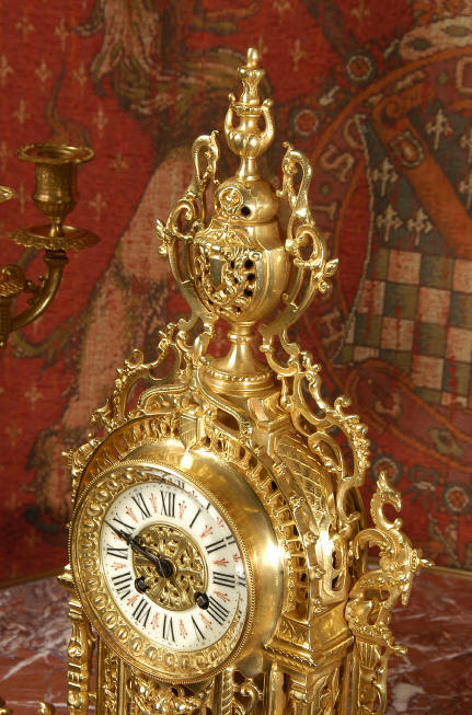 ~ French - Circa 1880 ~ ~~ Excellent condition ~~ A beautiful Louis XVI style gilded clock set, architectural in shape and profusely decorated with delicate floral fret work. To the sides of the dial stand two mythical creatures. The original finish is clean and bright and displays beautifully. Candelabra are of conforming style and are complete with original snuffers which store in the central nozzle as finials. The pendulum of the clock can be seen swinging inside the case through the front fret work and the back door is also glazed to allow the movement to be seen. This means the set will display very nicely on a table; the candelabra are modelled both front and back and the back of the clock is also decorated. The movement is by Samuel Marti, one of top French makers from this time, and dates from around 1880. It is an 8 day movement and strikes the hours and halves on a bell. We have cleaned and serviced the movement and thoroughly function tested it. The pendulum is an old replacement. Dial is enamel on copper with a fretted gilded brass centre, lettered in black roman numerals with red half hour markers. Click the movie below to hear the bell and watch the clock running! Condition of the case is