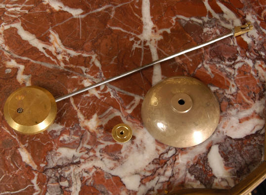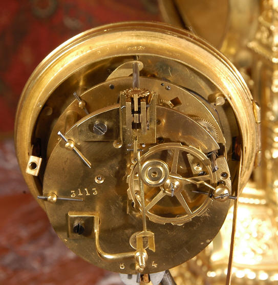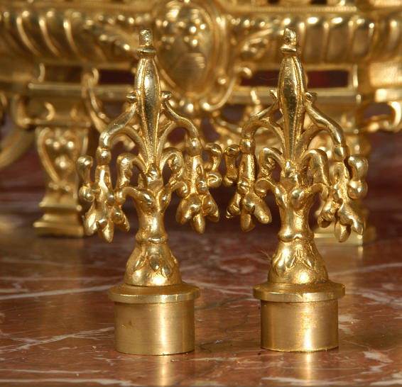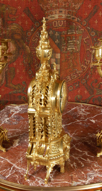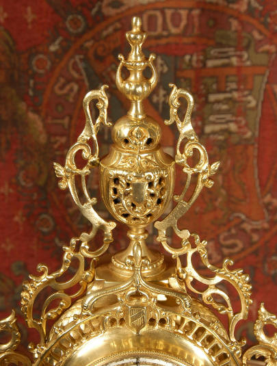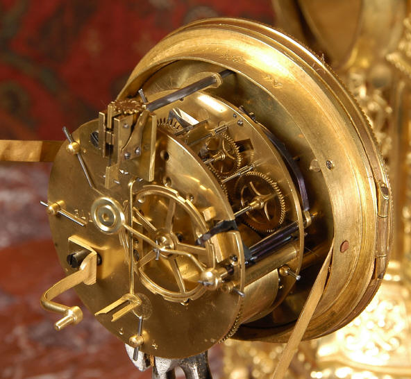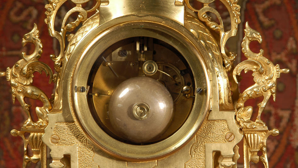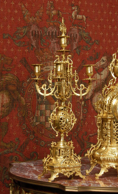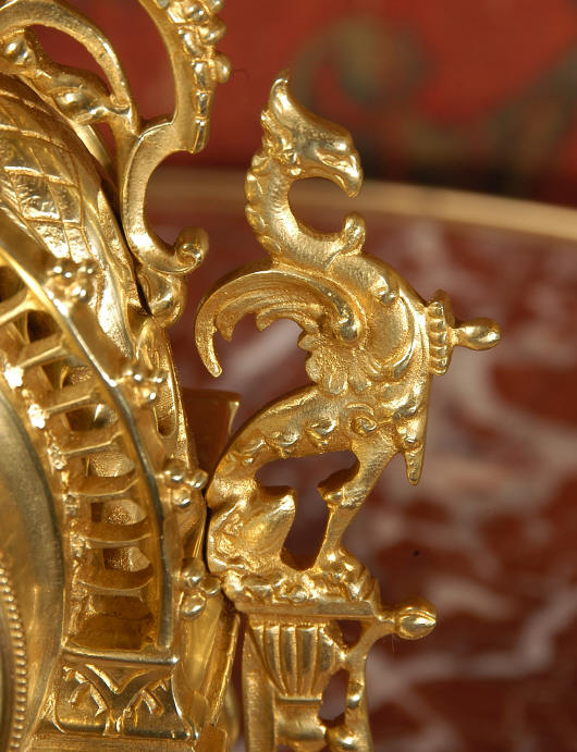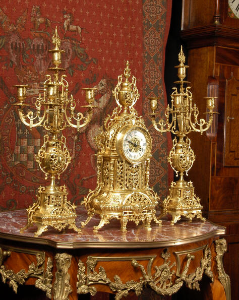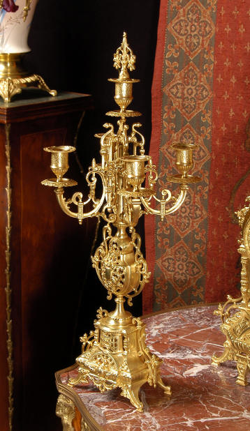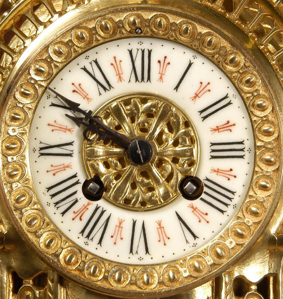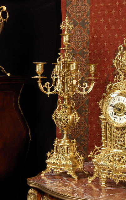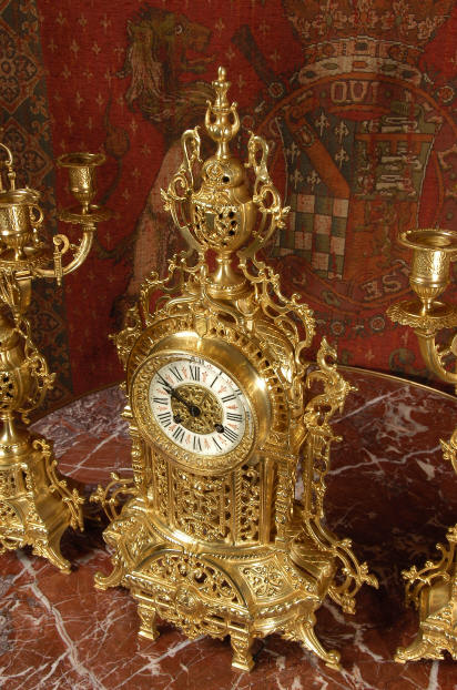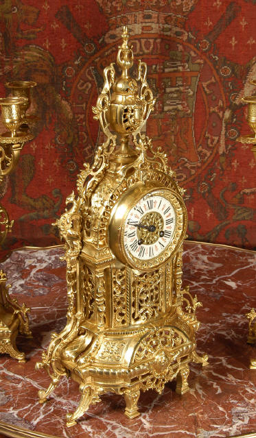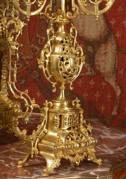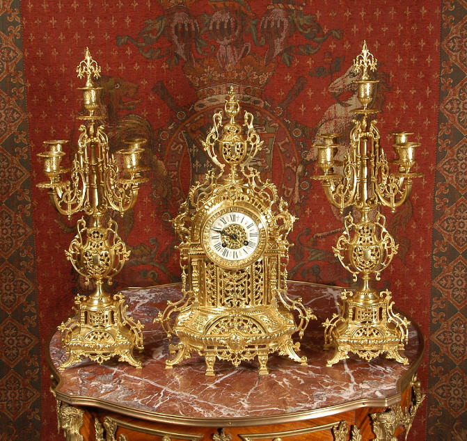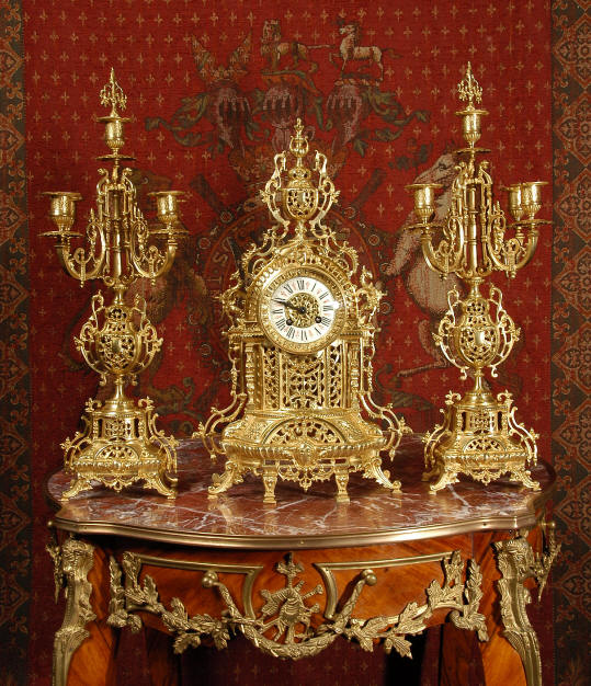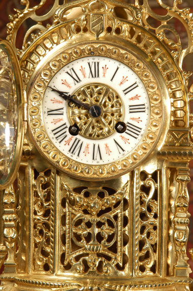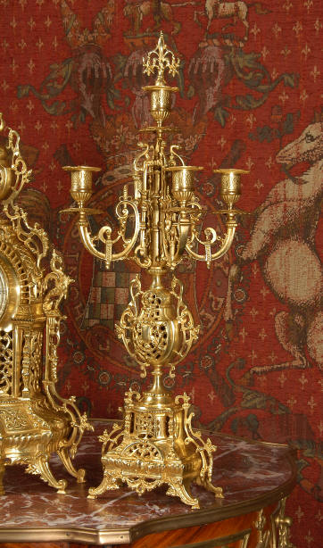 ~ French - Circa 1880 ~ ~~ Excellent condition ~~ A beautiful Louis XVI style gilded clock set, architectural in shape and profusely decorated with delicate floral fret work. To the sides of the dial stand two mythical creatures. The original finish is clean and bright and displays beautifully. Candelabra are of conforming style and are complete with original snuffers which store in the central nozzle as finials. The pendulum of the clock can be seen swinging inside the case through the front fret work and the back door is also glazed to allow the movement to be seen. This means the set will display very nicely on a table; the candelabra are modelled both front and back and the back of the clock is also decorated. The movement is by Samuel Marti, one of top French makers from this time, and dates from around 1880. It is an 8 day movement and strikes the hours and halves on a bell. We have cleaned and serviced the movement and thoroughly function tested it. The pendulum is an old replacement. Dial is enamel on copper with a fretted gilded brass centre, lettered in black roman numerals with red half hour markers. Click the movie below to hear the bell and watch the clock running! Condition of the case is