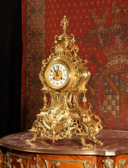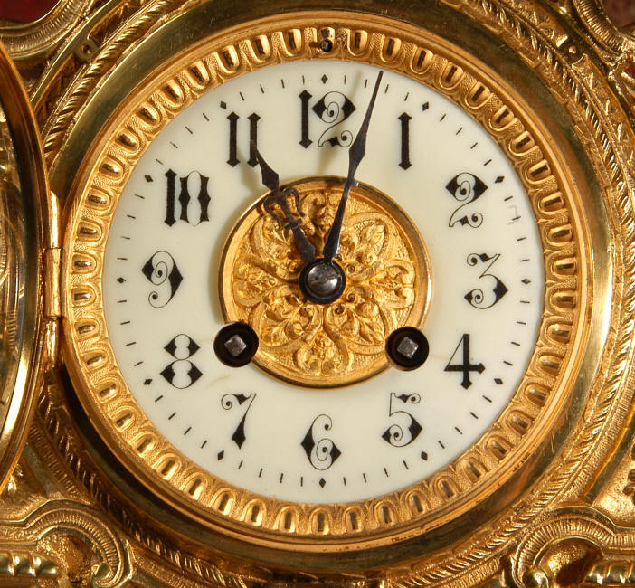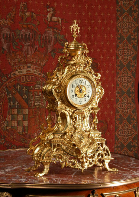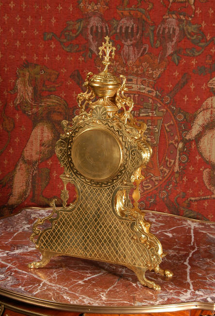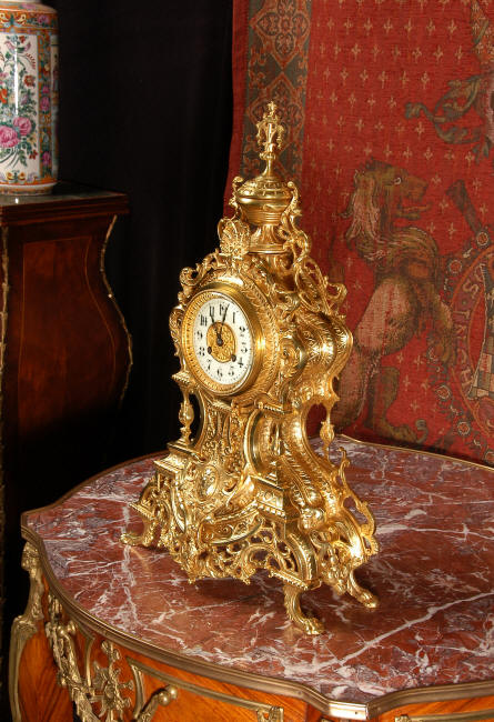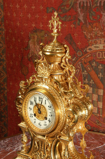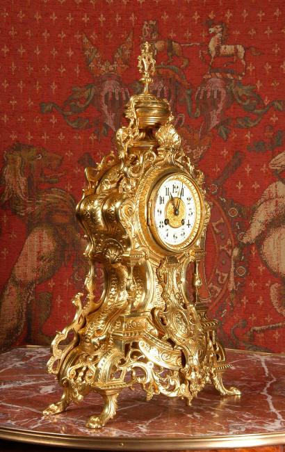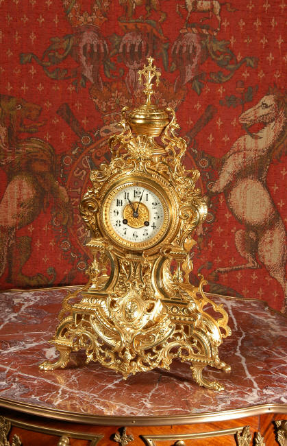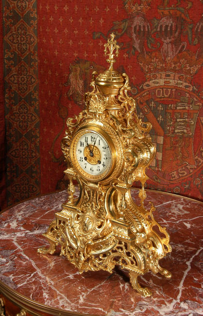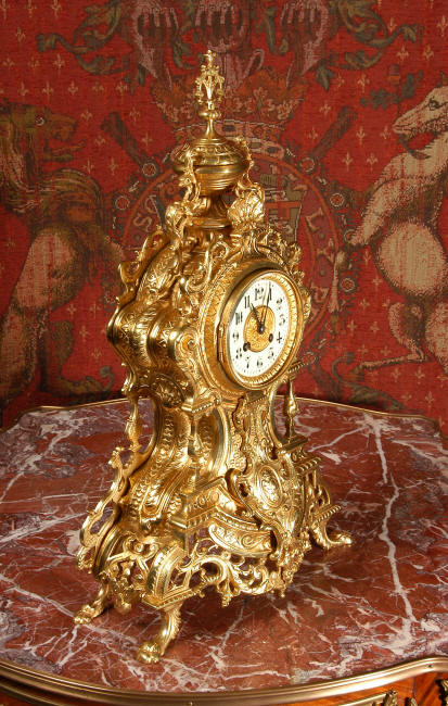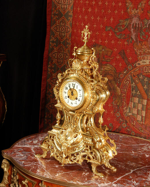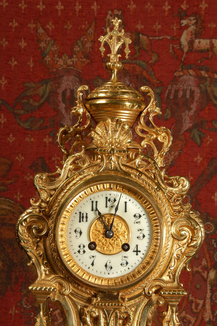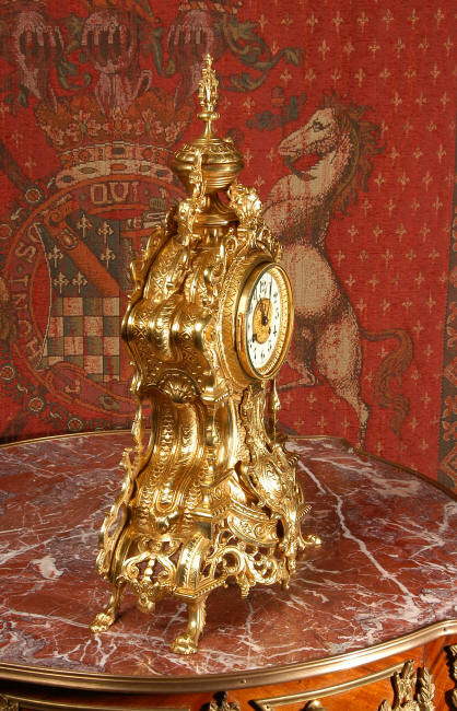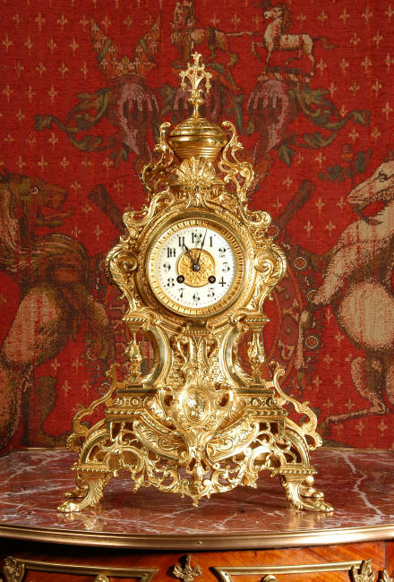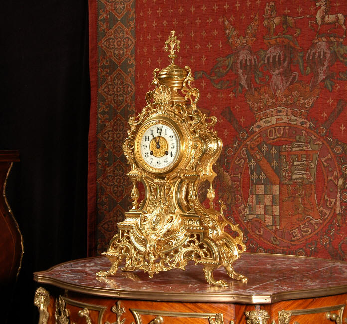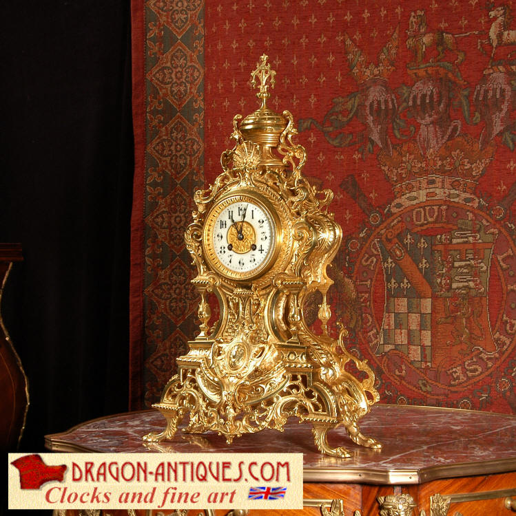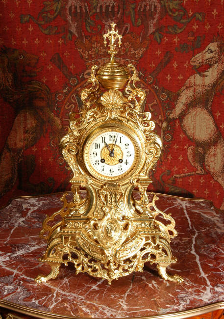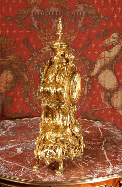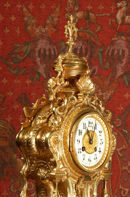 ~ French - Circa 1875 ~ ~~ Excellent condition, fully overhauled and running ~~ A beautiful, large antique French clock in excellent clean and bright condition. Style is Louis XV and the modelling is excellent with fine, crisp and detailed finishing. The clock features a waisted shape with an applied shield to the front, shell above the dial and hairy paw feet. The base is beautifully fretted with floral swags and foliage. Dial is enamel on copper with a gilt brass centre and bezel and is complete with the original blued steel hands. The French movement is of very high quality and is in excellent clean and running condition having been fully overhauled by our clockmaker. Pendulum is a replacement. It runs for 8 days on one wind and strikes the hours and halves on a bell. Click the video clip below to hear the bell and watch the clock running! Condition of the case is