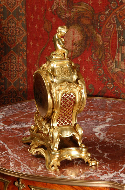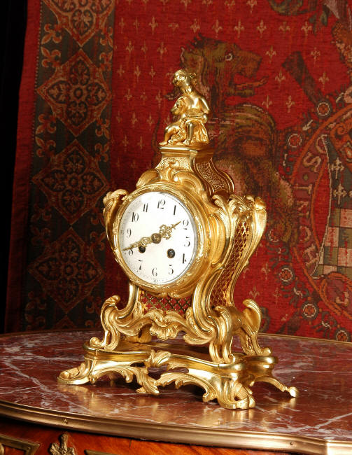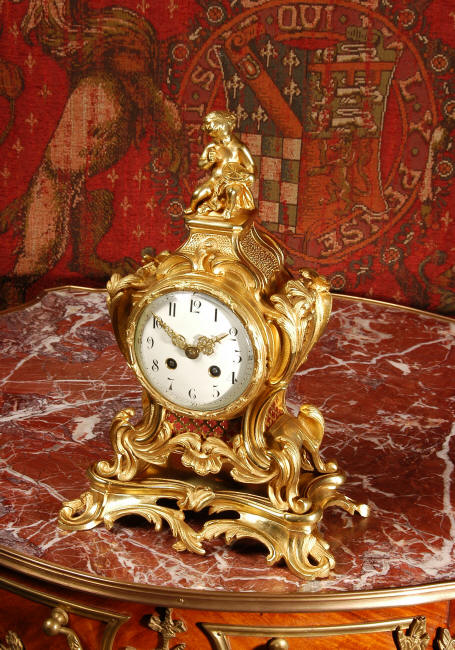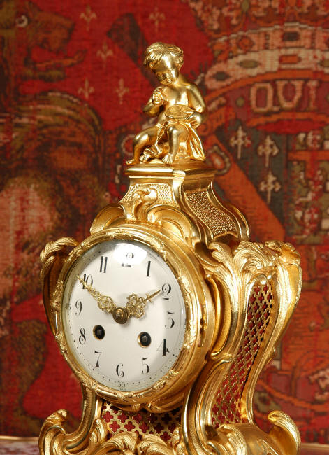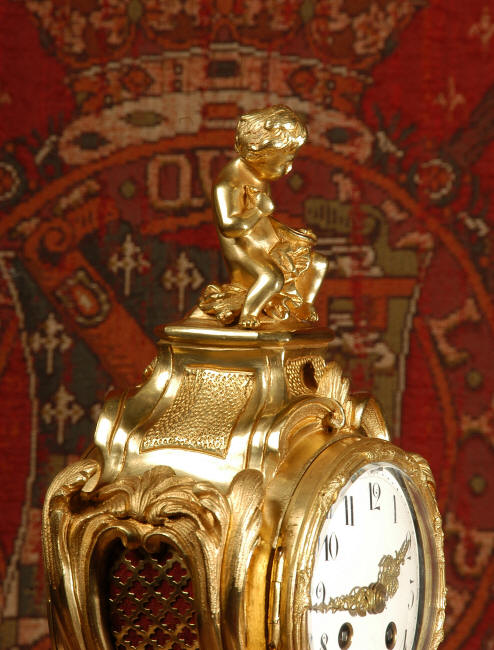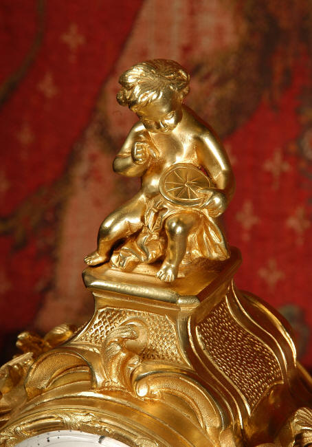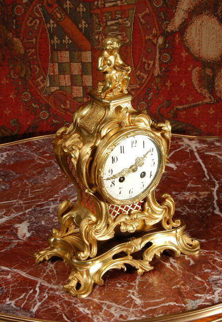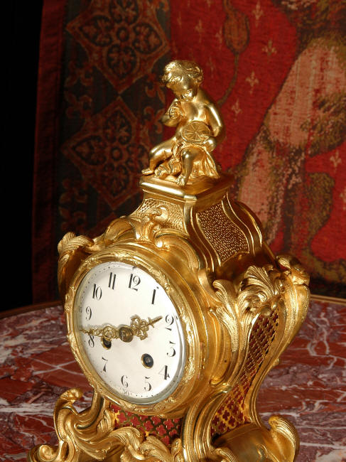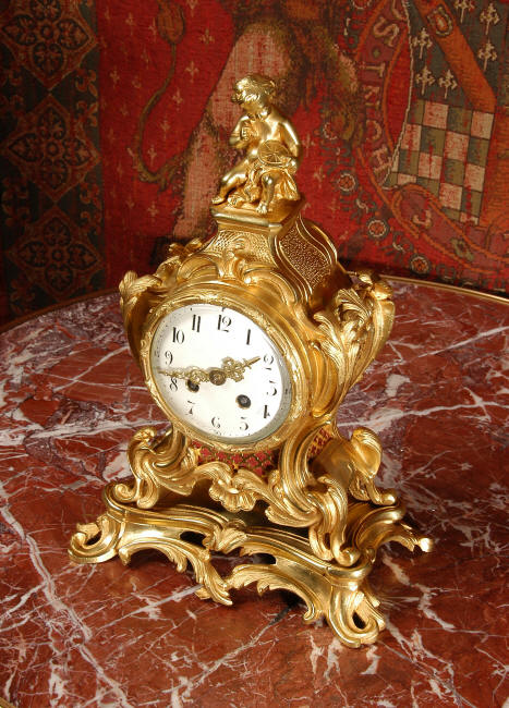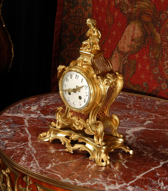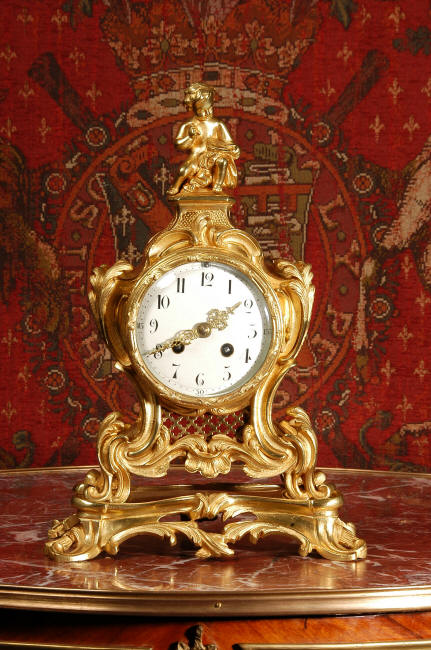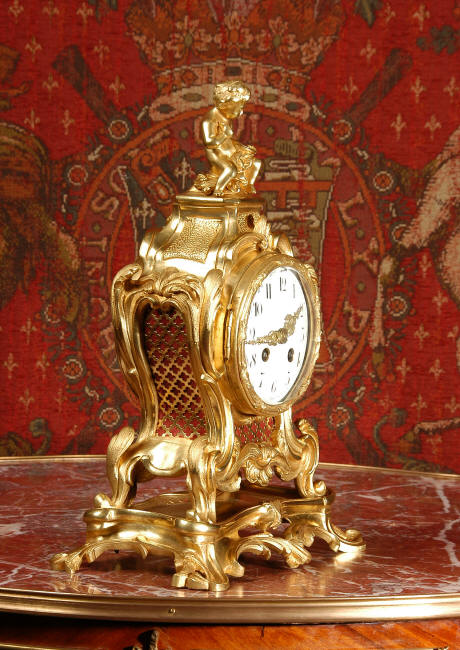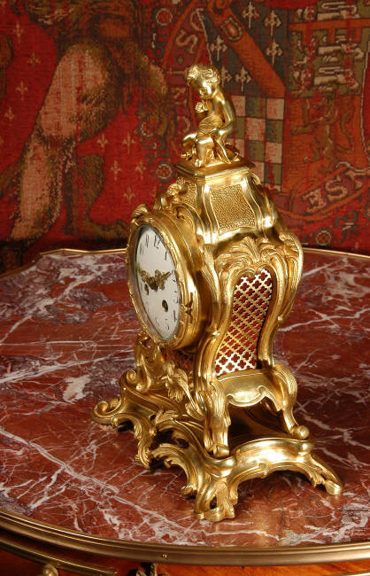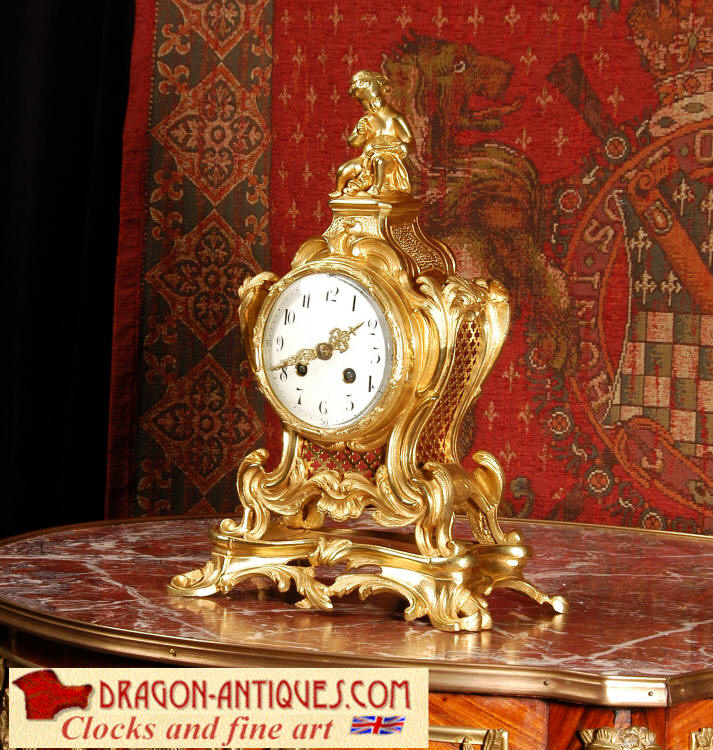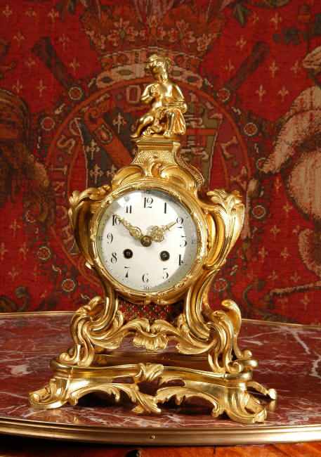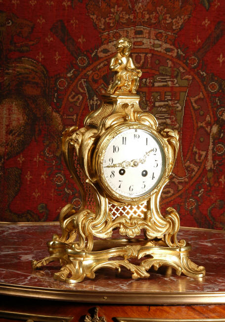 ~ French - Circa 1875 ~ ~~ Excellent condition ~~ Stunning antique French boudoir clock. The style is Rococo, waisted keyhole shape with acanthus leaf shoulders, 'C' scroll feet and surmounted by a cherub holding a sundial. It stands on its original integral base. To the sides are fretted panels backed with red velvet. The design is beautifully bold and heavily moulded in brass, well chased and finished. It is modelled in the round and so would display very well on a table. Dial is a beautiful enamel on copper, it is complete with its original delicately fretted brass hands. The French movement is of excellent quality and is in clean and fully working condition, complete with original pendulum. It runs for 8 days and strikes the hours and halves on a bell, click the video below to see and hear the movement! The finish of the brass is excellent, bright