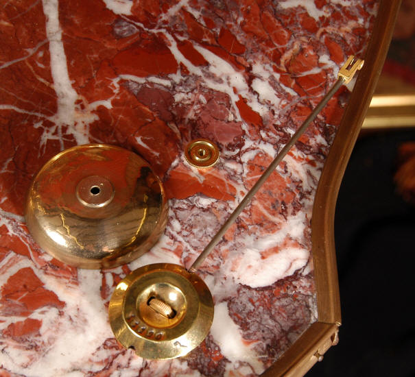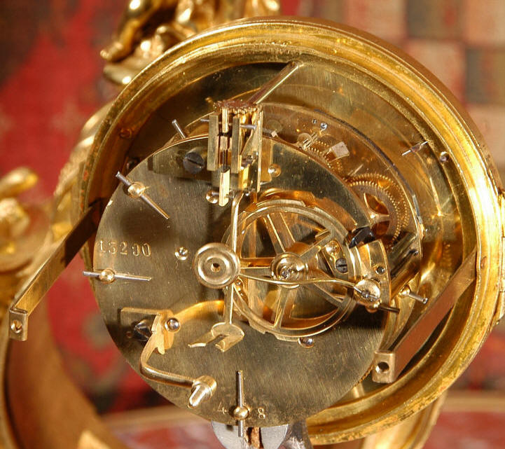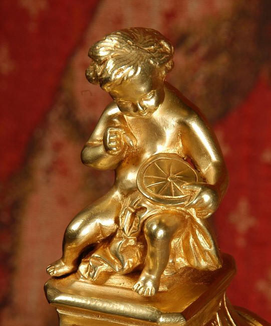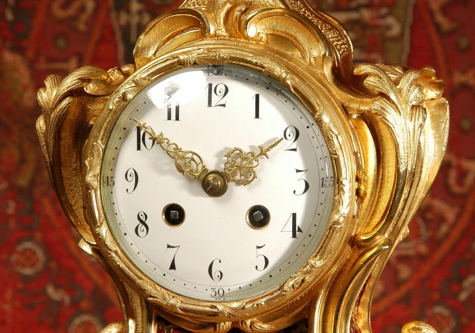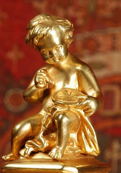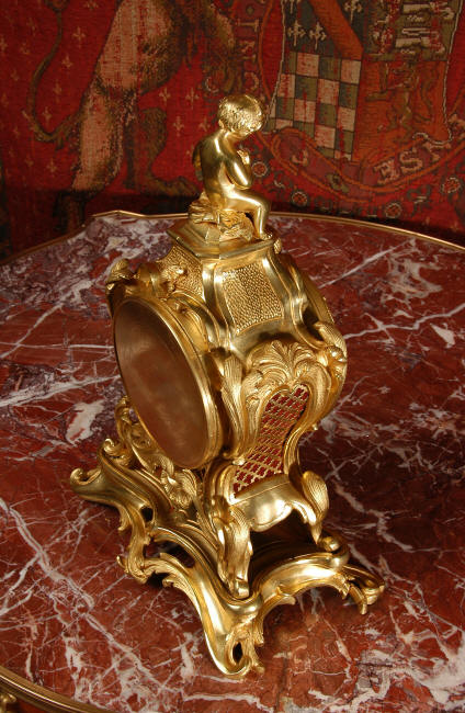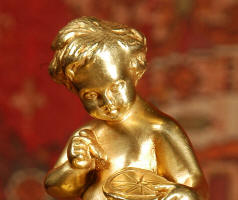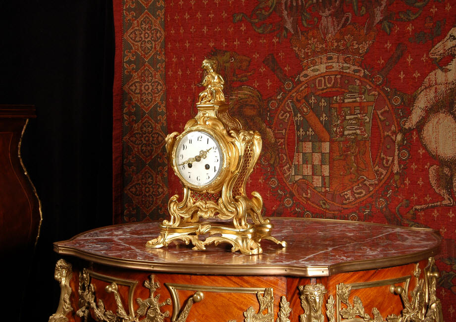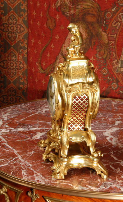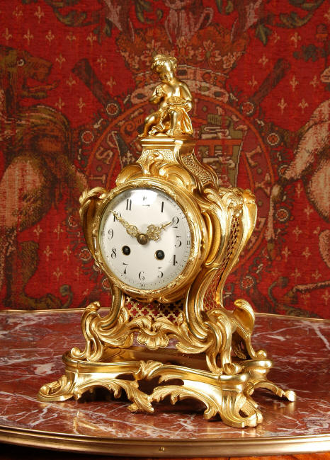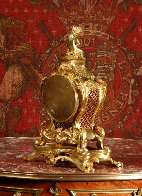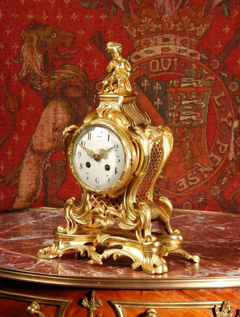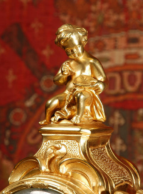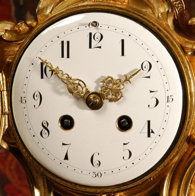 ~ French - Circa 1875 ~ ~~ Excellent condition ~~ Stunning antique French boudoir clock. The style is Rococo, waisted keyhole shape with acanthus leaf shoulders, 'C' scroll feet and surmounted by a cherub holding a sundial. It stands on its original integral base. To the sides are fretted panels backed with red velvet. The design is beautifully bold and heavily moulded in brass, well chased and finished. It is modelled in the round and so would display very well on a table. Dial is a beautiful enamel on copper, it is complete with its original delicately fretted brass hands. The French movement is of excellent quality and is in clean and fully working condition, complete with original pendulum. It runs for 8 days and strikes the hours and halves on a bell, click the video below to see and hear the movement! The finish of the brass is excellent, bright
