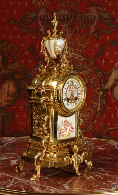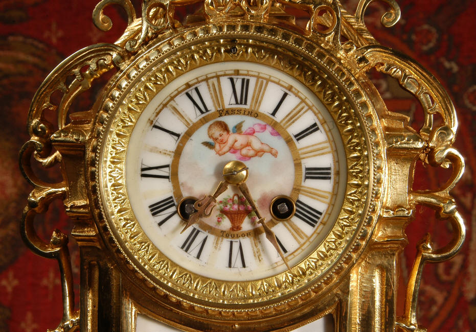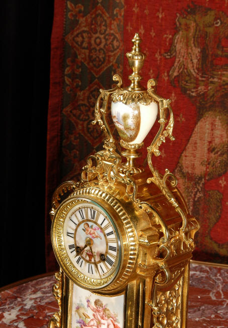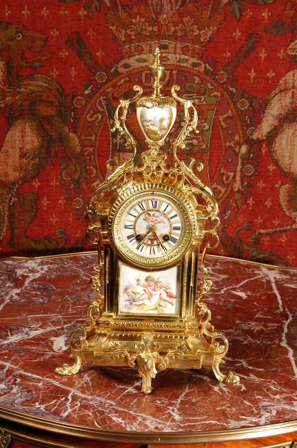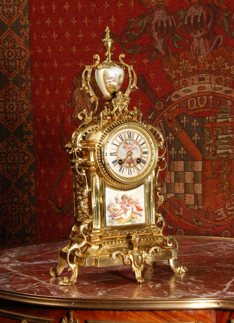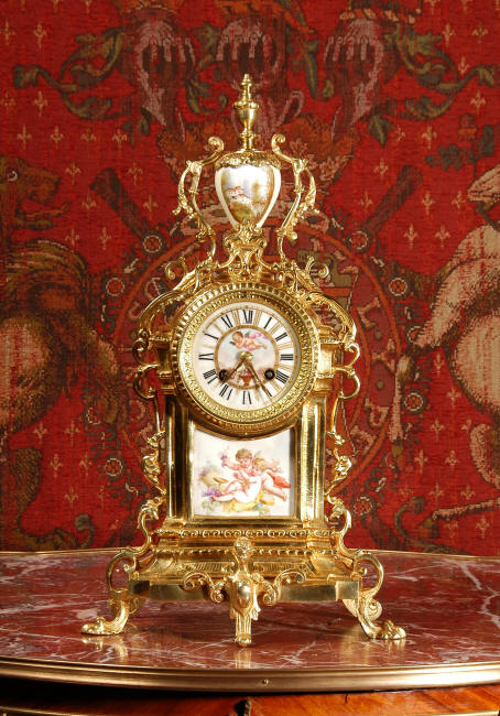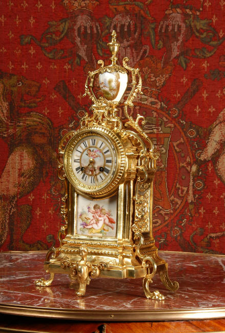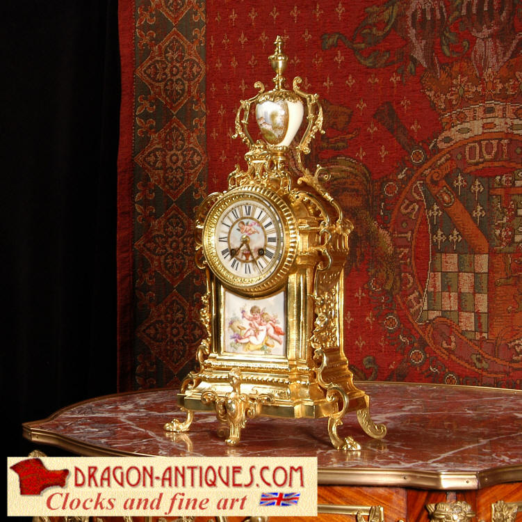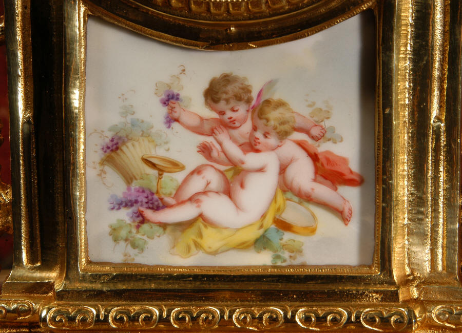 ~ French - Circa 1890 ~ ~~ Excellent condition ~~ A stunning antique French Boudoir clock featuring finely painted Sevres style porcelain. The panel below the dial shows a scene of cherubs gathering the grape harvest. The dial itself is decorated with a cherub and a basket of flowers and also has the retailers name and town. The clock is surmounted by a porcelain urn painted with a country scene. This is a beautiful looking clock, gilding is in excellent original condition with a lovely bright and clean finish. The French movement has the A. D. Mougin mark on the backplate. It is of high quality and is in excellent clean and running condition having been fully overhauled by our clockmaker. Pendulum is a replacement. It runs for 8 days on one wind and strikes the hours and halves on a bell. Click the video clip below to hear the bell and watch the clock running! Condition of the case is