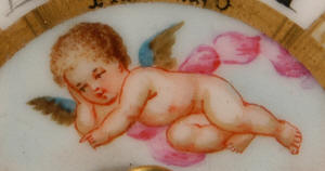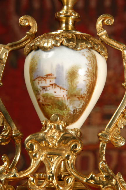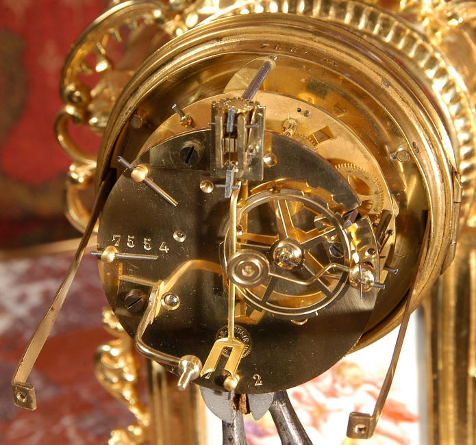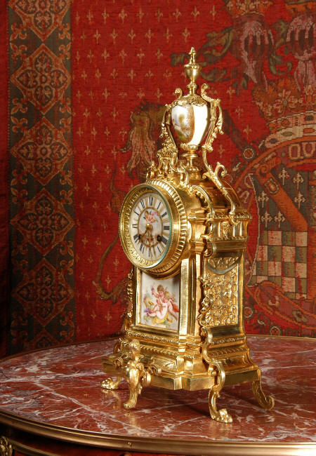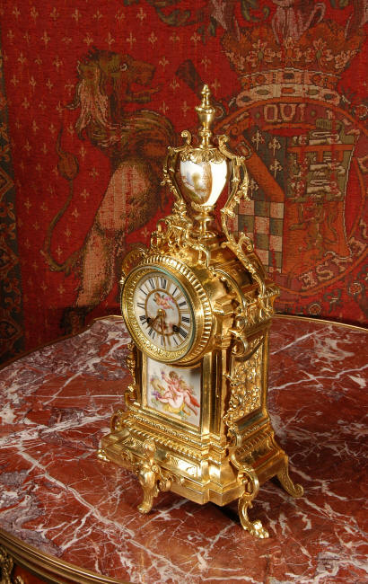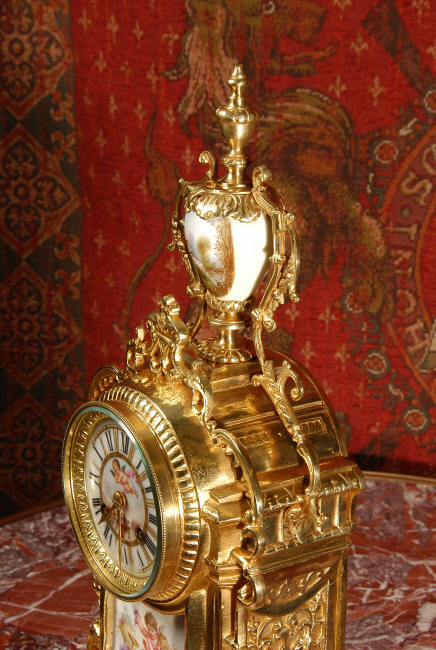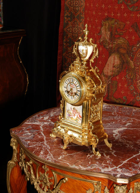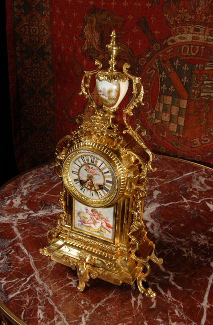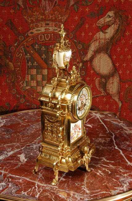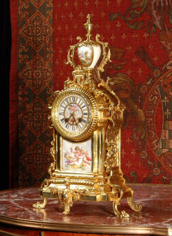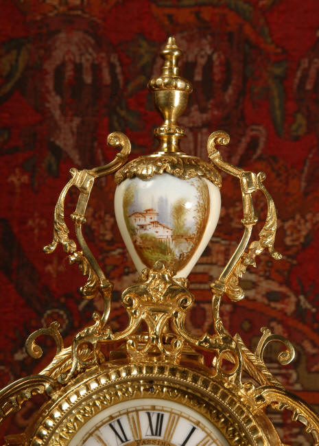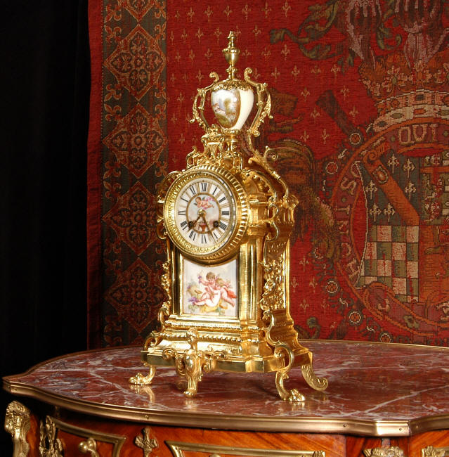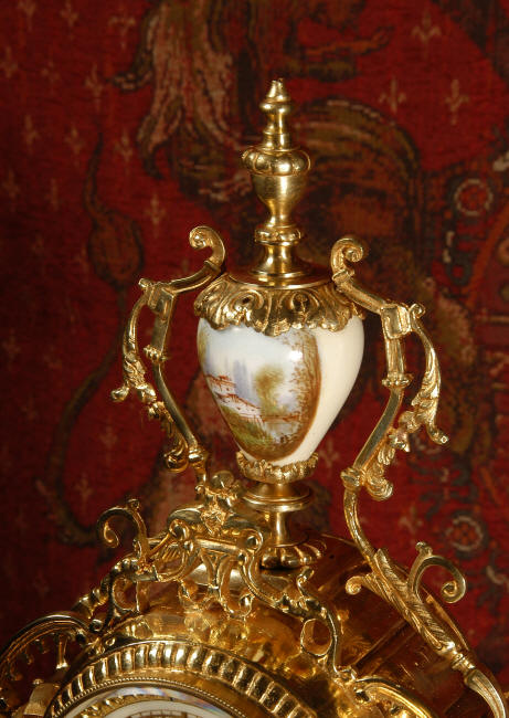 ~ French - Circa 1890 ~ ~~ Excellent condition ~~ A stunning antique French Boudoir clock featuring finely painted Sevres style porcelain. The panel below the dial shows a scene of cherubs gathering the grape harvest. The dial itself is decorated with a cherub and a basket of flowers and also has the retailers name and town. The clock is surmounted by a porcelain urn painted with a country scene. This is a beautiful looking clock, gilding is in excellent original condition with a lovely bright and clean finish. The French movement has the A. D. Mougin mark on the backplate. It is of high quality and is in excellent clean and running condition having been fully overhauled by our clockmaker. Pendulum is a replacement. It runs for 8 days on one wind and strikes the hours and halves on a bell. Click the video clip below to hear the bell and watch the clock running! Condition of the case is