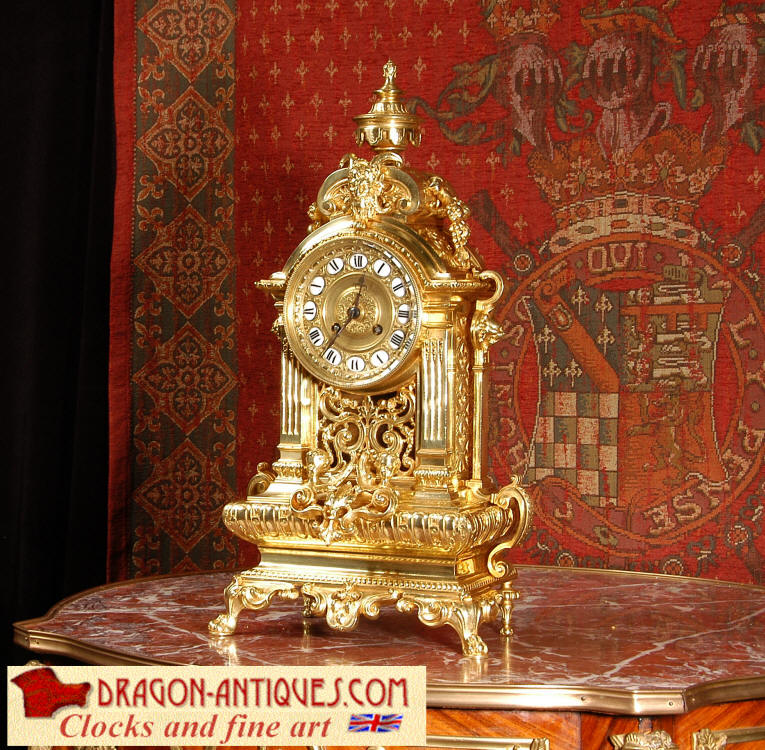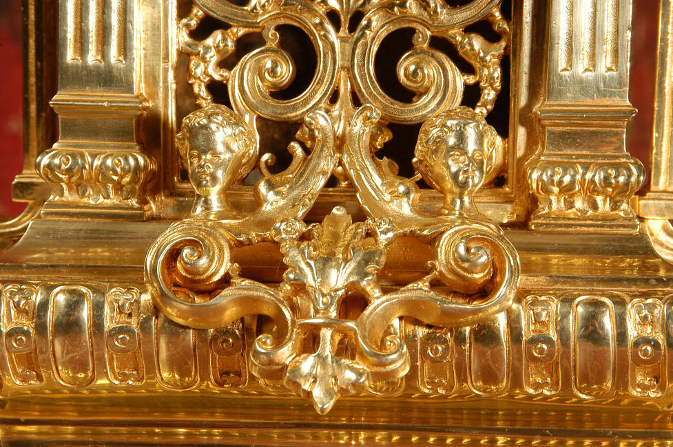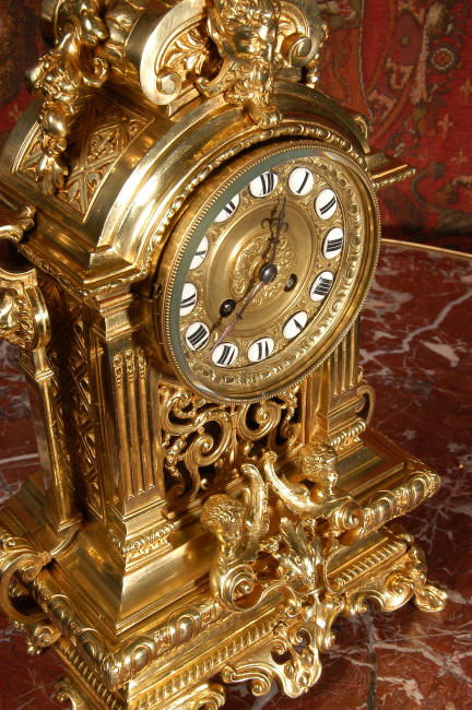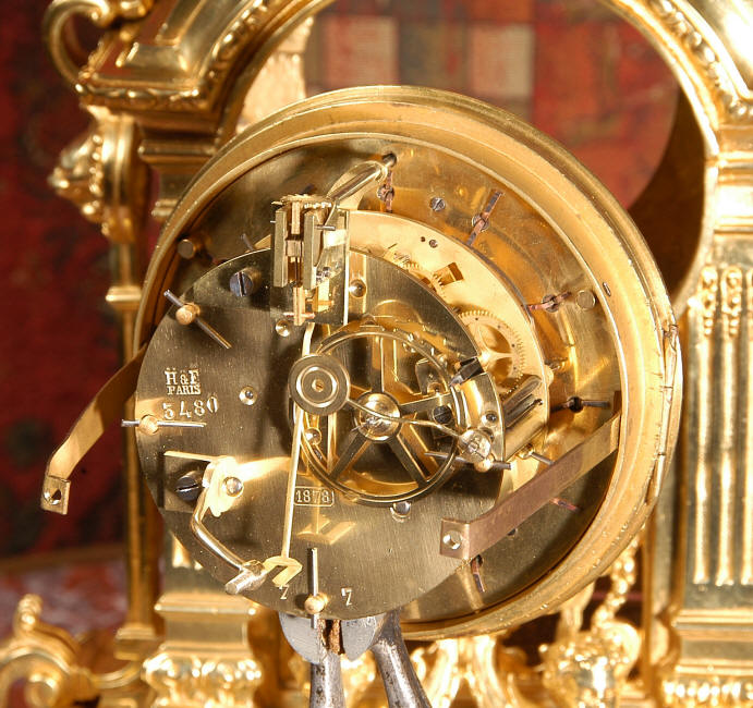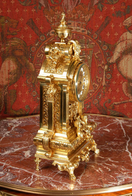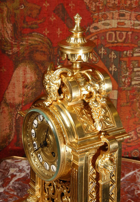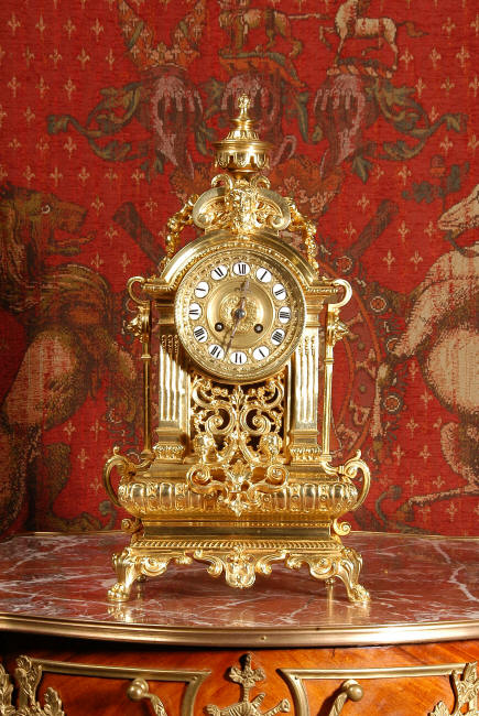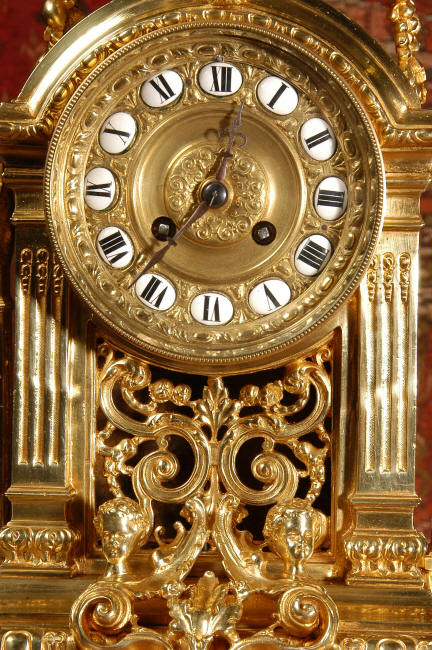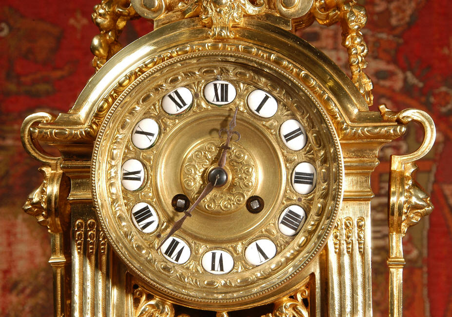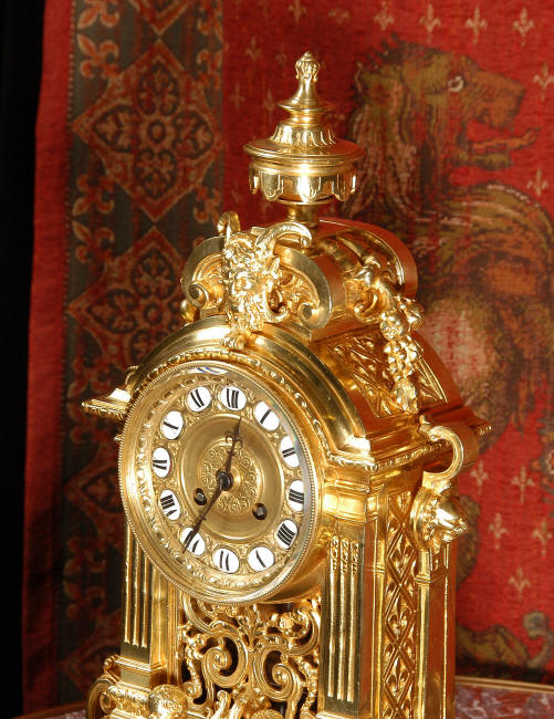 ~ French - Circa 1870 ~ ~~ Excellent condition, fully overhauled ~~ A very finely detailed gilt brass clock in excellent condition, much of the original gilding remains which is in lovely bright and clean condition. The style is classical Louis XVI, boldly and heavily modelled with crisp, fine detail. The large gilt brass dial is mounted with 12 individual enamel cartouches. It sits between two columns with a fretted panel beneath allowing the pendulum to be seen swinging within the case. Above the dial is an arched pediment surmounted by an urn. A pair of winged goddess sit upon the cushion base, a grotesque mask is mounted above the dial and to the sides are stylised handles with lions masks. This is clock of high quality in lovely condition. The French movement is of high quality and is in excellent clean and running condition having been fully overhauled by our clockmaker. Pendulum is a replacement. The movement backplate has the retailers mark 'H & F of Paris'. It runs for 8 days and strikes the hours and halves on a bell. Click the video clip below to hear the bell and watch the clock running! Condition of the case is
