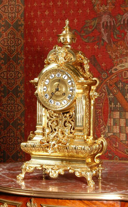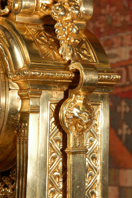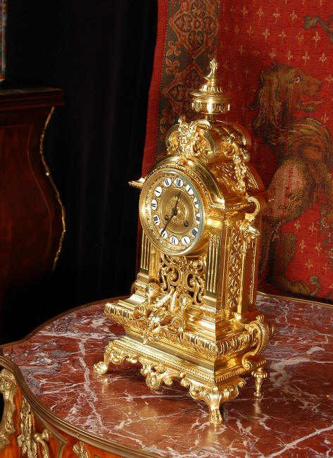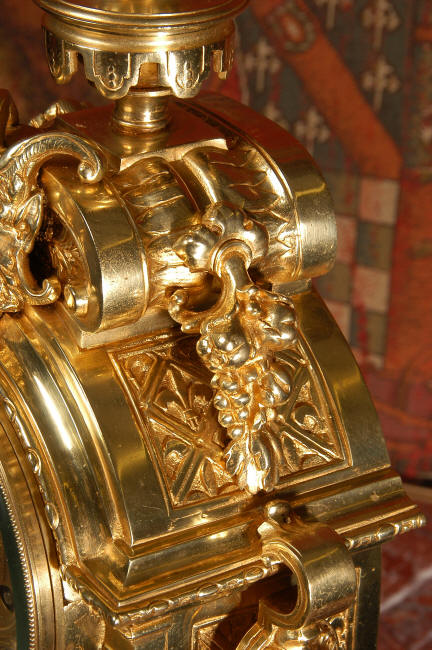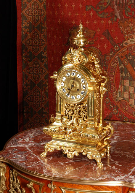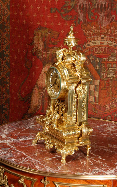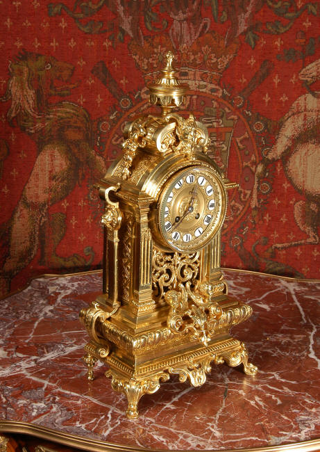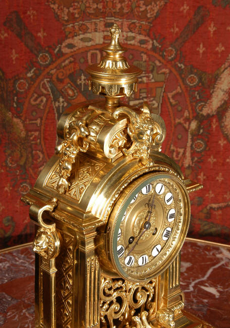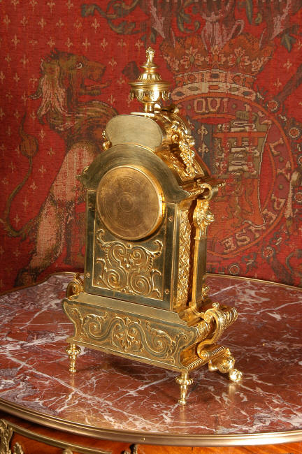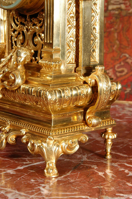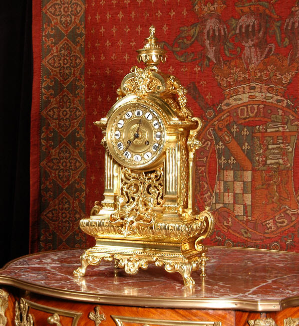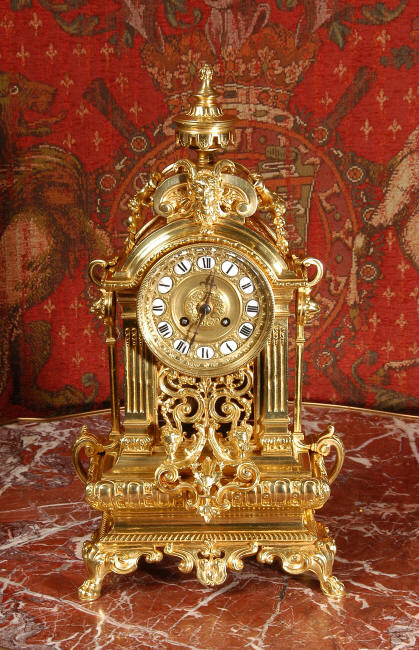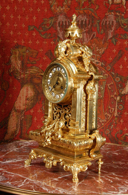 ~ French - Circa 1870 ~ ~~ Excellent condition, fully overhauled ~~ A very finely detailed gilt brass clock in excellent condition, much of the original gilding remains which is in lovely bright and clean condition. The style is classical Louis XVI, boldly and heavily modelled with crisp, fine detail. The large gilt brass dial is mounted with 12 individual enamel cartouches. It sits between two columns with a fretted panel beneath allowing the pendulum to be seen swinging within the case. Above the dial is an arched pediment surmounted by an urn. A pair of winged goddess sit upon the cushion base, a grotesque mask is mounted above the dial and to the sides are stylised handles with lions masks. This is clock of high quality in lovely condition. The French movement is of high quality and is in excellent clean and running condition having been fully overhauled by our clockmaker. Pendulum is a replacement. The movement backplate has the retailers mark 'H & F of Paris'. It runs for 8 days and strikes the hours and halves on a bell. Click the video clip below to hear the bell and watch the clock running! Condition of the case is