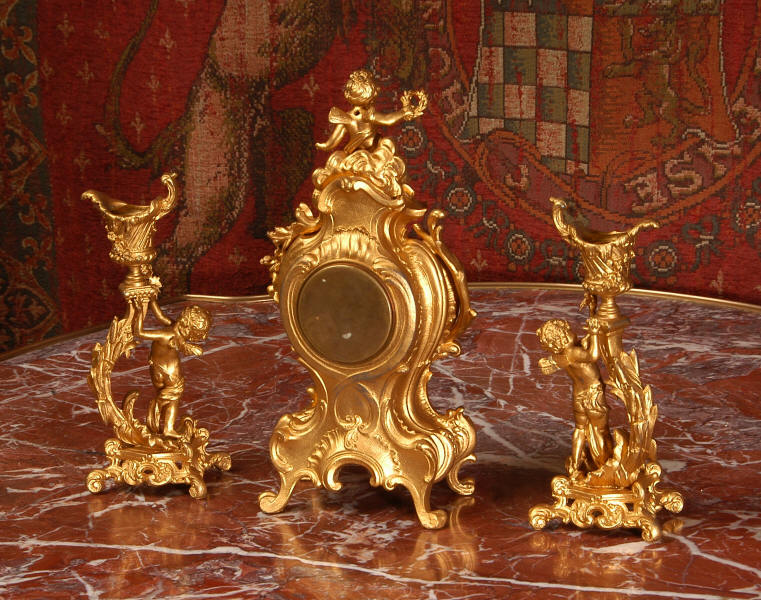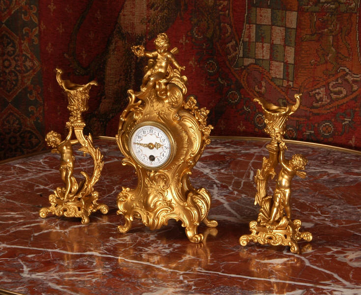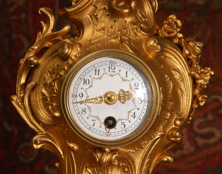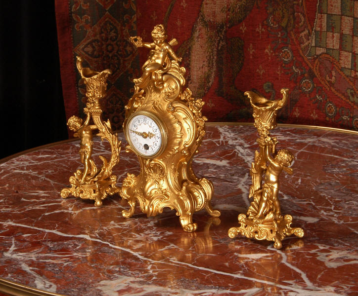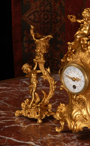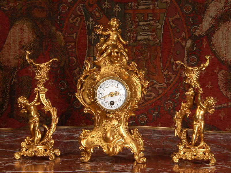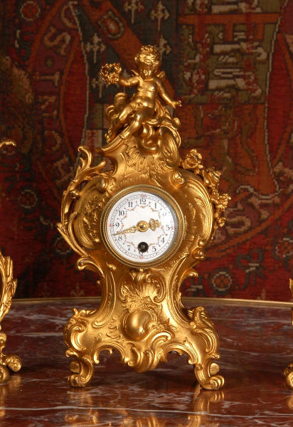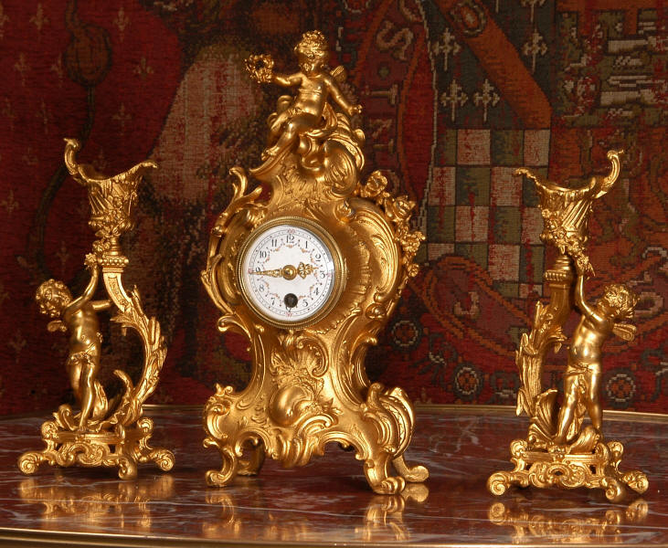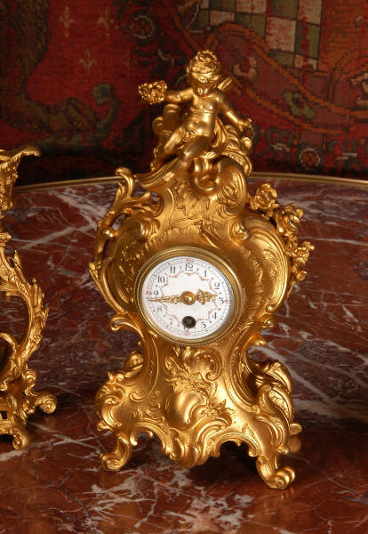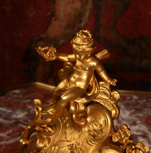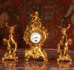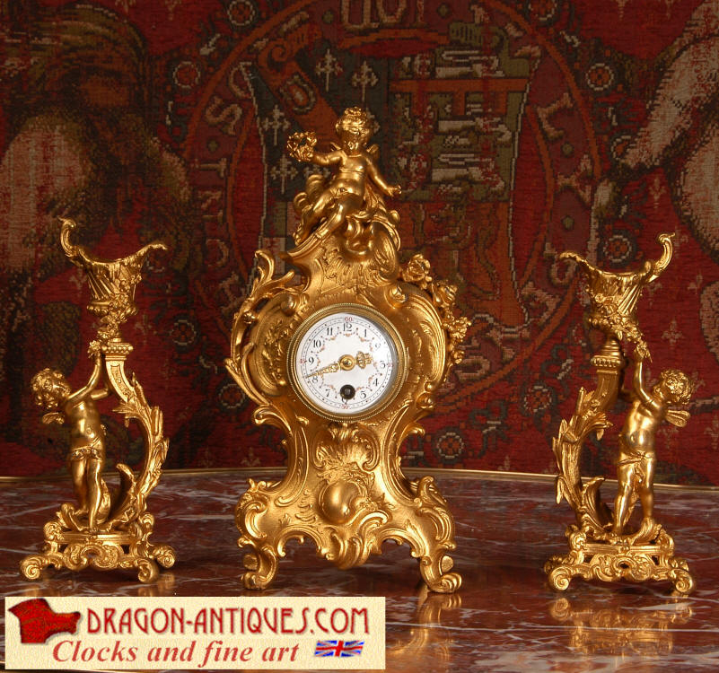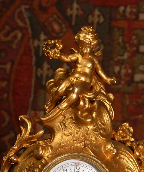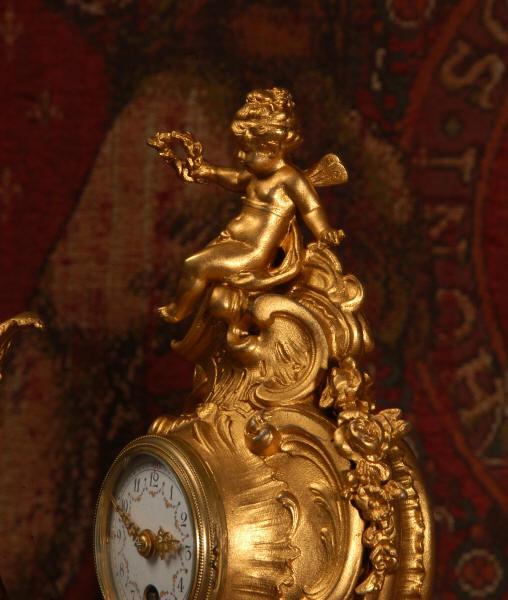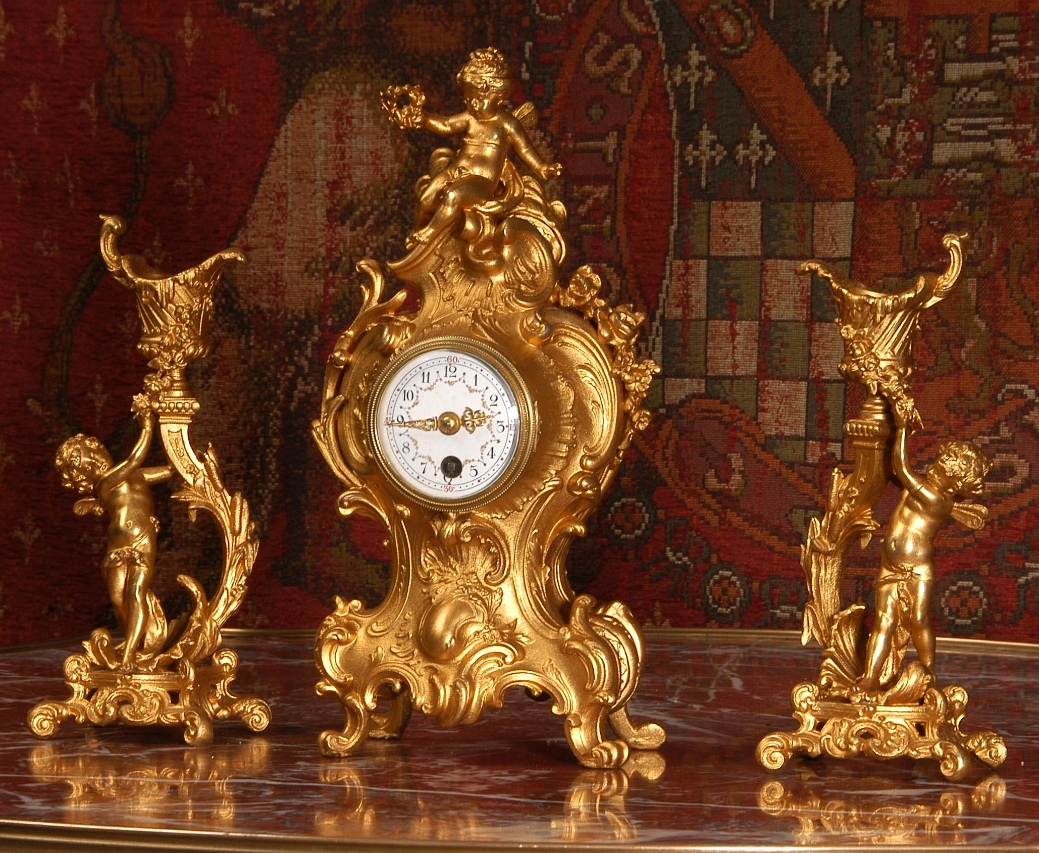 ~ French - Circa 1890 ~ ~~ Excellent condition ~~ A beautiful and rare miniature antique French clock set. It is very nicely made of gilt metal in the Rococo style. The clock is of asymmetric waisted form with elaborate 'C' scrolls, laurel leaves and floral swags. A delightful figure of a cherub holding a laurel wreath sits on top. Candelabra are formed as ewers held aloft on scrolled stands with cherubs standing to the side. The miniature dial is enamel on copper with tiny delicate floral swags painted between the numbers. It is complete with original fretted gilt brass hands and convex glass. The French miniature movement has a cylinder escapement and is of high quality. It is in excellent clean and running condition having been fully serviced by our clockmaker and it runs for 8 days on one wind. Click the video clip below to hear the bell and watch the clock running! Condition of the case is