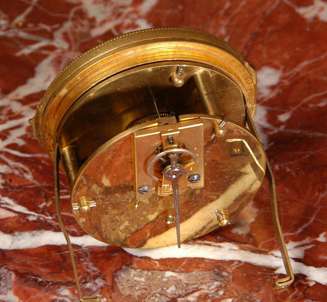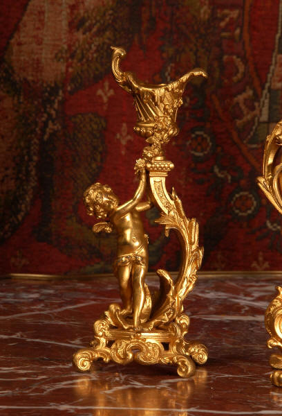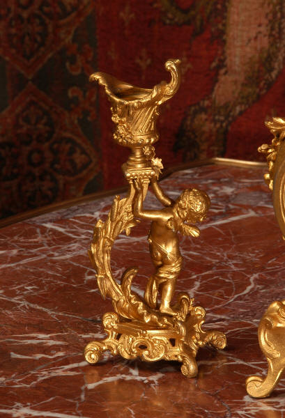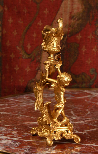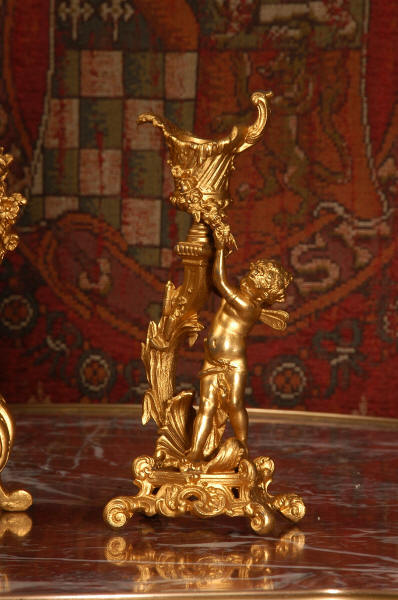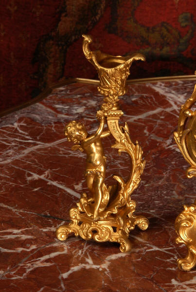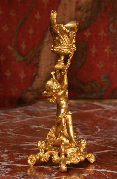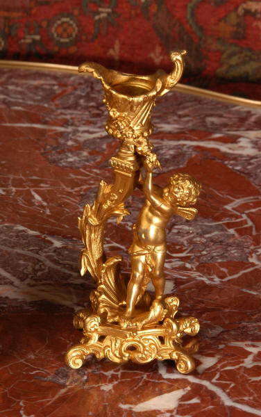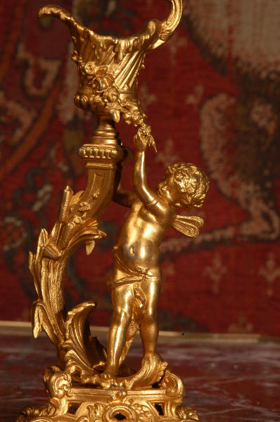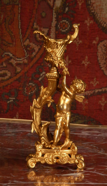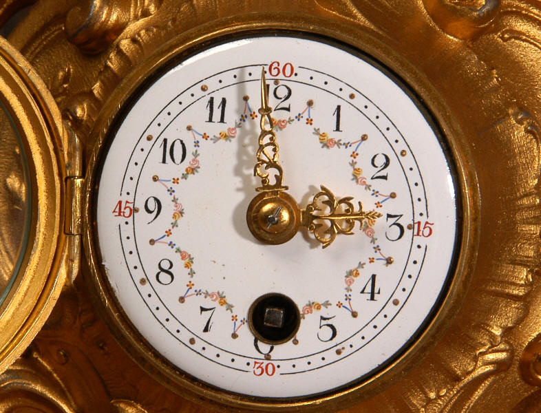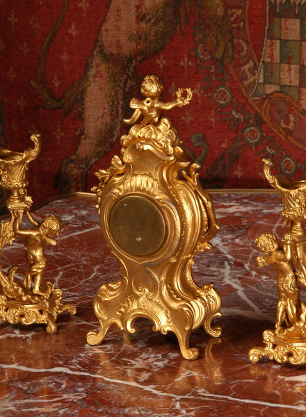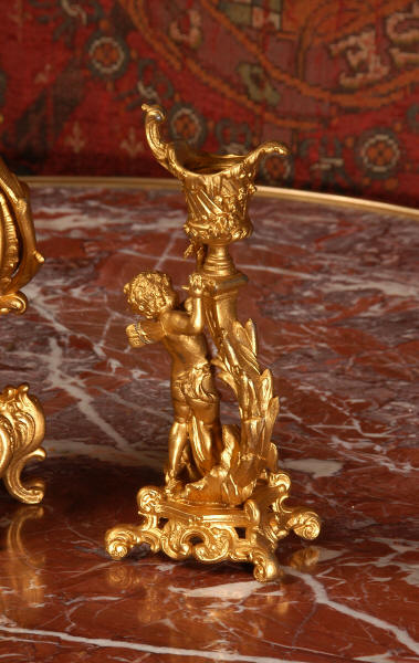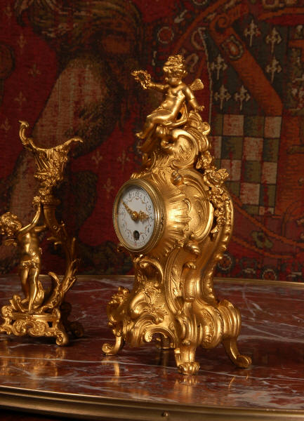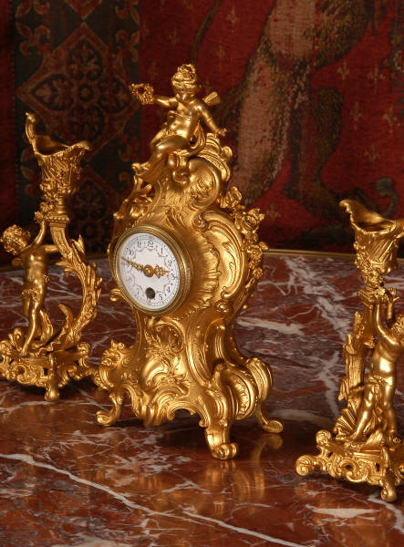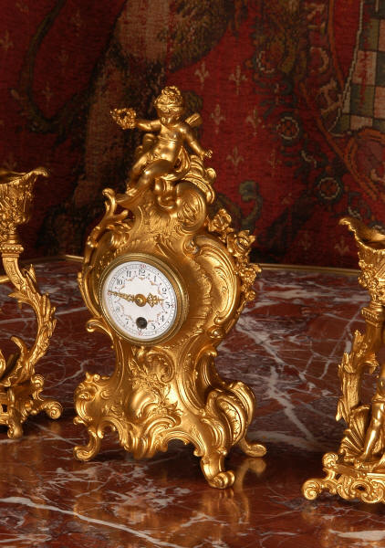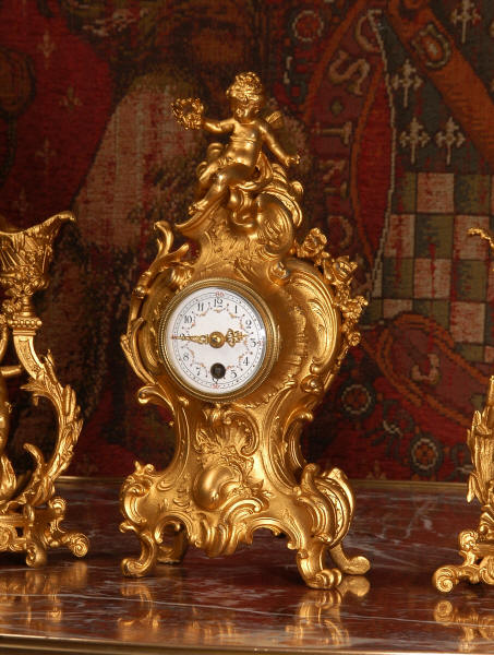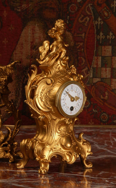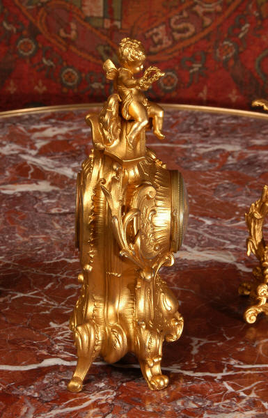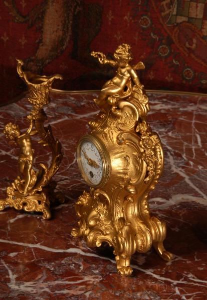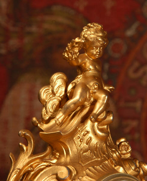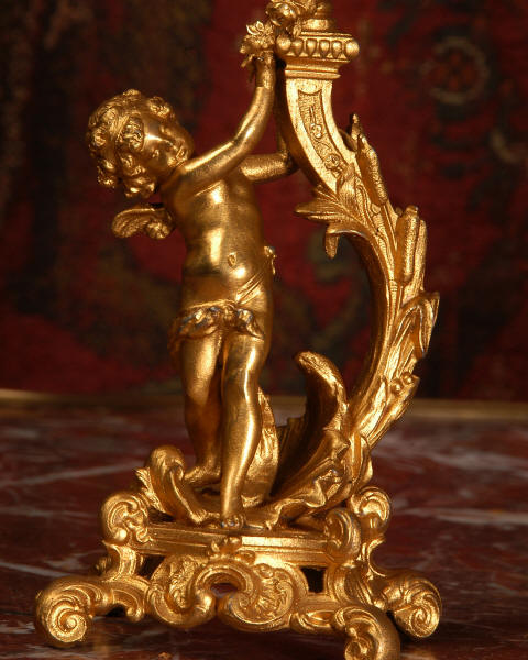 ~ French - Circa 1890 ~ ~~ Excellent condition ~~ A beautiful and rare miniature antique French clock set. It is very nicely made of gilt metal in the Rococo style. The clock is of asymmetric waisted form with elaborate 'C' scrolls, laurel leaves and floral swags. A delightful figure of a cherub holding a laurel wreath sits on top. Candelabra are formed as ewers held aloft on scrolled stands with cherubs standing to the side. The miniature dial is enamel on copper with tiny delicate floral swags painted between the numbers. It is complete with original fretted gilt brass hands and convex glass. The French miniature movement has a cylinder escapement and is of high quality. It is in excellent clean and running condition having been fully serviced by our clockmaker and it runs for 8 days on one wind. Click the video clip below to hear the bell and watch the clock running! Condition of the case is