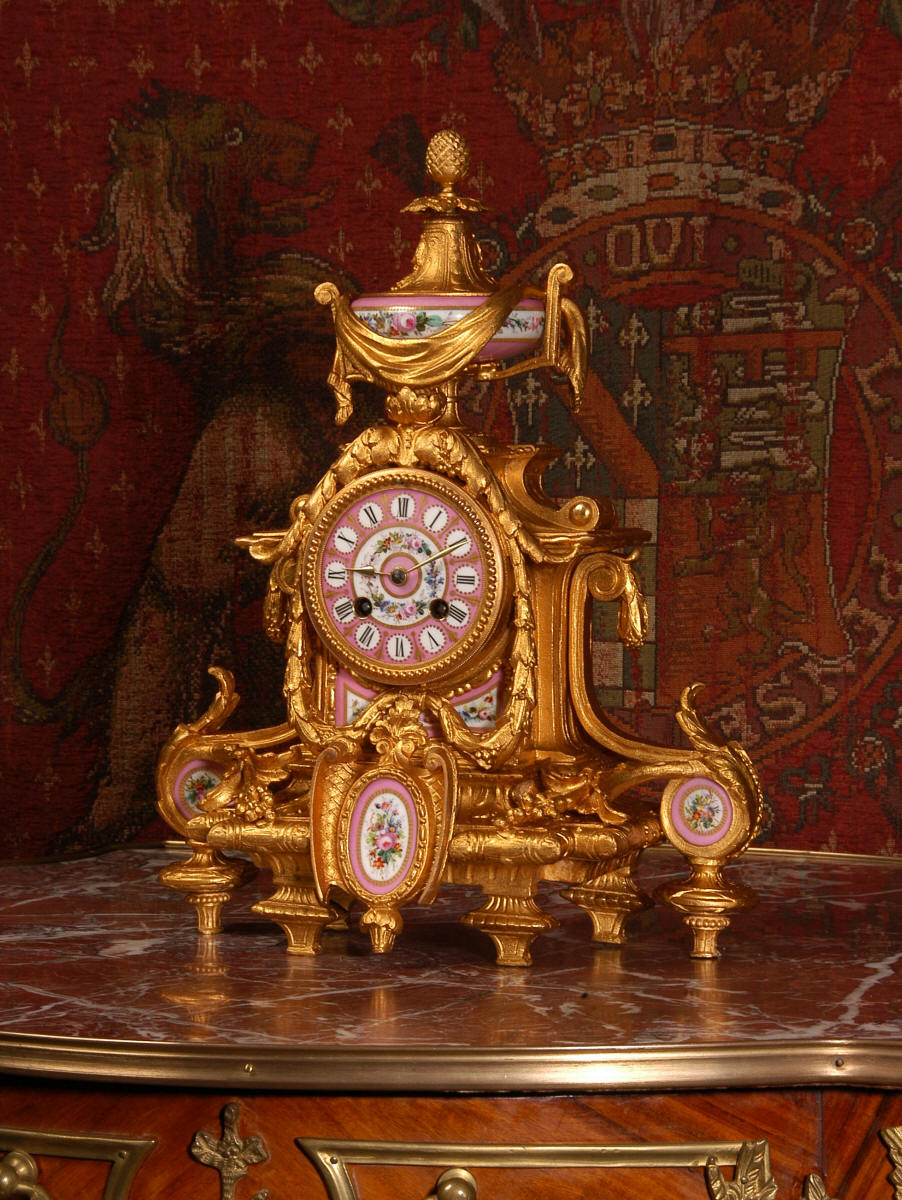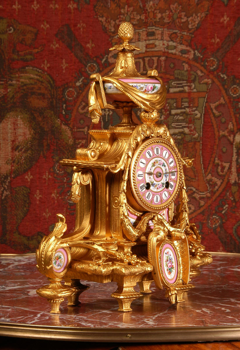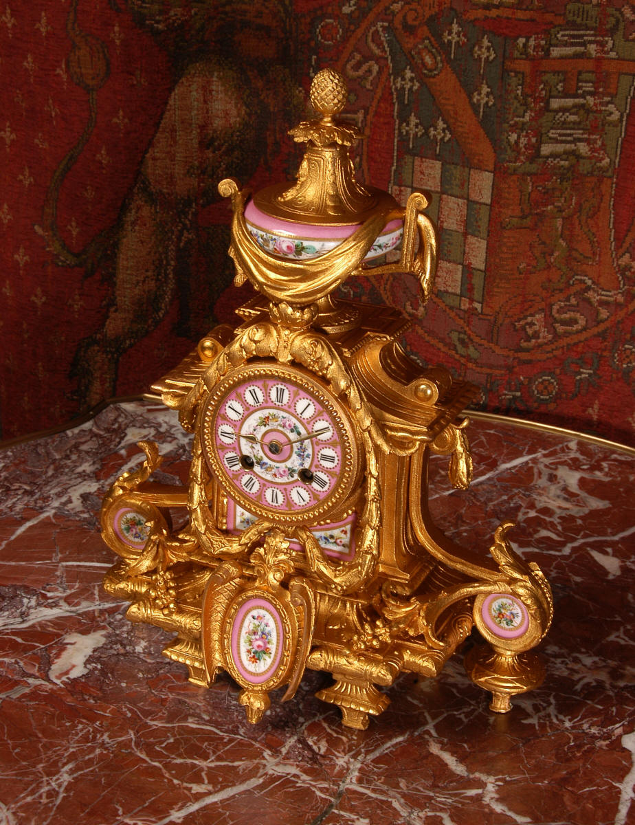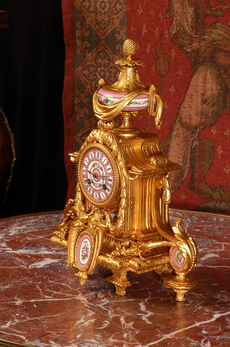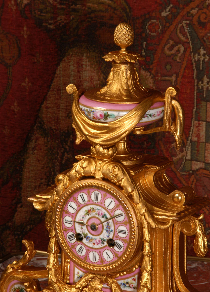 A beautiful antique French boudoir clock of gilt metal mounted with exquisitely painted Sevres style porcelain. Porcelain has a beautiful Pompadour Rose pink ground and each piece is delicately decorated with floral swags and over glaze gilt decoration. To the top of the case is an elaborate porcelain urn with gilt swags. The rear of the case is signed for the case maker 'Brunfaut' (see pictures below)