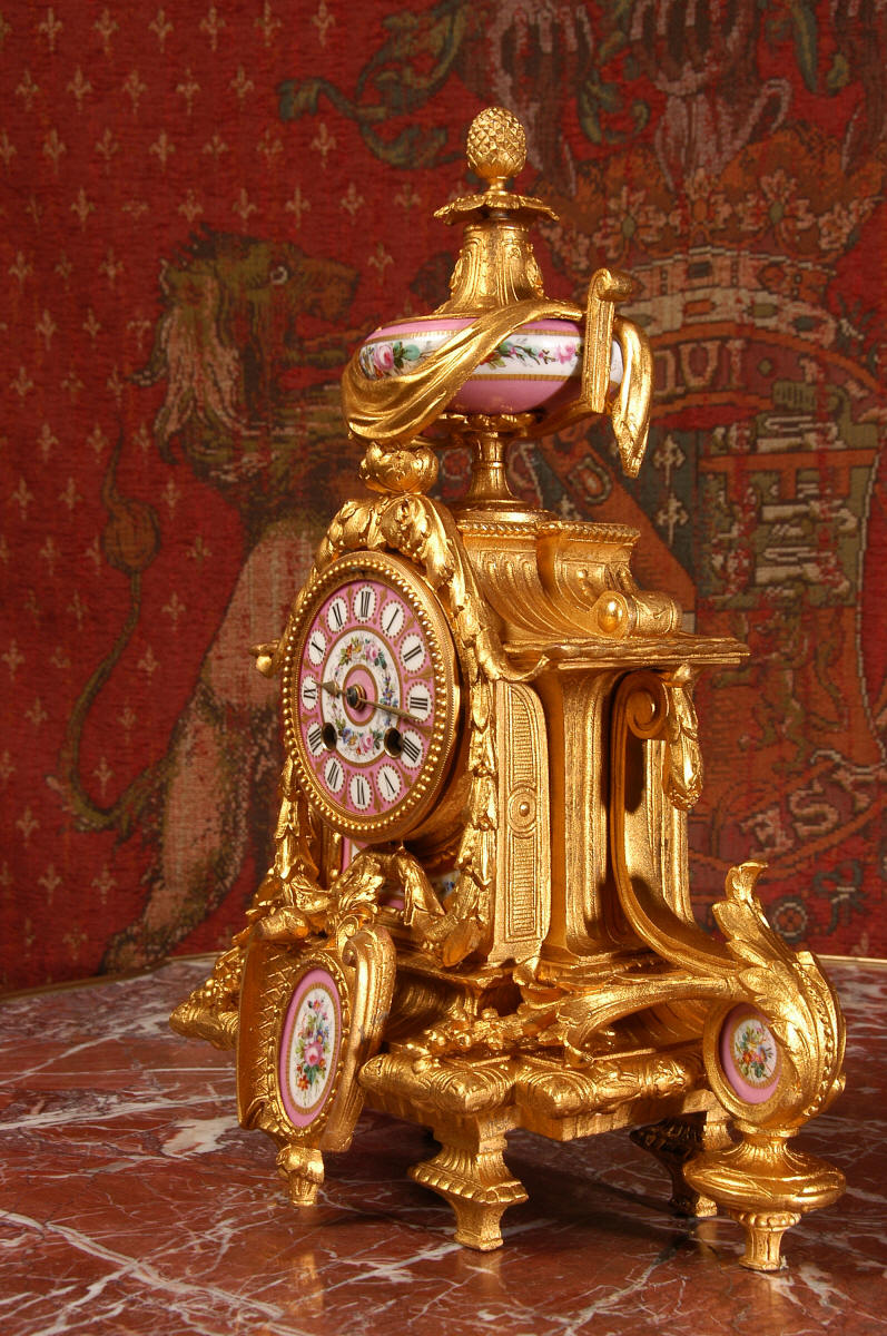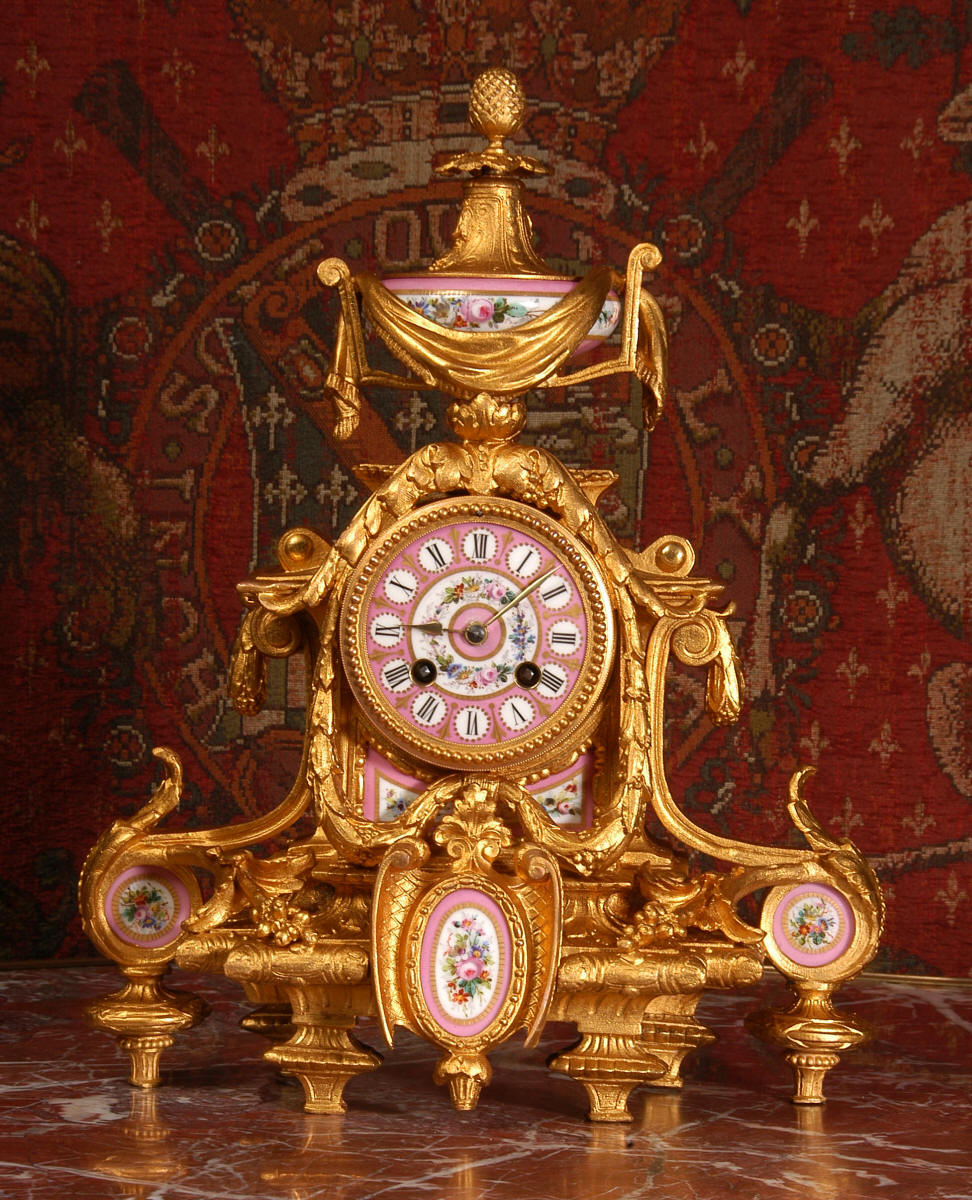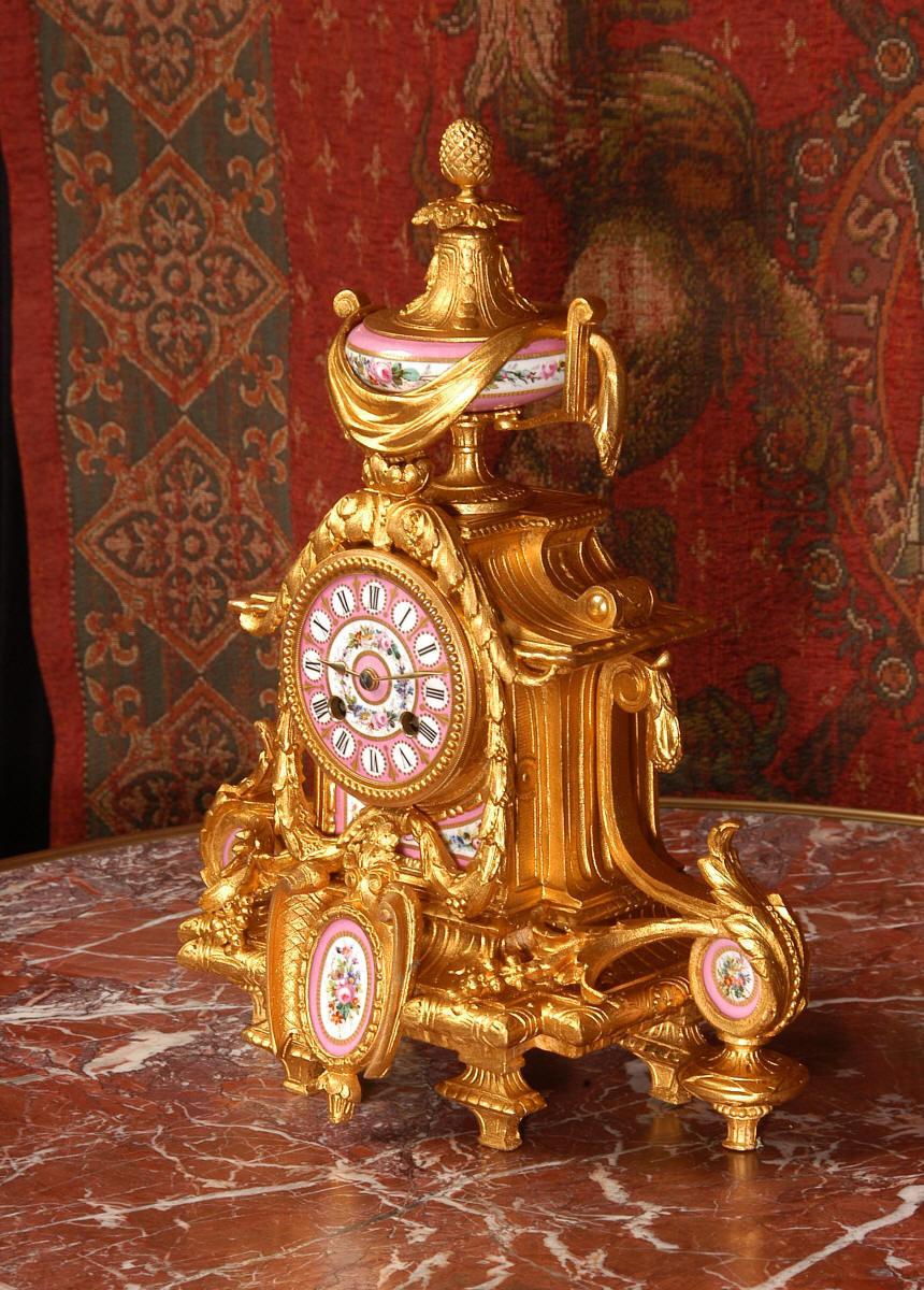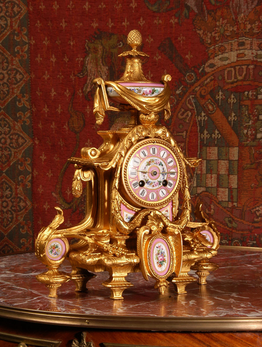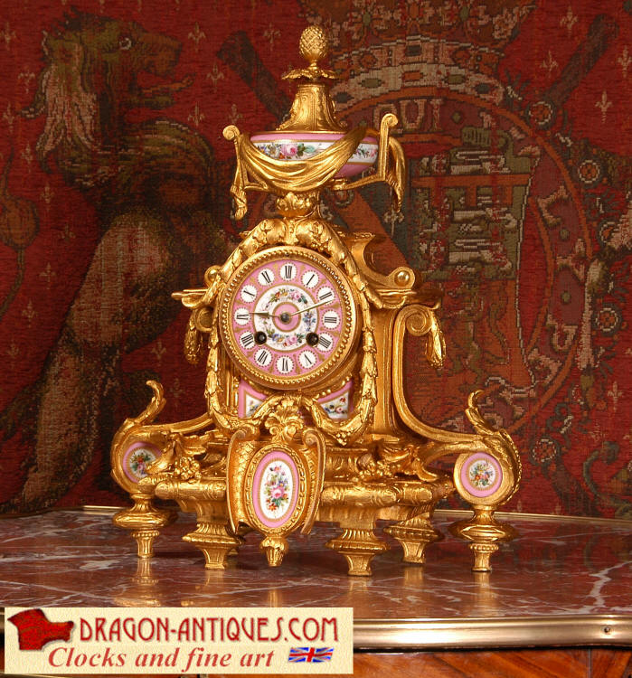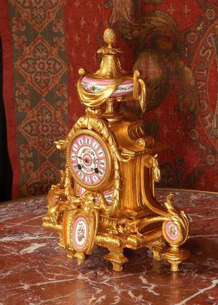 A beautiful antique French boudoir clock of gilt metal mounted with exquisitely painted Sevres style porcelain. Porcelain has a beautiful Pompadour Rose pink ground and each piece is delicately decorated with floral swags and over glaze gilt decoration. To the top of the case is an elaborate porcelain urn with gilt swags. The rear of the case is signed for the case maker 'Brunfaut' (see pictures below)