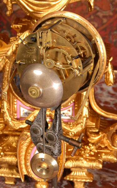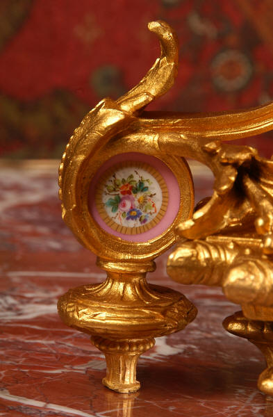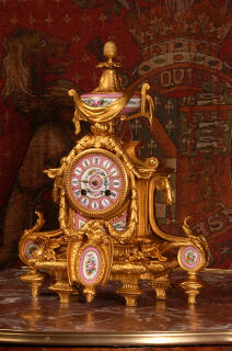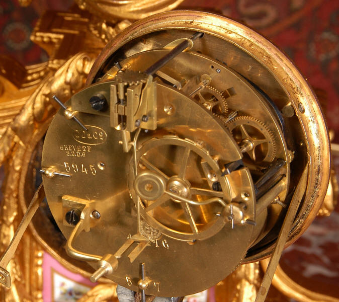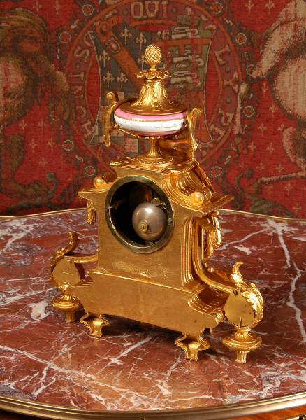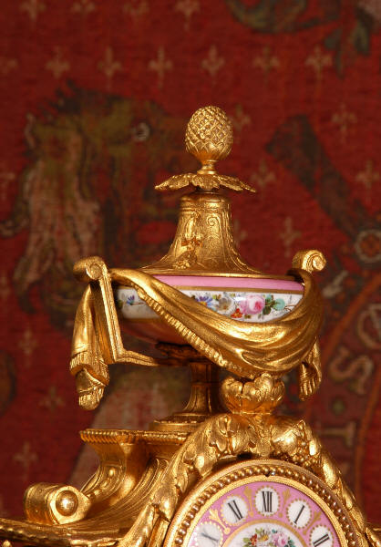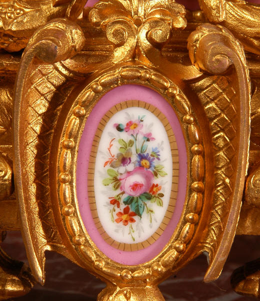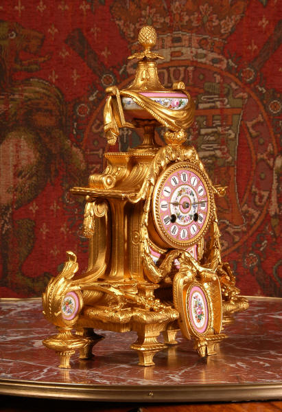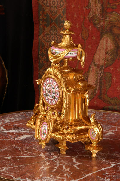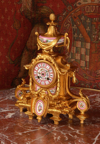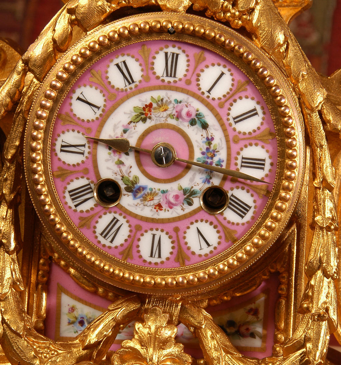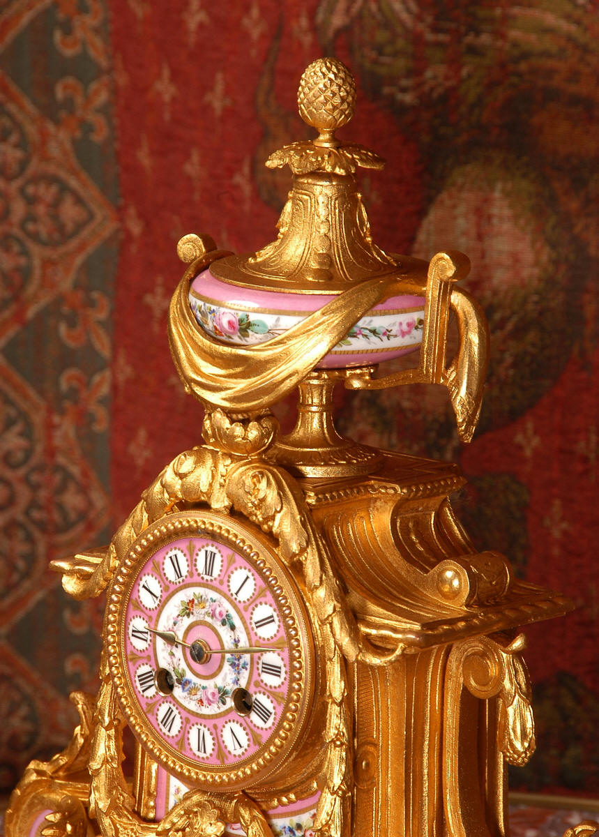 A beautiful antique French boudoir clock of gilt metal mounted with exquisitely painted Sevres style porcelain. Porcelain has a beautiful Pompadour Rose pink ground and each piece is delicately decorated with floral swags and over glaze gilt decoration. To the top of the case is an elaborate porcelain urn with gilt swags. The rear of the case is signed for the case maker 'Brunfaut' (see pictures below)