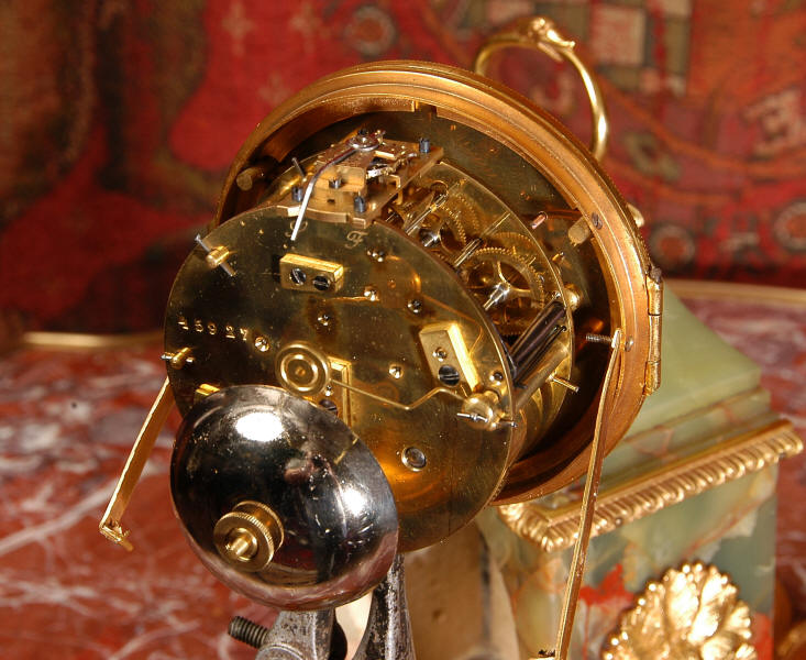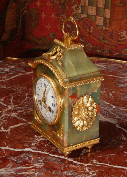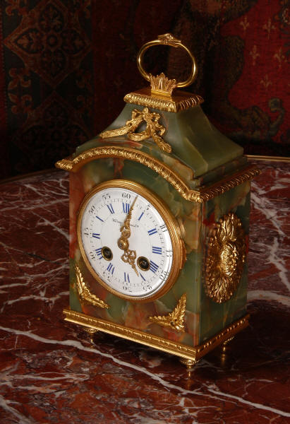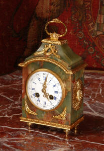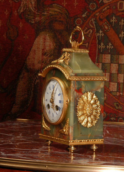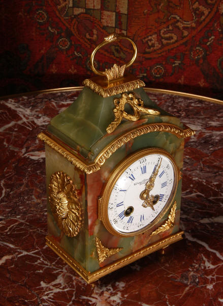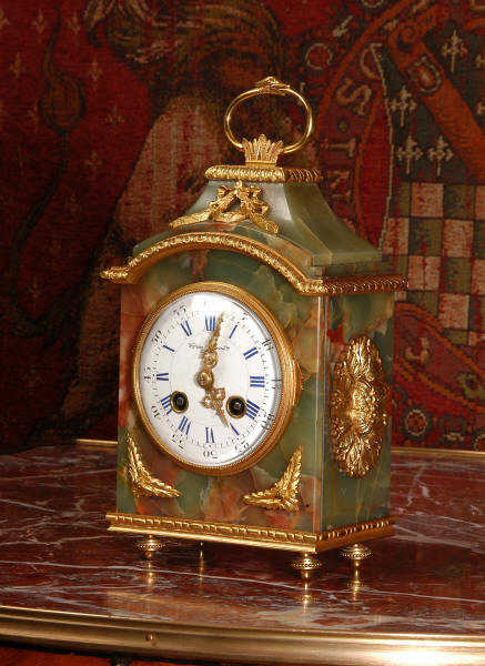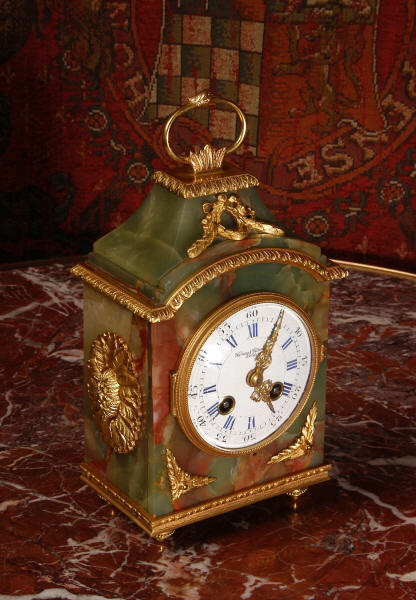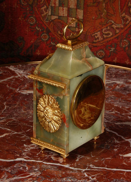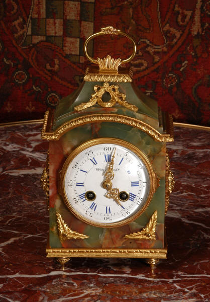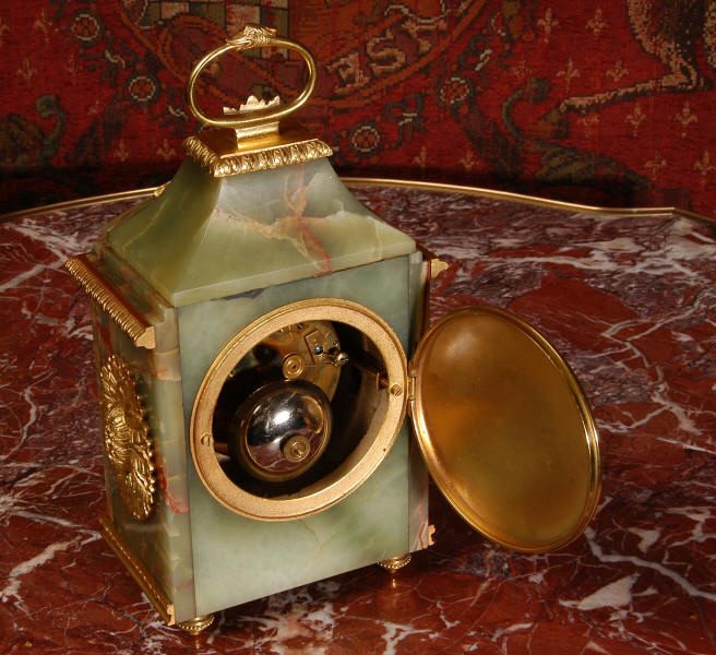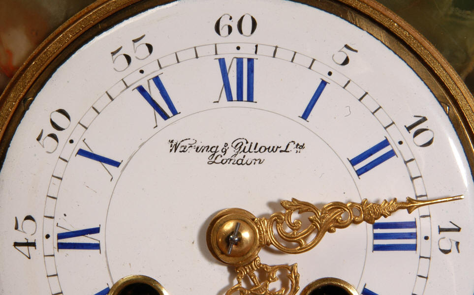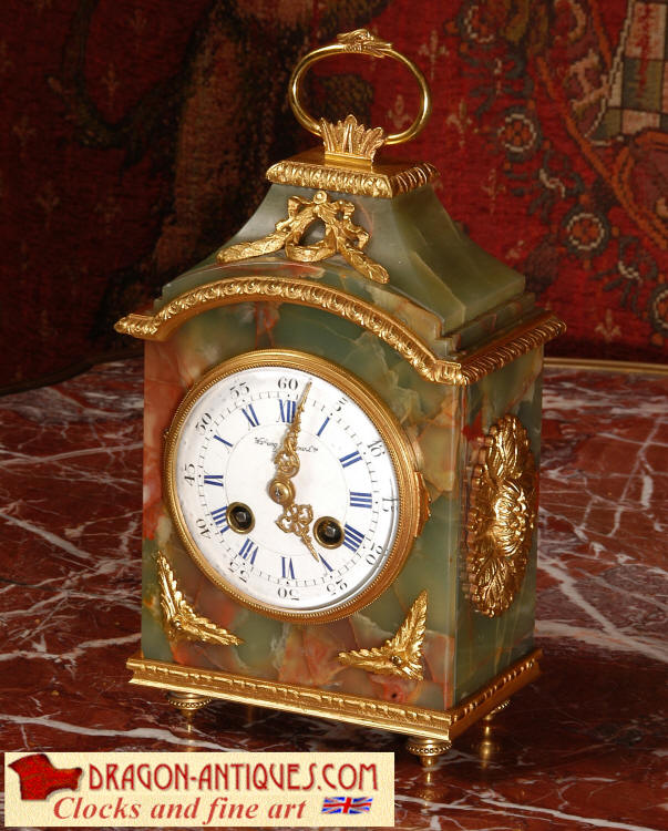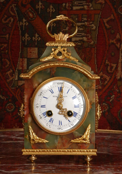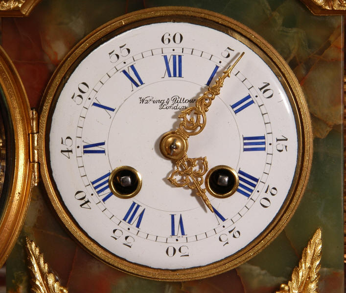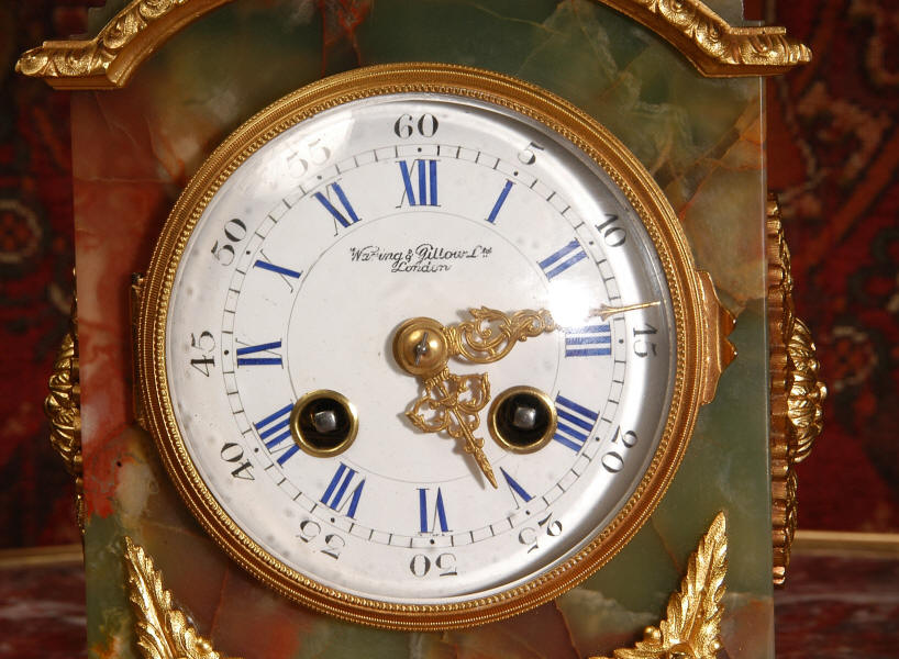~ French - Circa 1900 ~ ~~ Excellent condition ~~ A small and beautifully chic original antique French Louis XVI style 'Pendule D'Officier, retailed by the famous firm of Waring and Gillow. It of excellent quality and is made of the most stunning variegated green onyx mounted with fine ormolu (finely gilded brass) mounts. The dial is lettered in blue on a cream enamel ground on copper and has the Waring and Gillow signature. It is fitted with original delicately fretted brass hands and convex glass bezel. The handle is a depiction of Ouroboros, the serpent eating its own tail, a symbol of the continuity of life in mythology. The French movement is of excellent quality and has a platform escapement - no pendulum to set up. It has been fully overhauled by our clockmaker, runs for 8 days and strikes the hours and halves on a bell, click the movie below to see and hear the movement! The finish of the ormolu is excellent, bright
